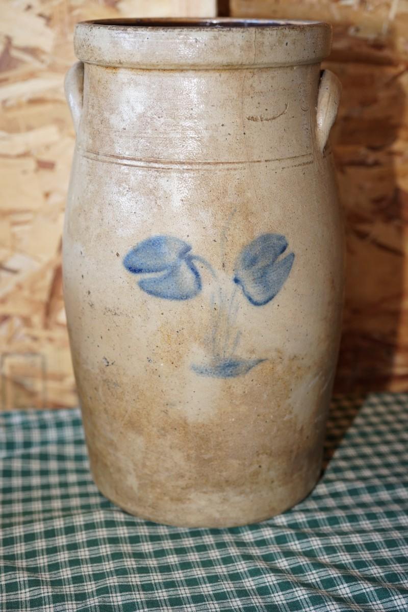 19TH CENTURY STONEWARE WITH BLUE COBALT DECORATION / CHURN AND 2 GALLON CROCK