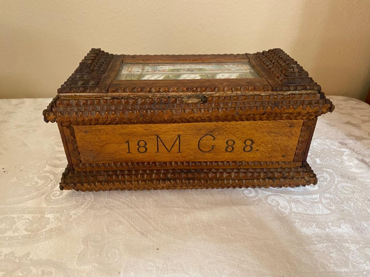 Wonderful, 19th century “Tramp Art” box, dated 1888. 10-1/4e x 5-1/2d x 5-1/2h. Nice piece of American Folk Art