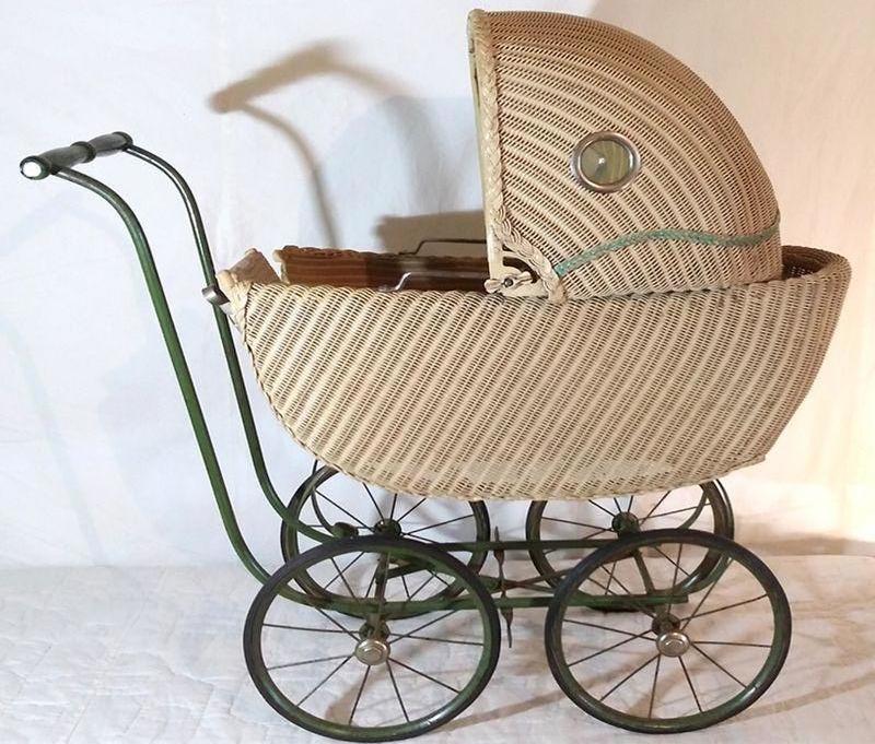 Wicker Baby Buggy, Footboard lays flat, rubber tires, see thru-holes on sides, J.C. Penney 231-B-7 Mary Lou Plaything good condition