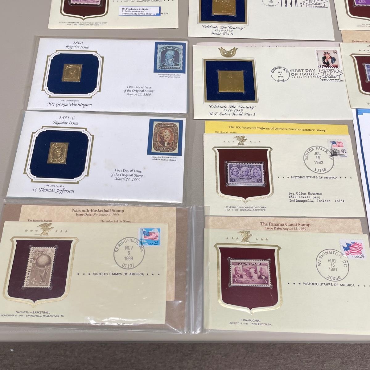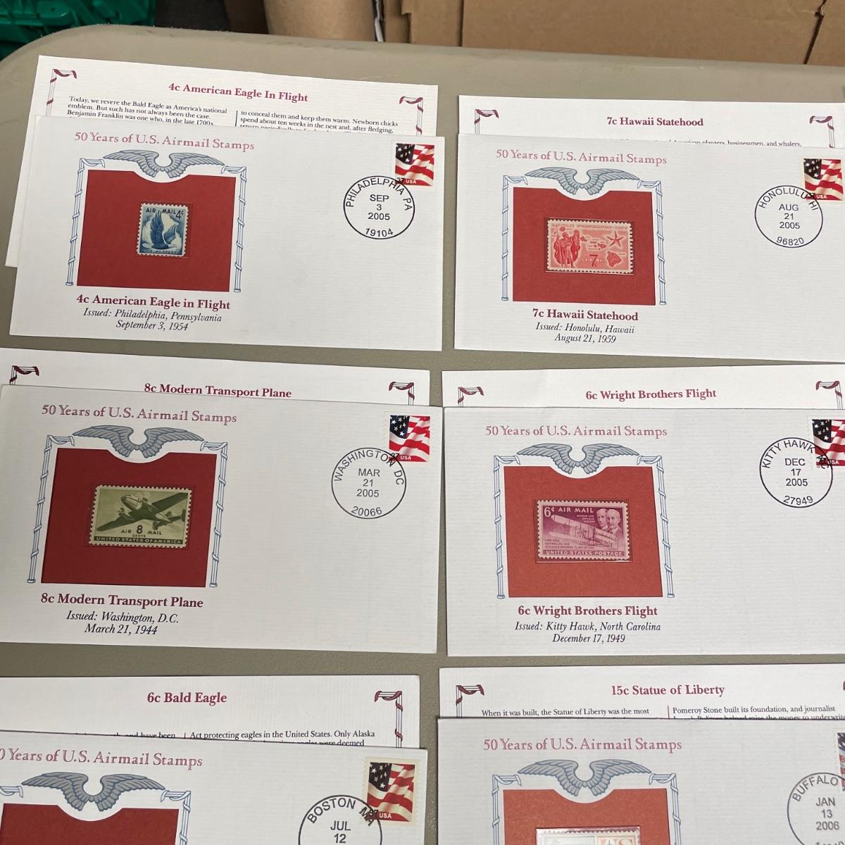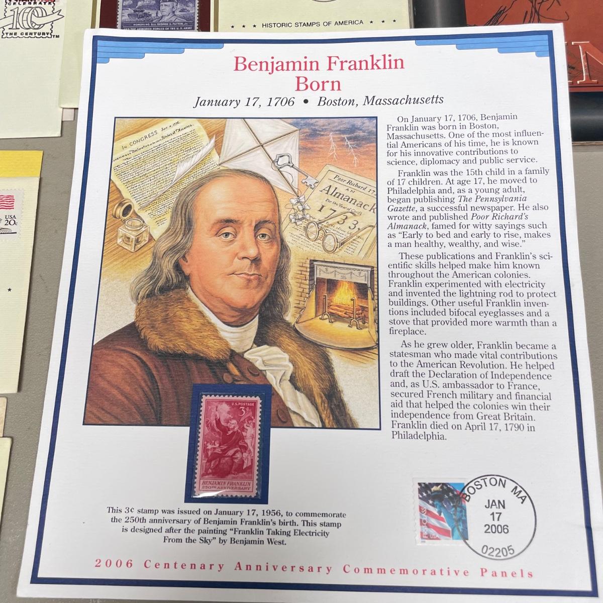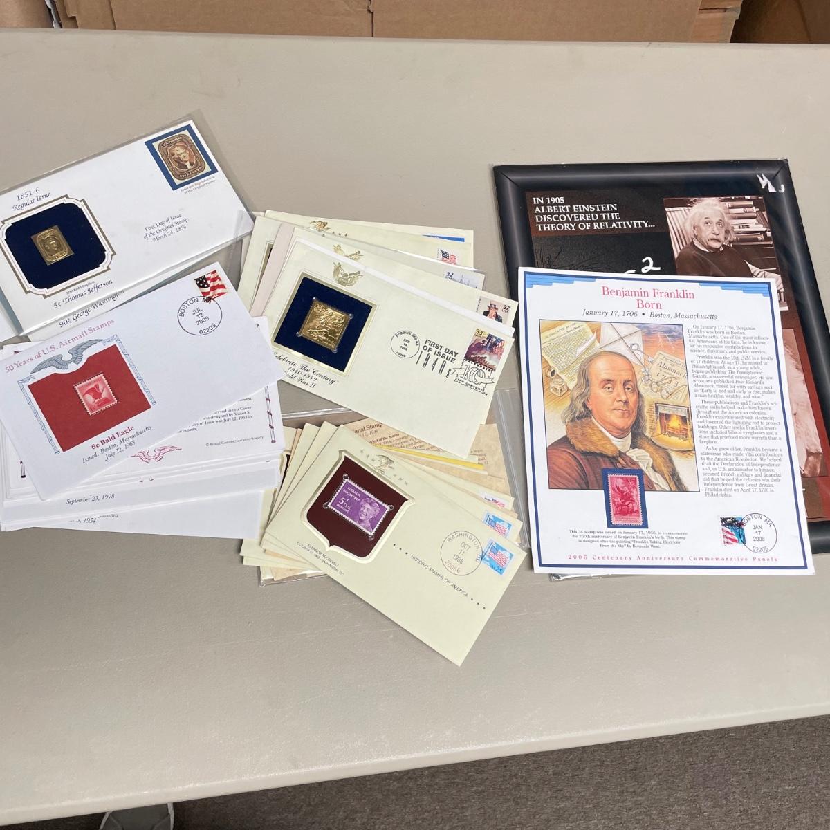 Six 1st day issues with gold replica stamps, eight envelopes from the 50 Years of US Airmail Stamps and seven from the Historic Stamps of America. Lot also includes a poster with stamp of AlberT Einstein and a 2006 Centenary Anniversary panel of Benjamin Franklin. All sales are final. No returns or refunds. Please bid accordingly. Shipping available.