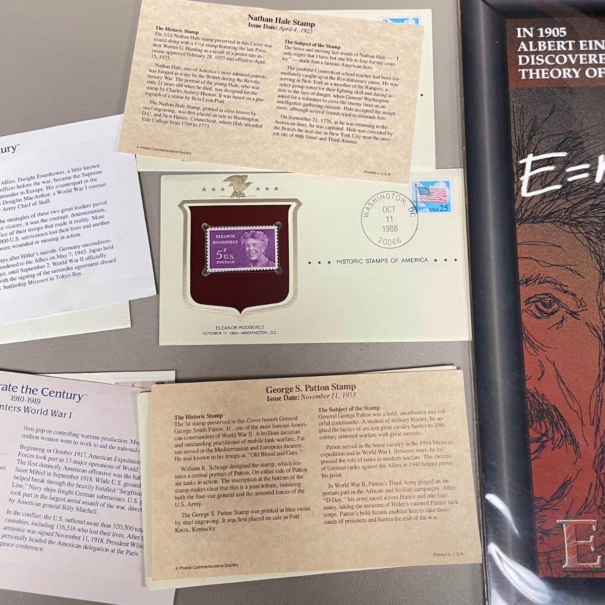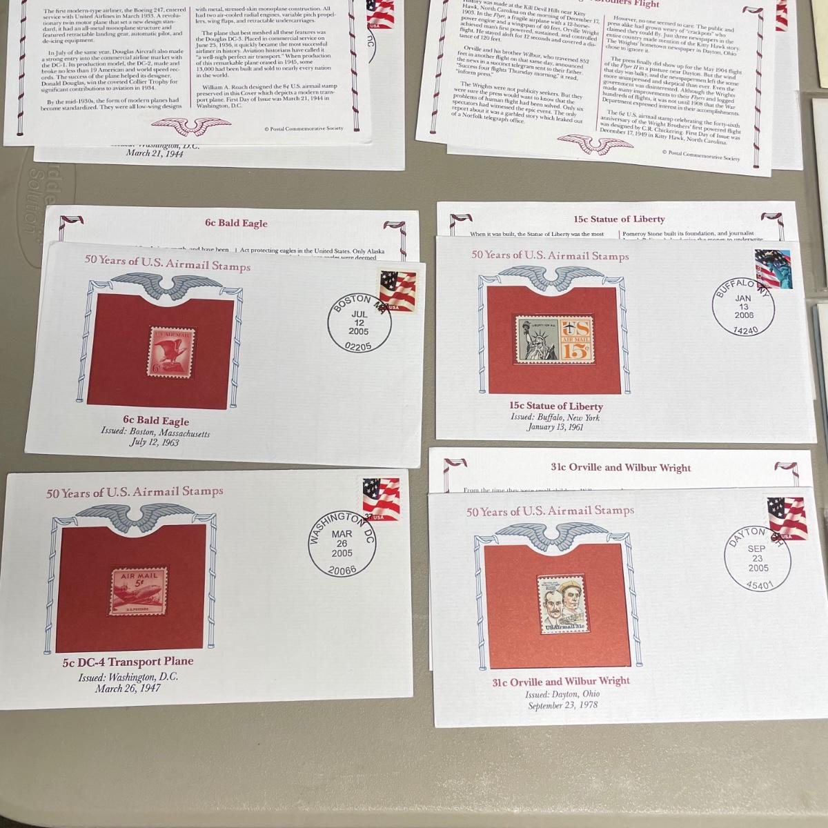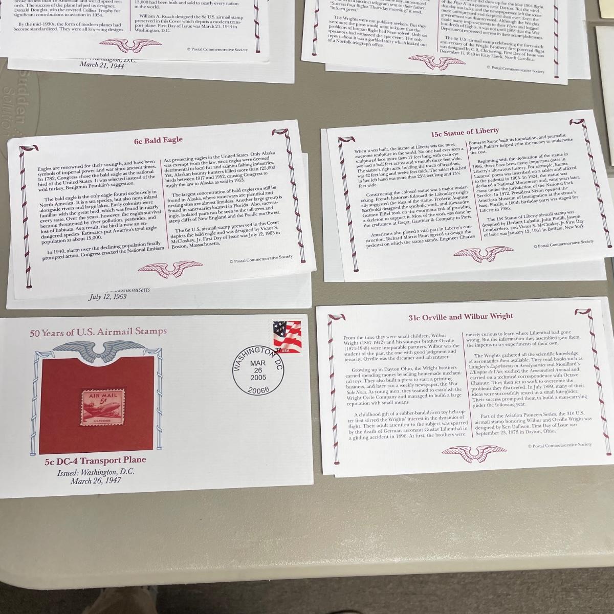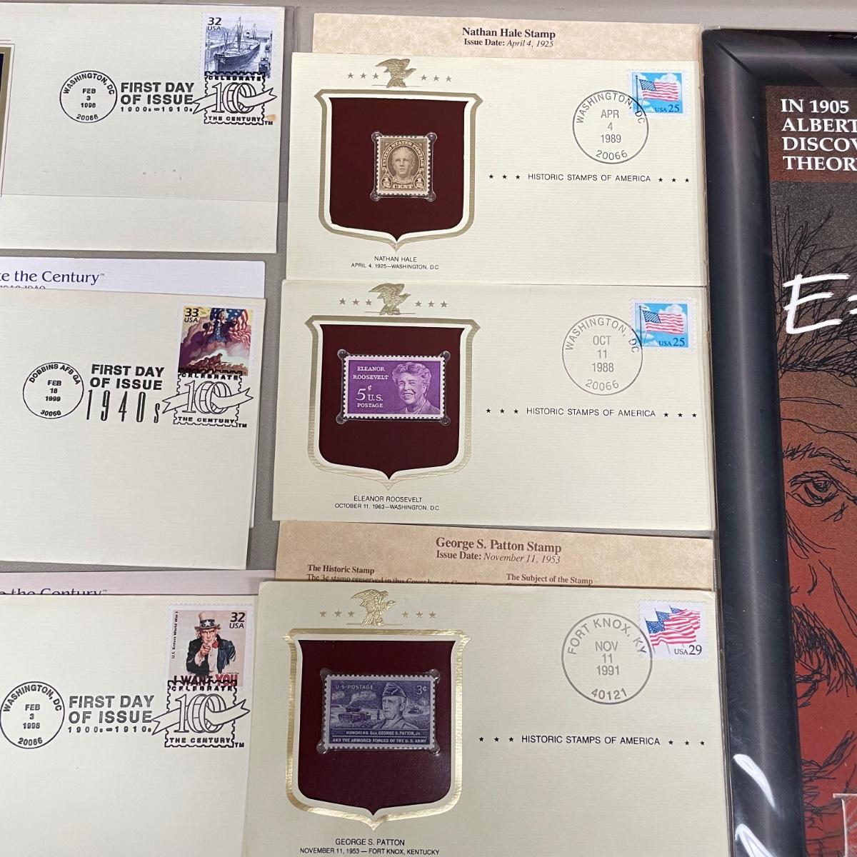 Six 1st day issues with gold replica stamps, eight envelopes from the 50 Years of US Airmail Stamps and seven from the Historic Stamps of America. Lot also includes a poster with stamp of AlberT Einstein and a 2006 Centenary Anniversary panel of Benjamin Franklin. All sales are final. No returns or refunds. Please bid accordingly. Shipping available.