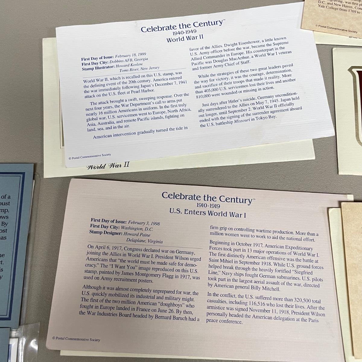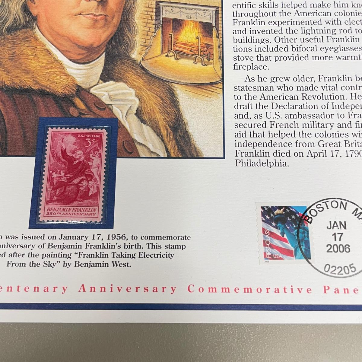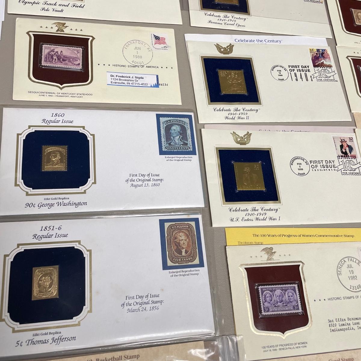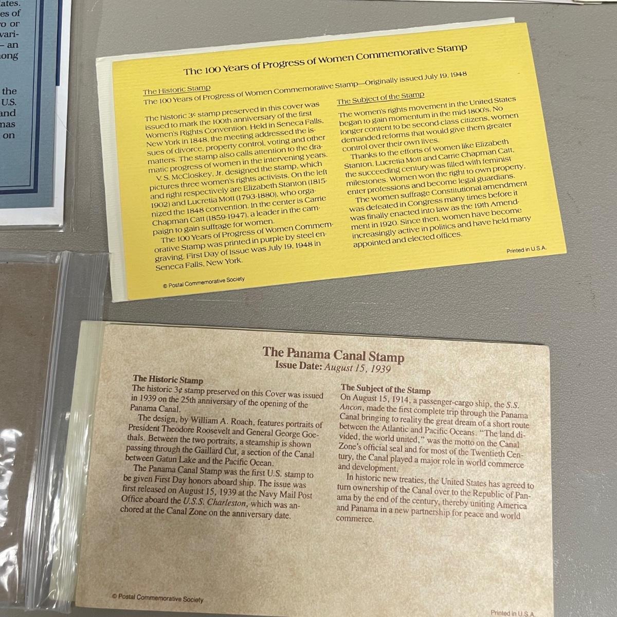 Six 1st day issues with gold replica stamps, eight envelopes from the 50 Years of US Airmail Stamps and seven from the Historic Stamps of America. Lot also includes a poster with stamp of AlberT Einstein and a 2006 Centenary Anniversary panel of Benjamin Franklin. All sales are final. No returns or refunds. Please bid accordingly. Shipping available.