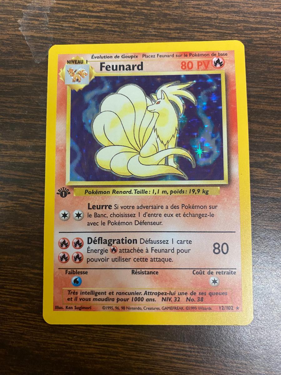This is a 1st Edition Holo Feunard Pokémon card from the Base Set. The card displays a holographic effect and an energy cost of 80 PY for its Deflagration attack. Card condition is classified as light play, with minor wear visible. French-language version with rarity and 1st Edition symbol. Collector No: 12/102. Suitable for collectors and enthusiasts.