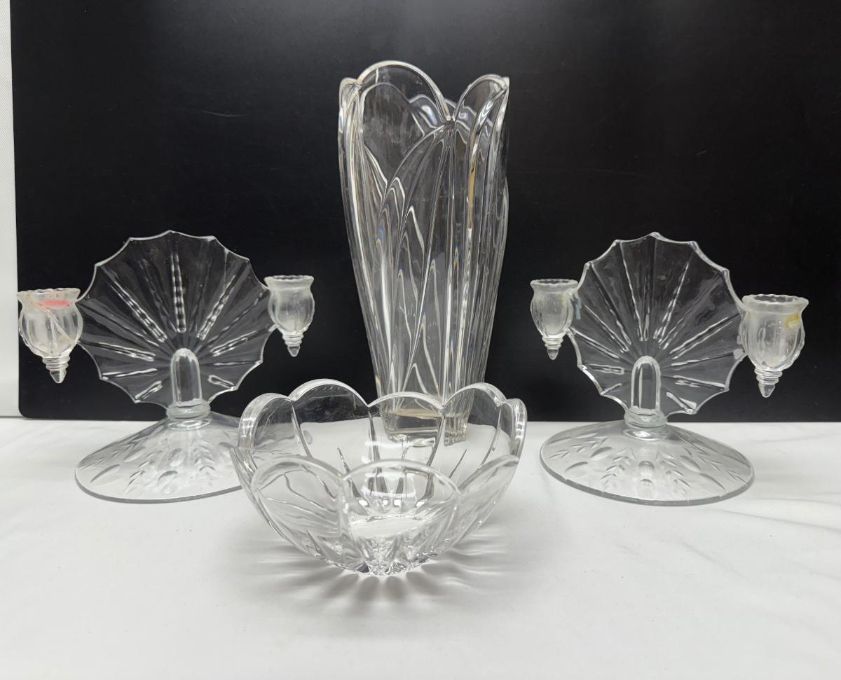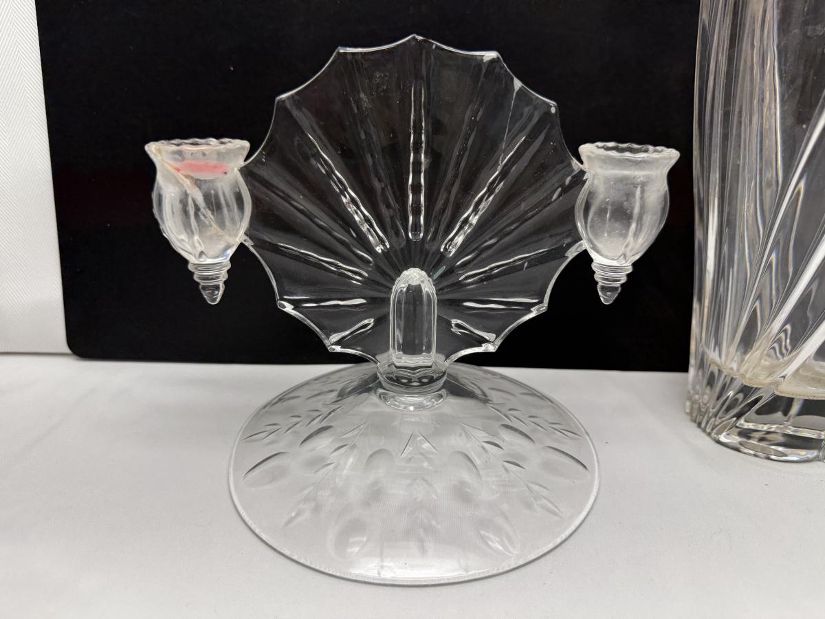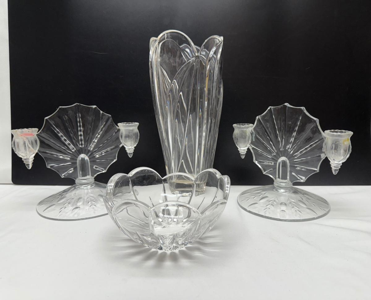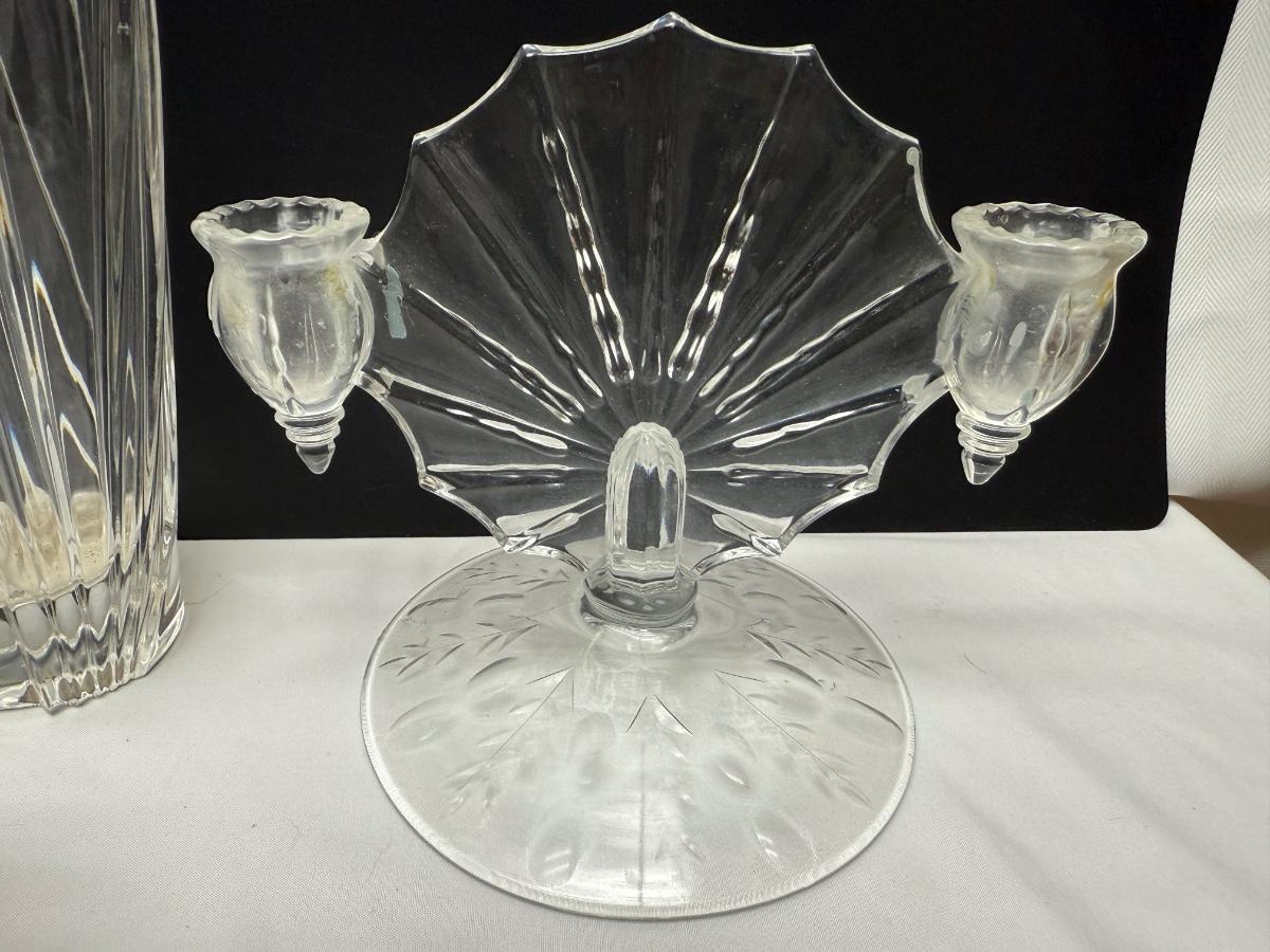2 1930’s New Martinsville Radiance Light Double candle holders, vase, and glass bowl