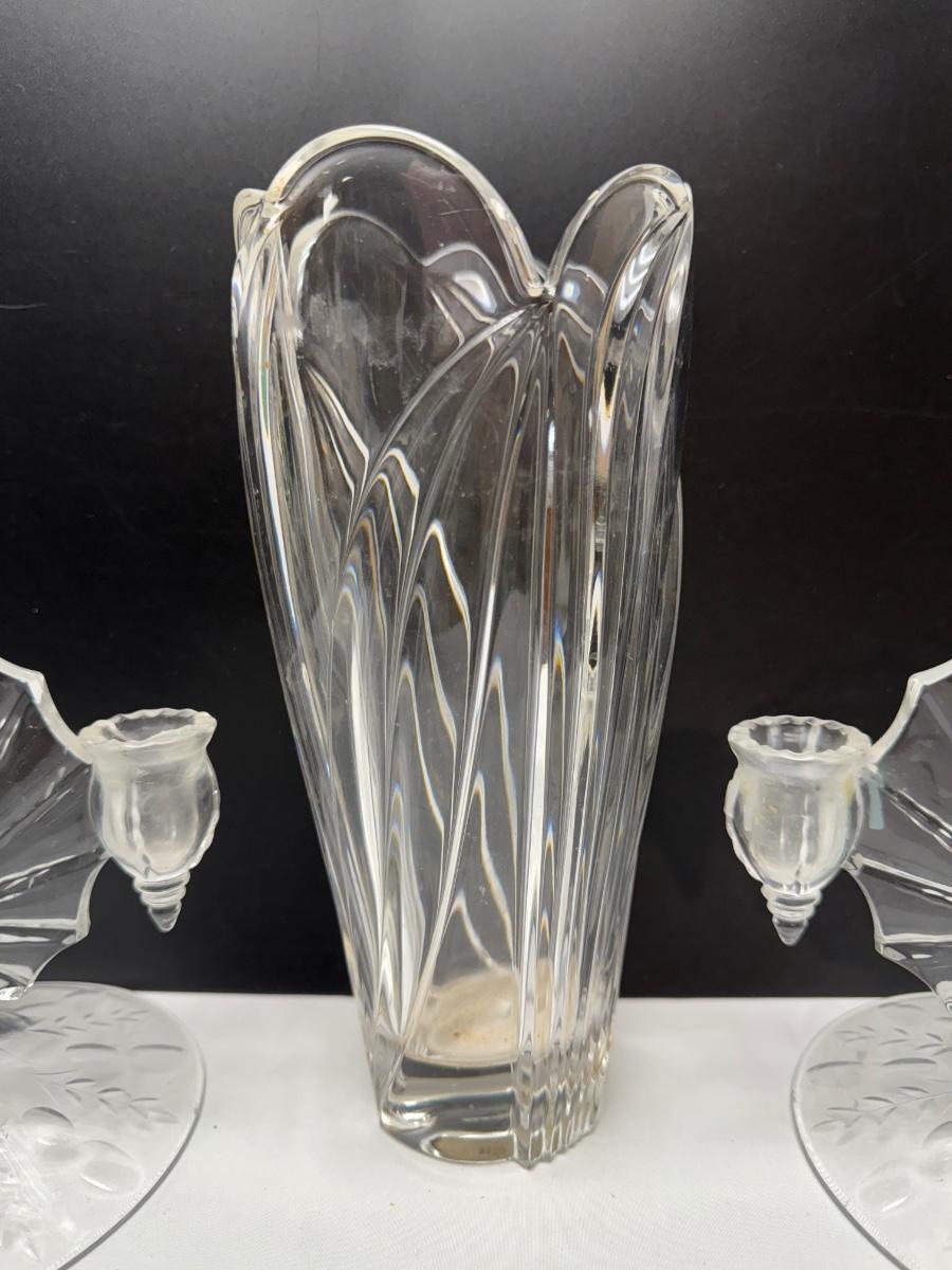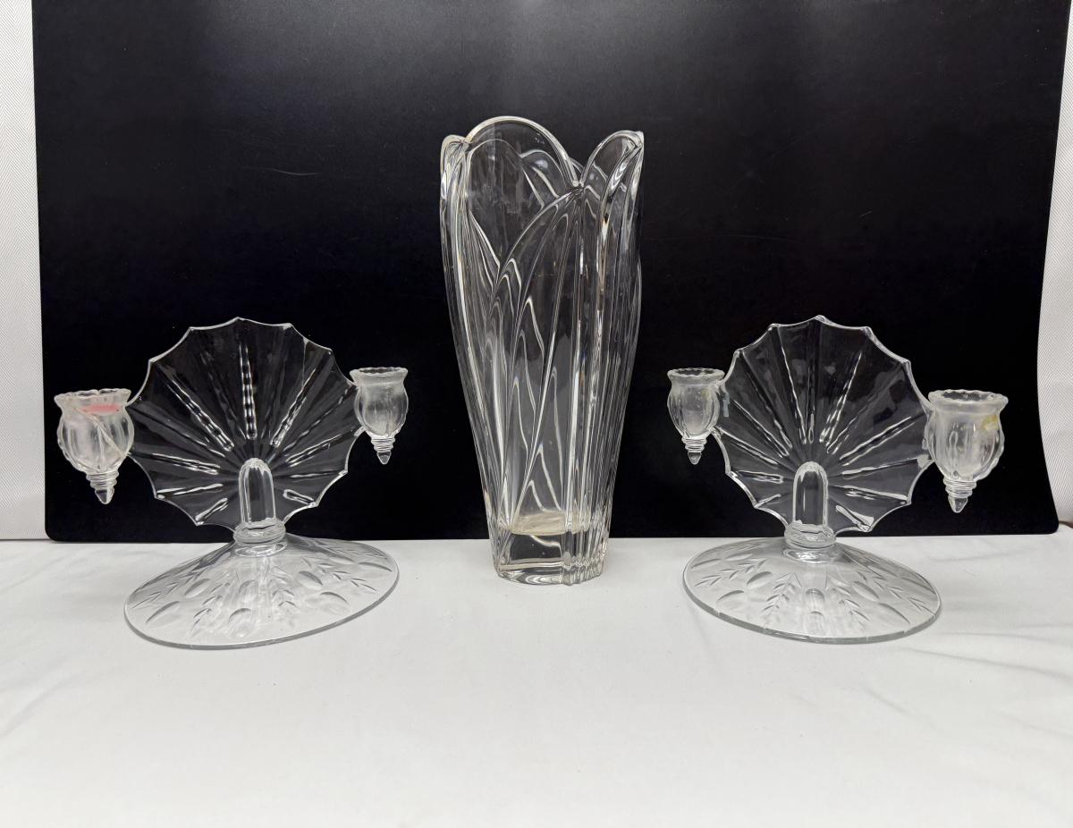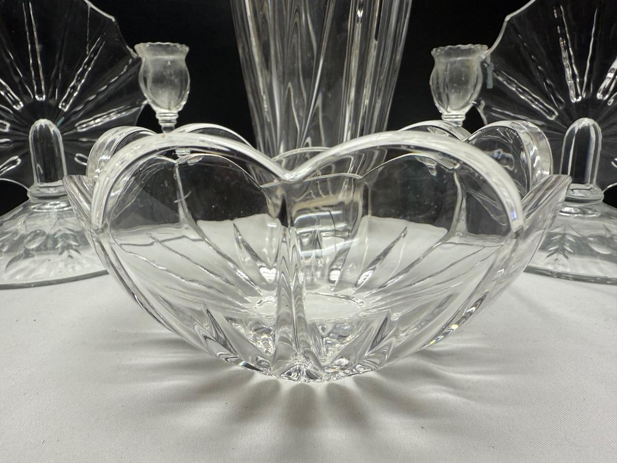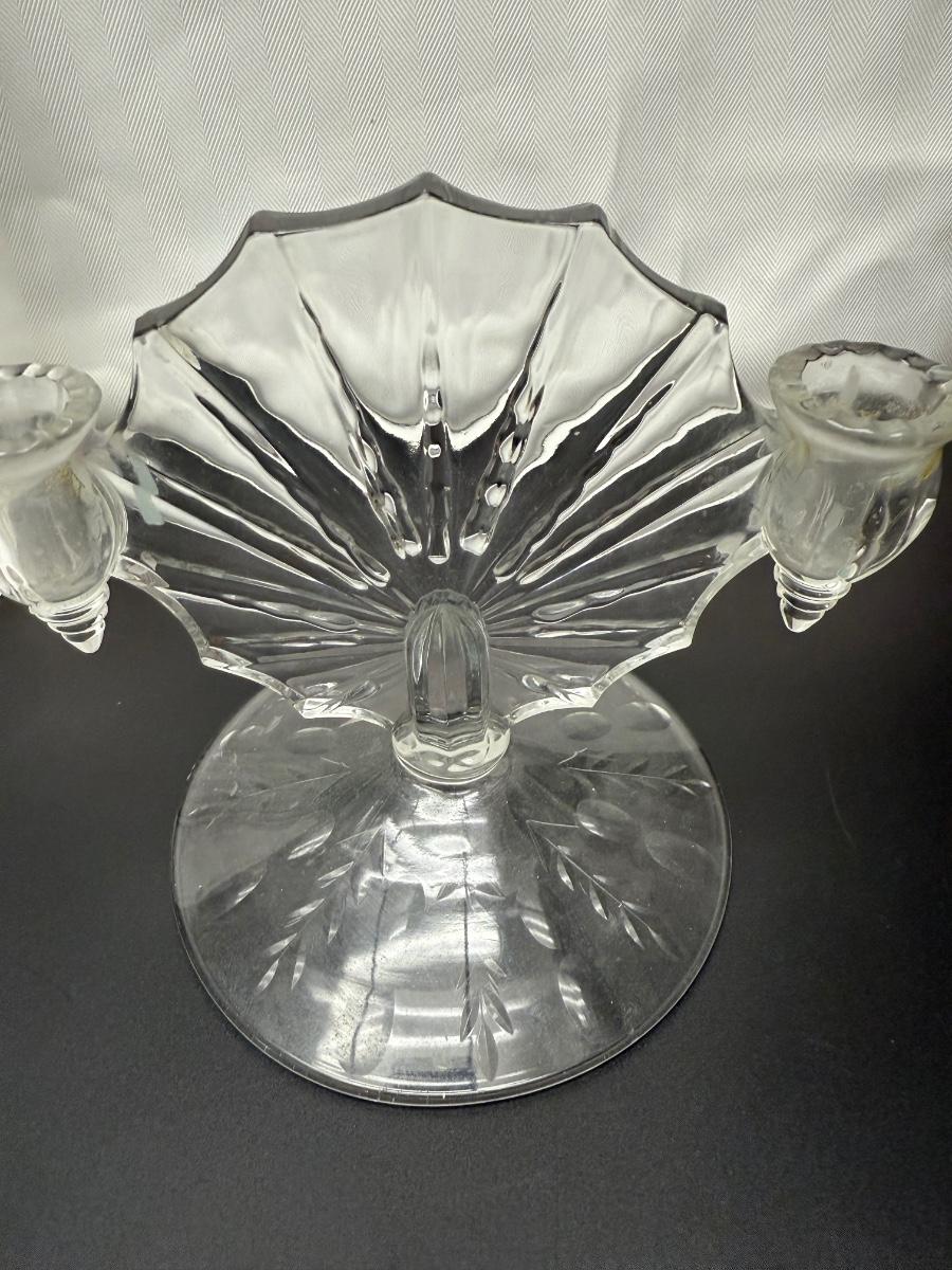 2 1930’s New Martinsville Radiance Light Double candle holders, vase, and glass bowl