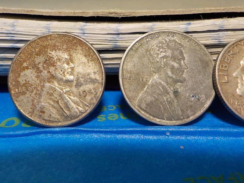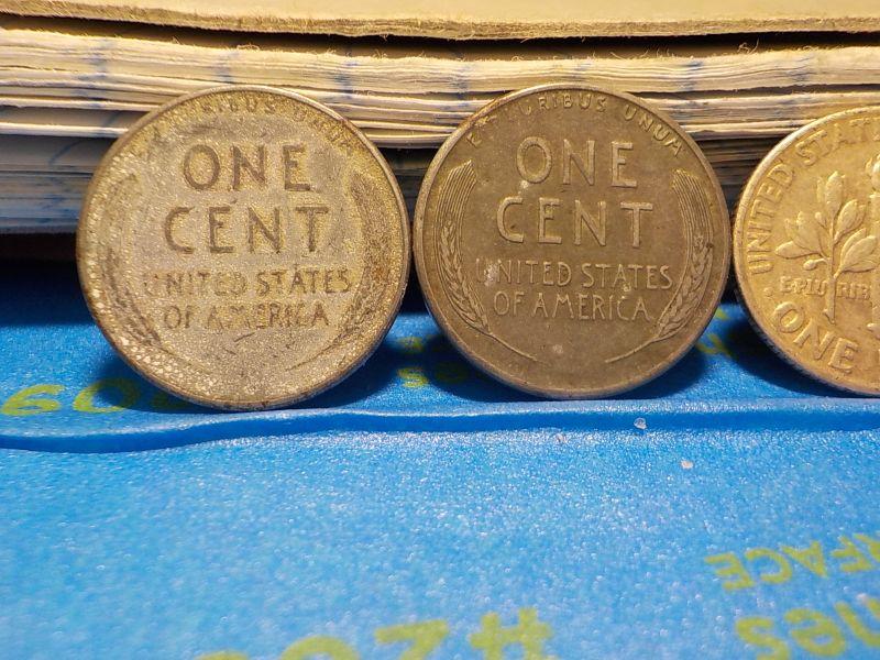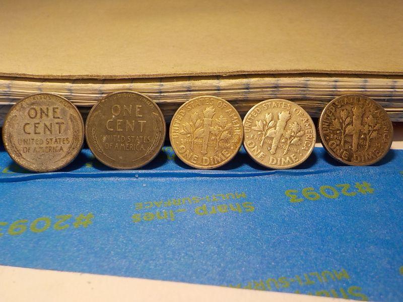 2- 1943 steel pennies and 3- Roosevelt dimes .