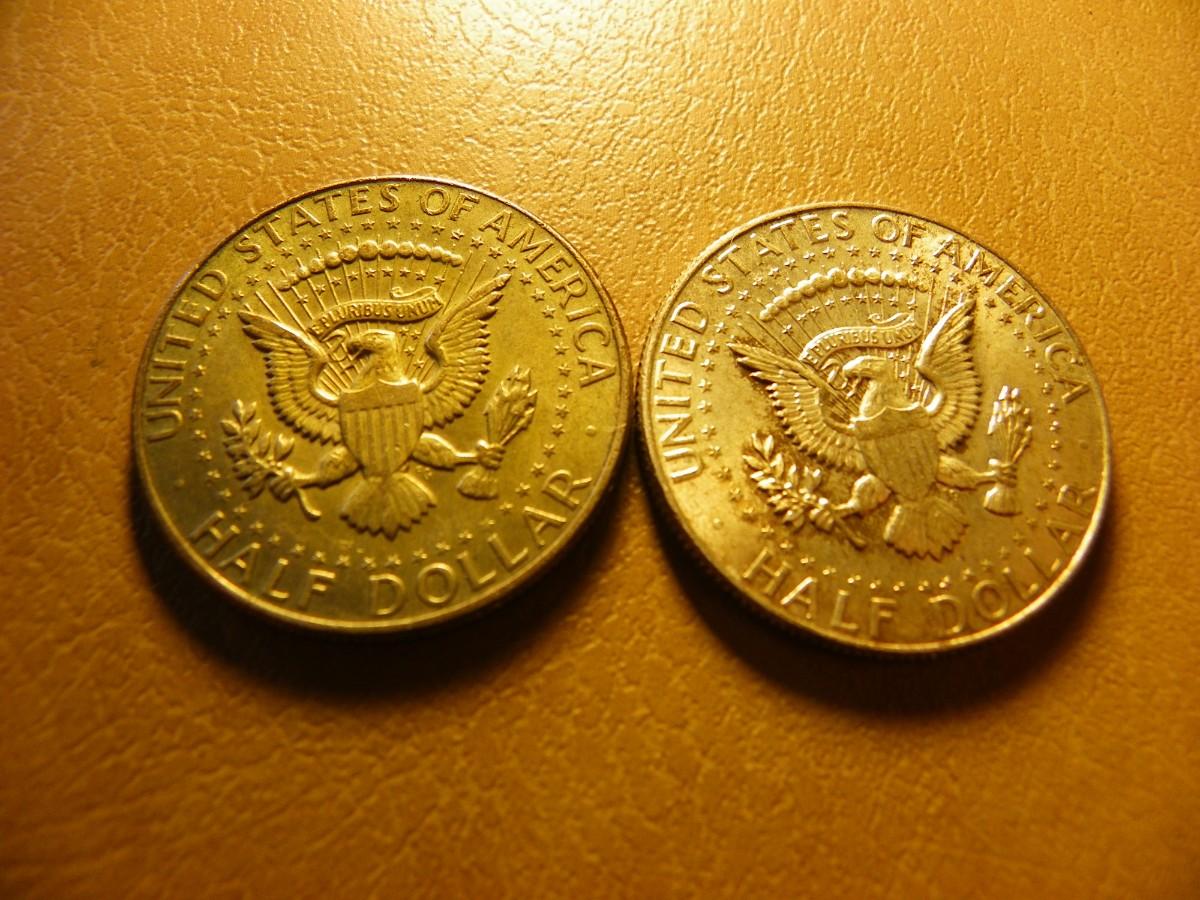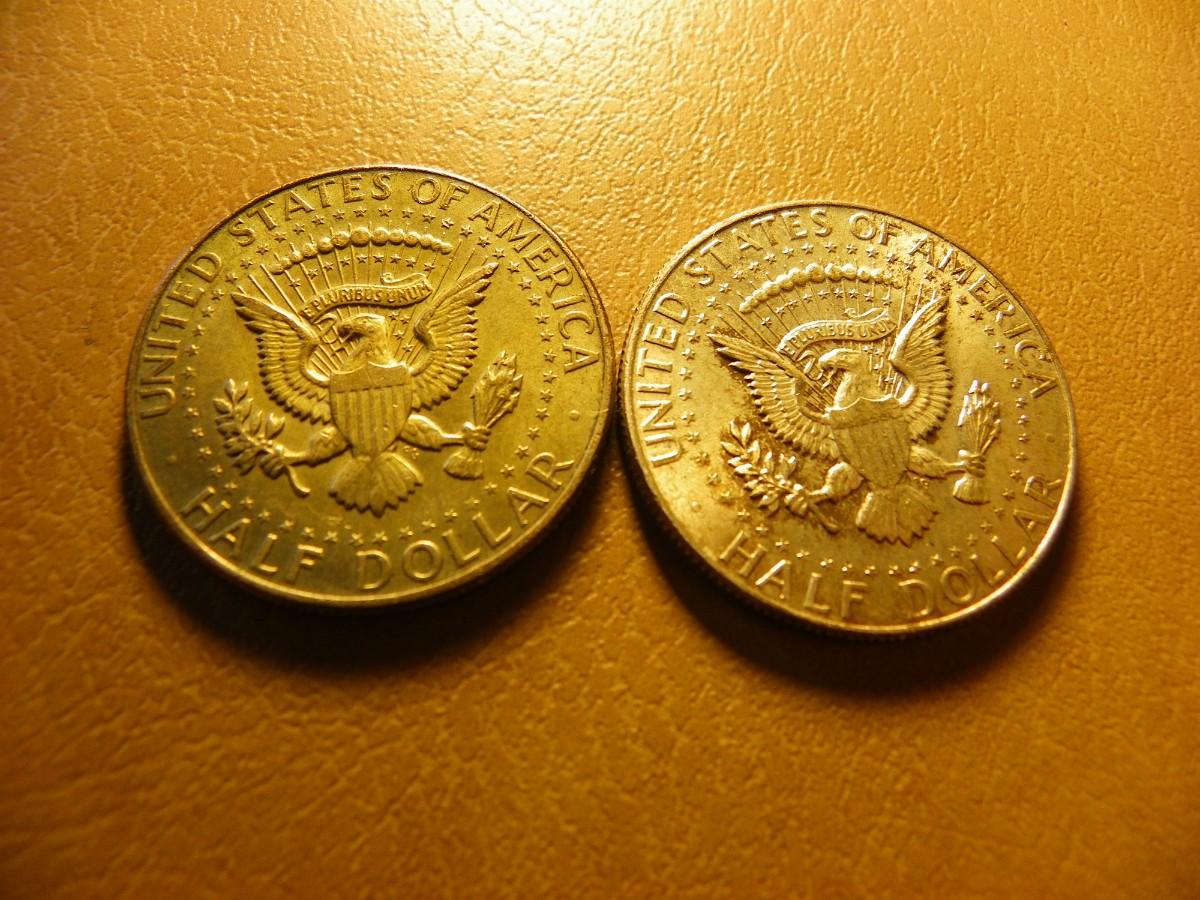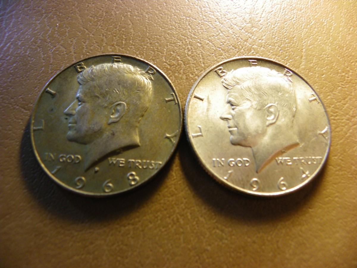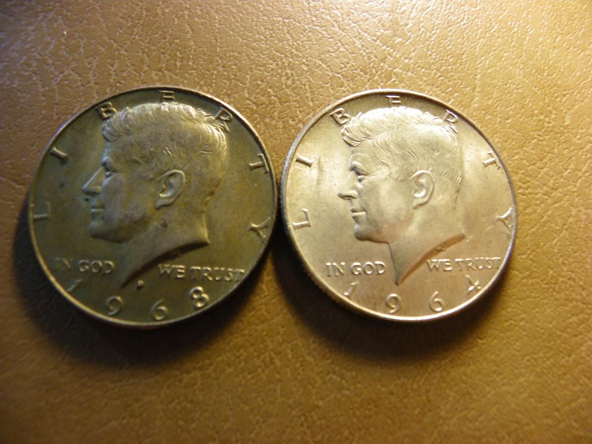 2- 1968 and 1964 Kennedy halve dollar coins.