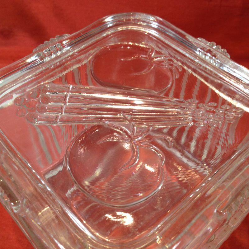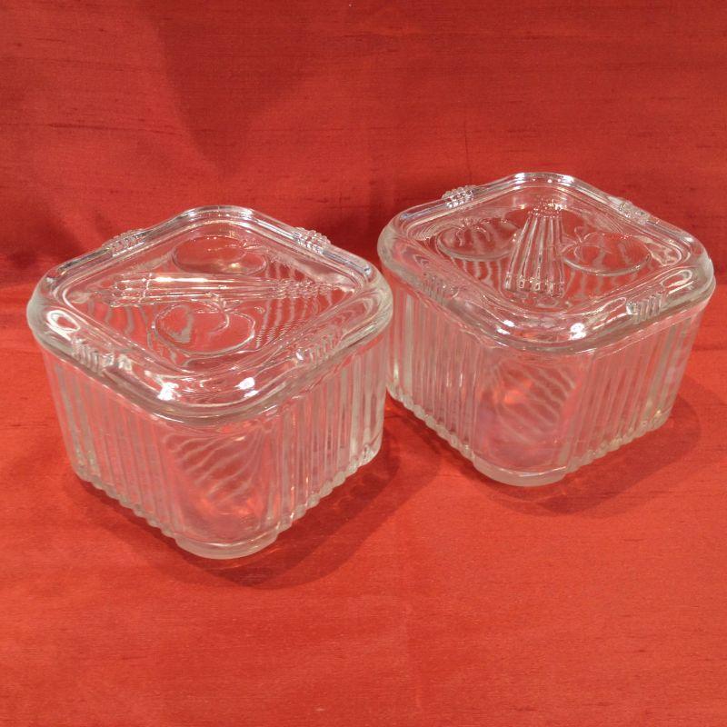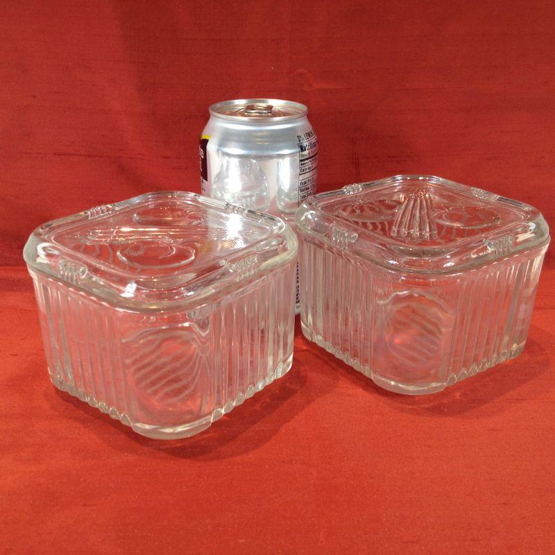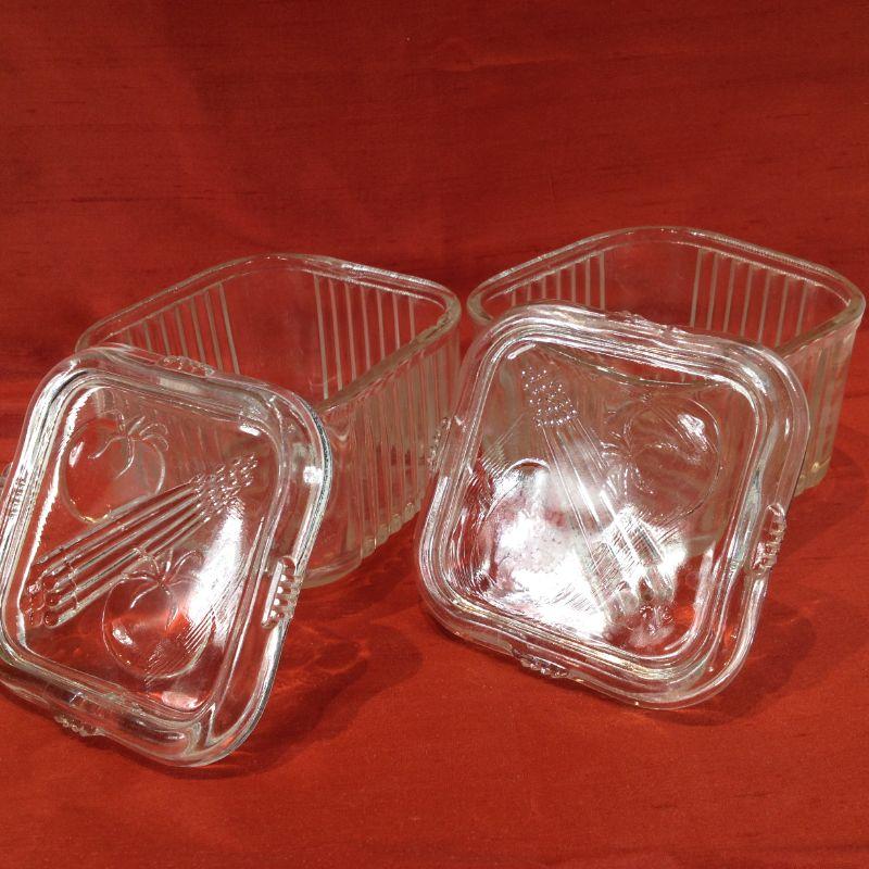 This lot is for a pair of 1930-ish Glass Refrigerators Keepers. Both are embossed with a tomato-asparagus design and appear to be in very nice condition. The containers measure 4-inches square X 3-inches tall.