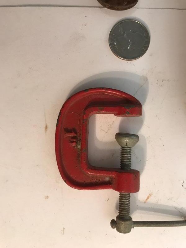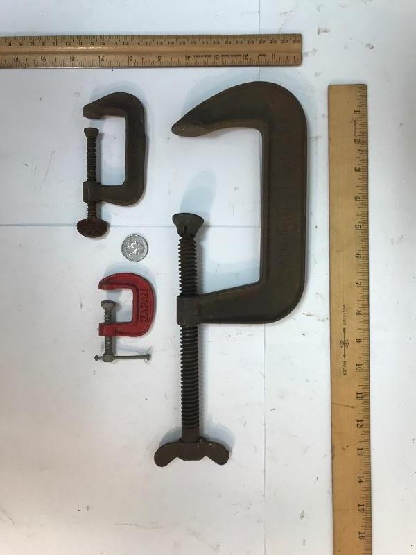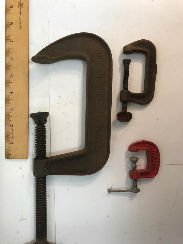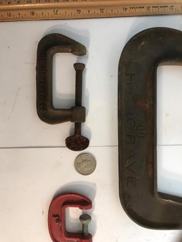 Lot of 3 vintage C clamps. Different sizes and makers. The largest is a Hargrave 5" standard clamp, next is a Majestic co. brownie no. 7, and the red one is newer, made in Japan.