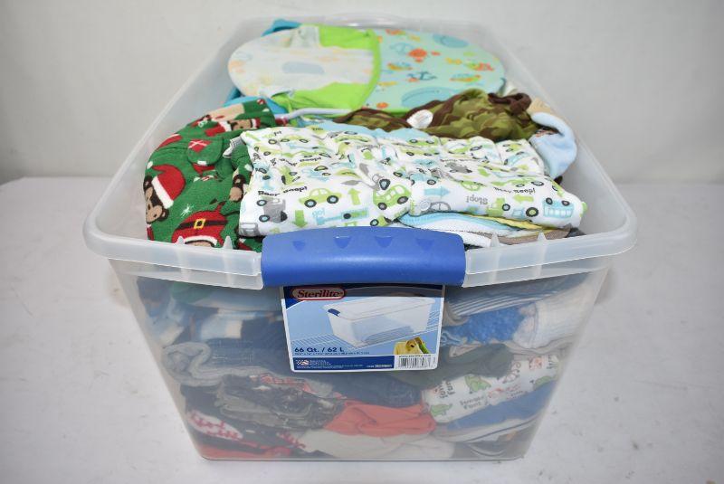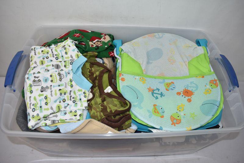 #2 66 Quart Clear Bin (with Clear Lid) Full of Baby Boy Items: Bath Seat, Clothing Bibs, and More! Mostly 3-12 Months