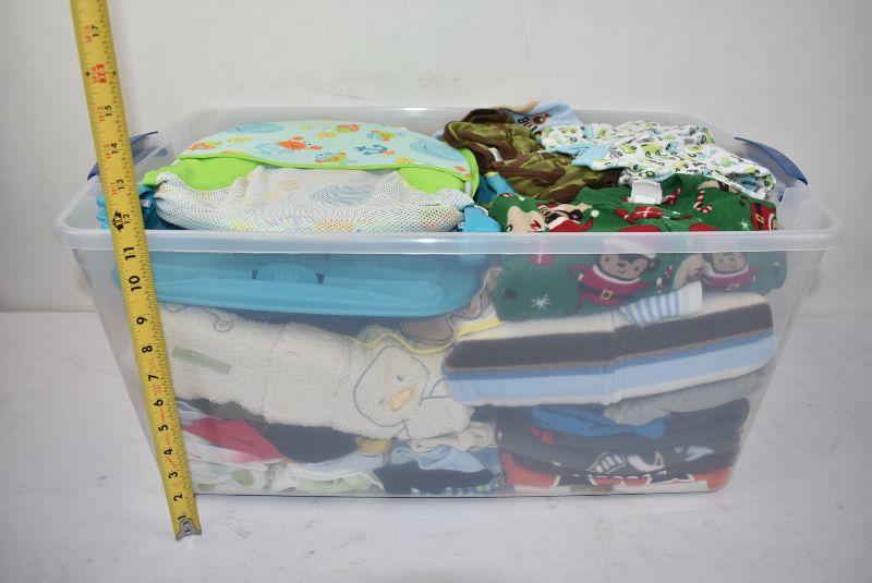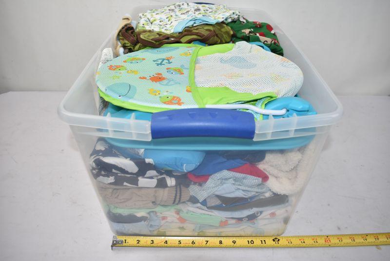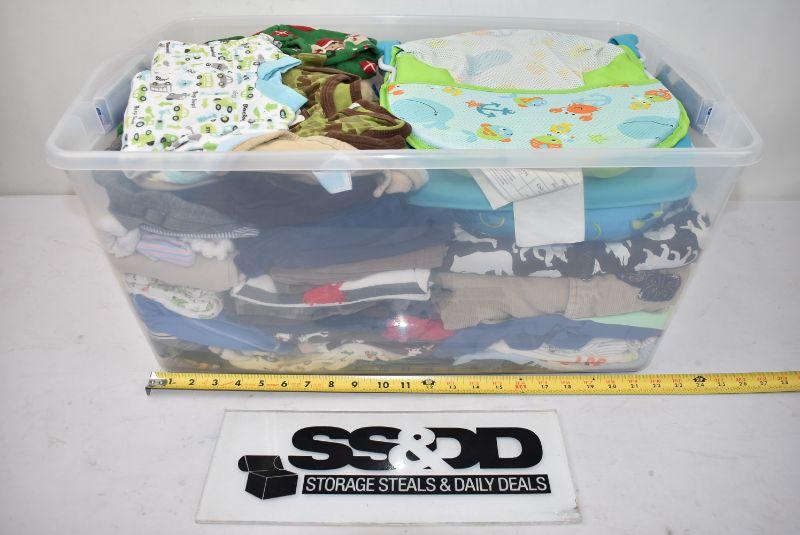 #2 66 Quart Clear Bin & Lid Baby Boy Items: Bath Seat, Bibs, Etc Mostly 3-12 Mth