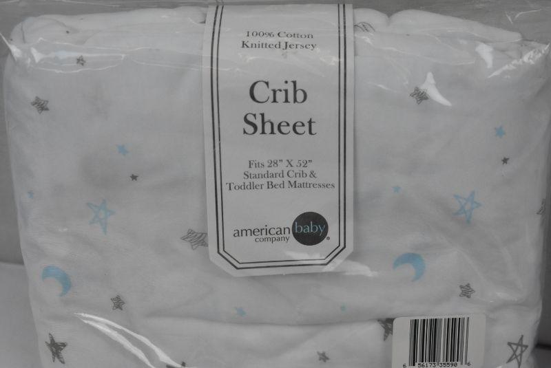2 American Baby Co. Cotton Jersey Knit Fitted Crib Sheets, White w/ Grey Stars & White w/ Blue Stars - New