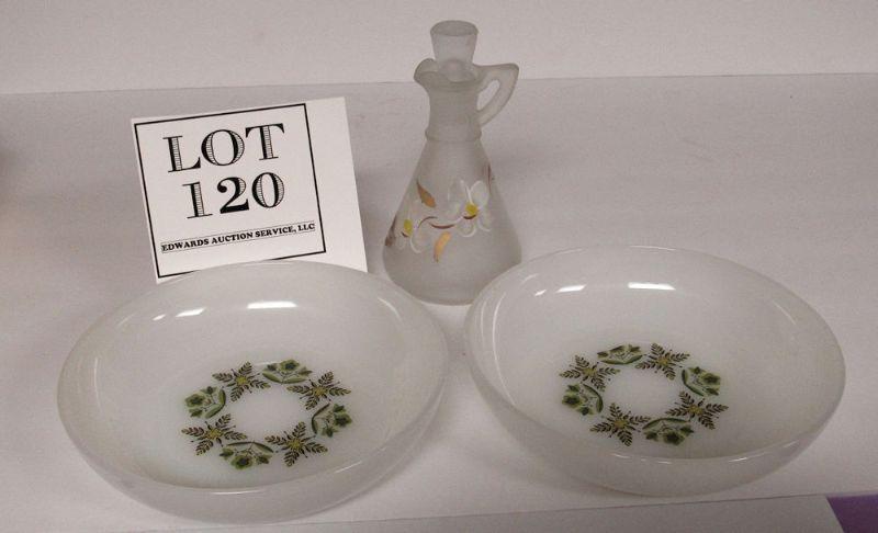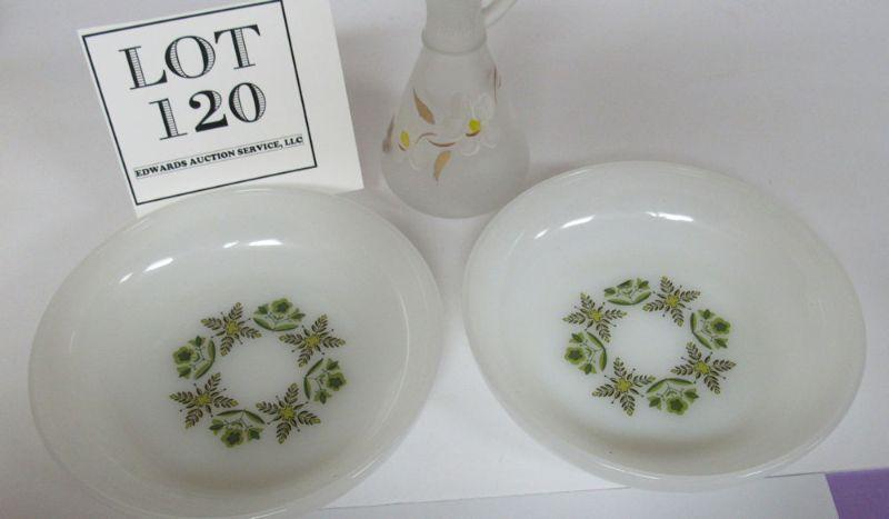 2 Anchor Hocking Green Meadow Soup Bowls, Hazel Atlas MCM Frosted Cruet Original Stopper