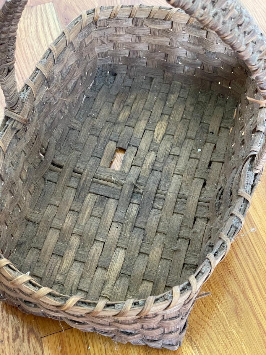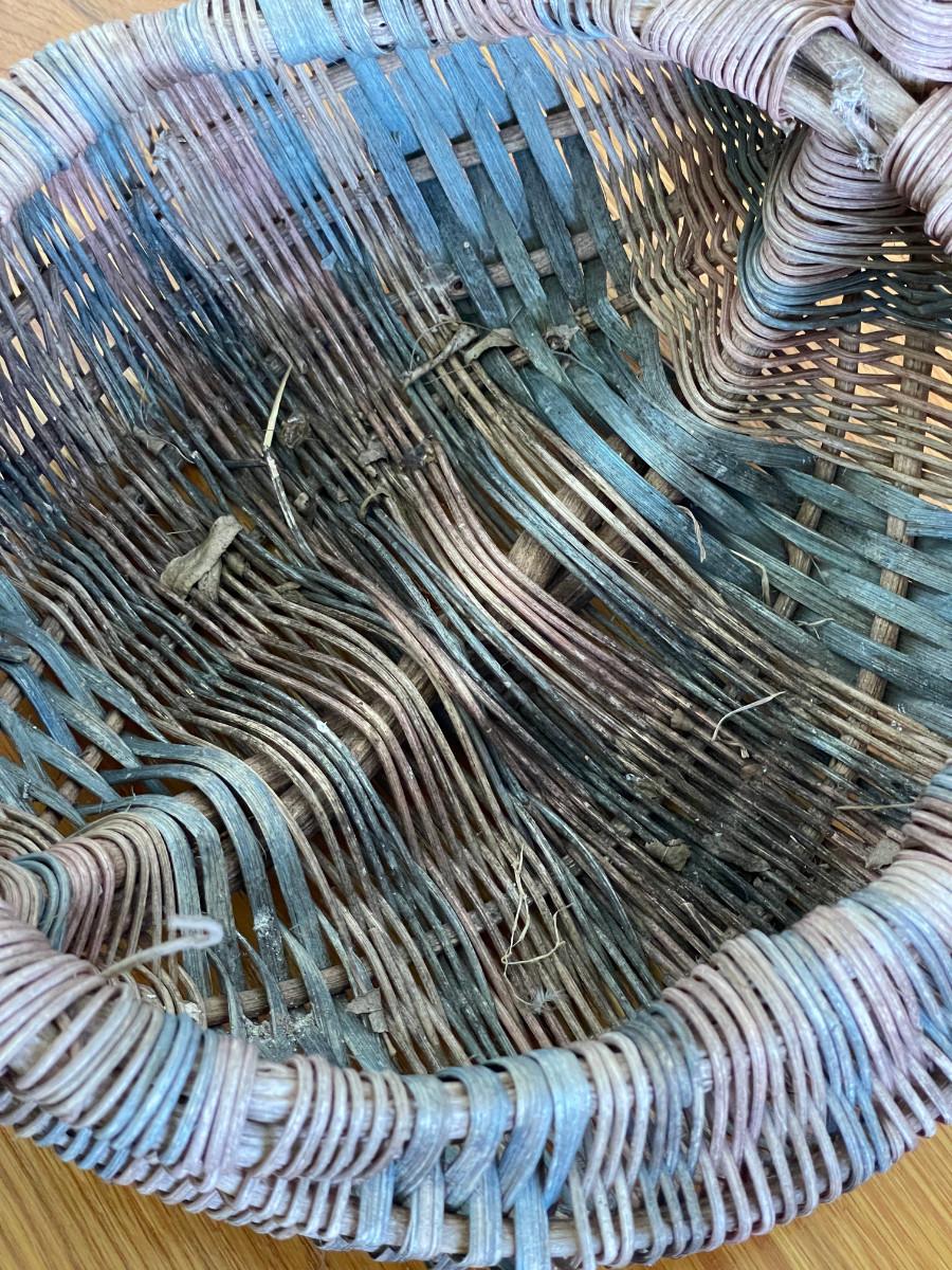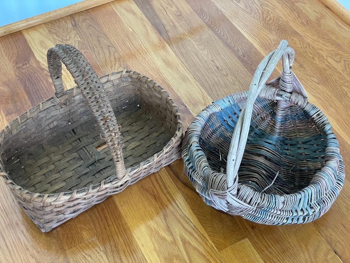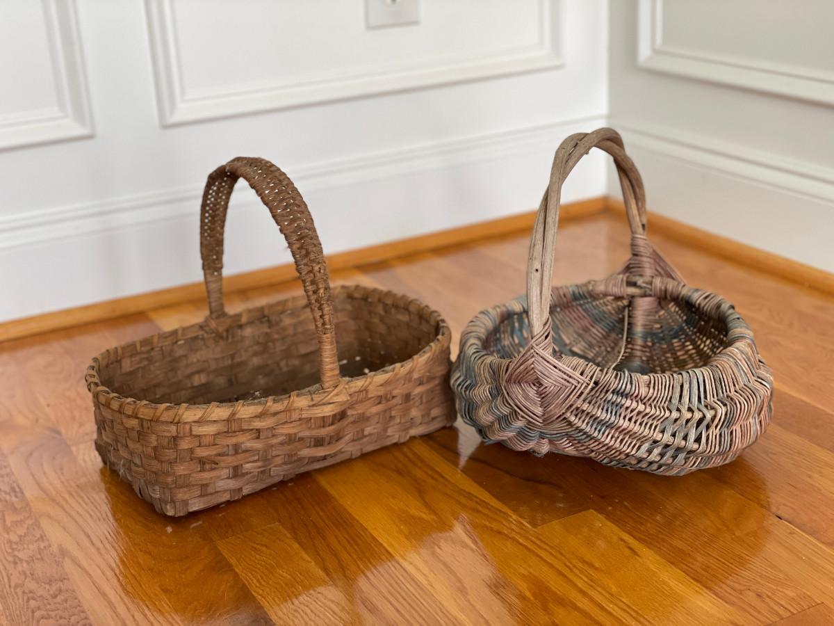 Both were used in the garden so have some dirt on them. Multicolored basket was made for egg collecting.