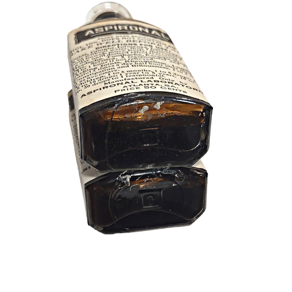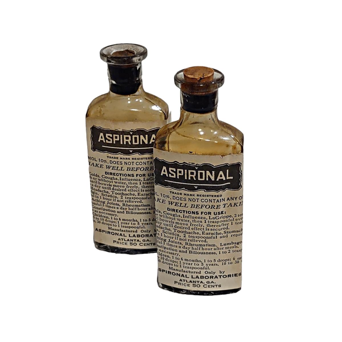 2 Antique Clear Glass Cork Top Aspironal Medicine Bottles
