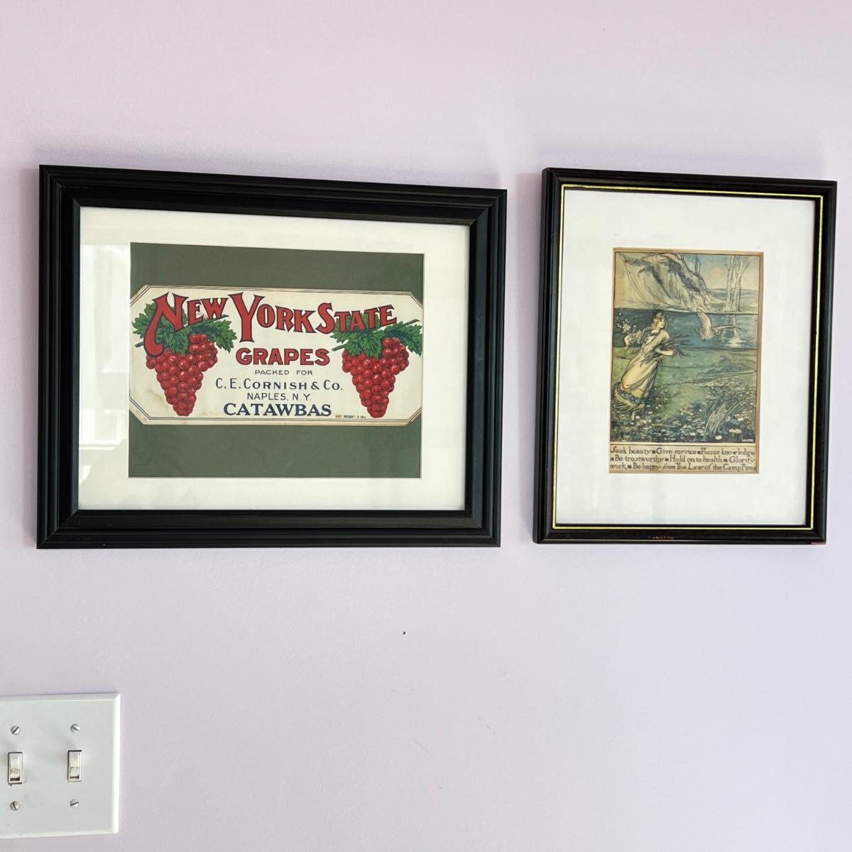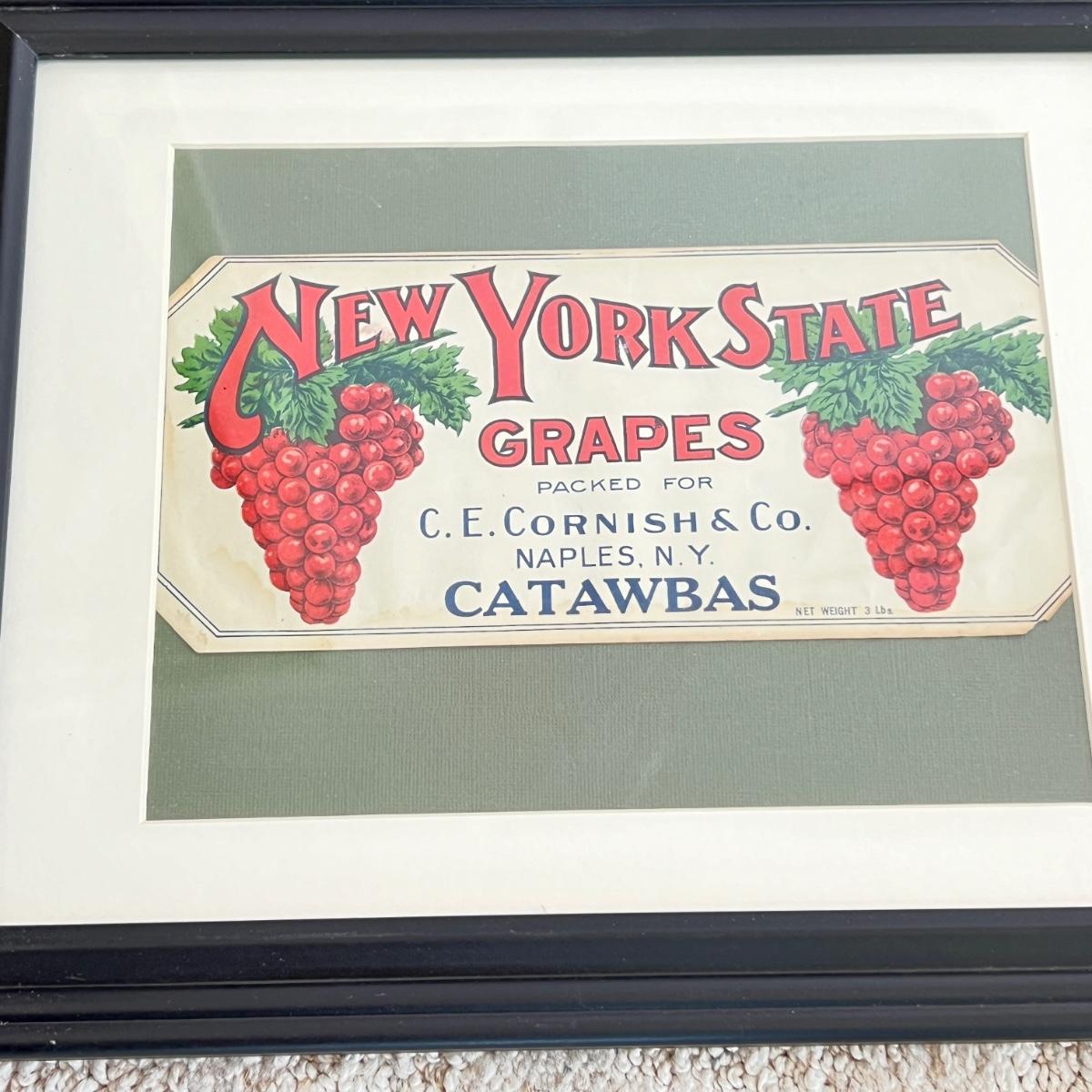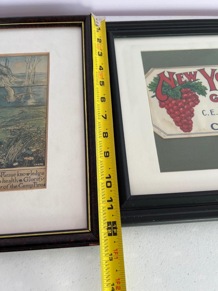 LAKEMONT Brand, New York State, Catawba framed original grape basket label. Framed graphic from 1916 book, "The Camp Fire Girls at School" by Hildegard G. Frey, that reads "Seek beauty, give service, pursue knowledge, be trustworthy, hold on to health, glorify work, and be happy".