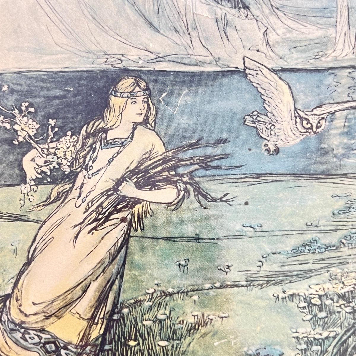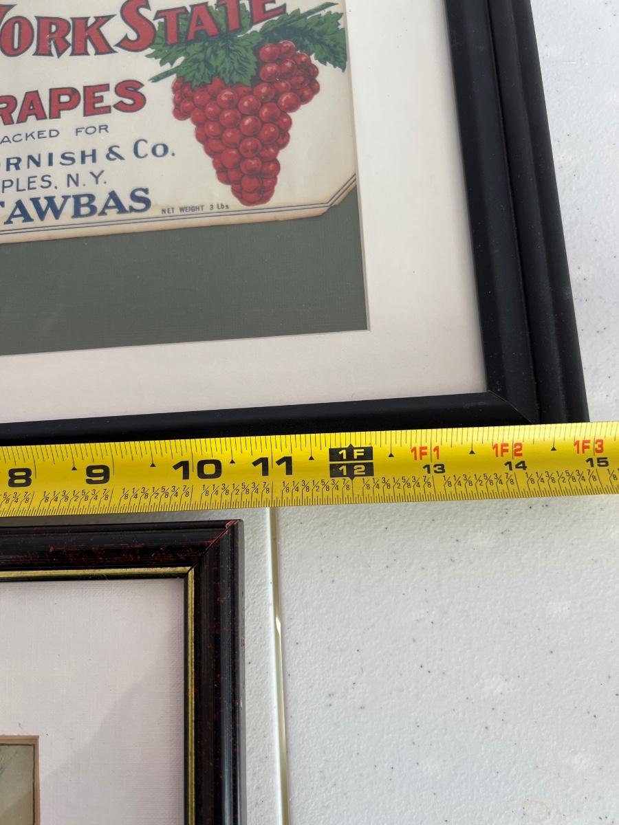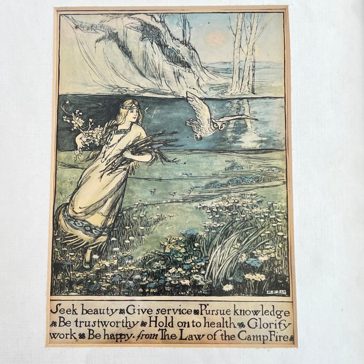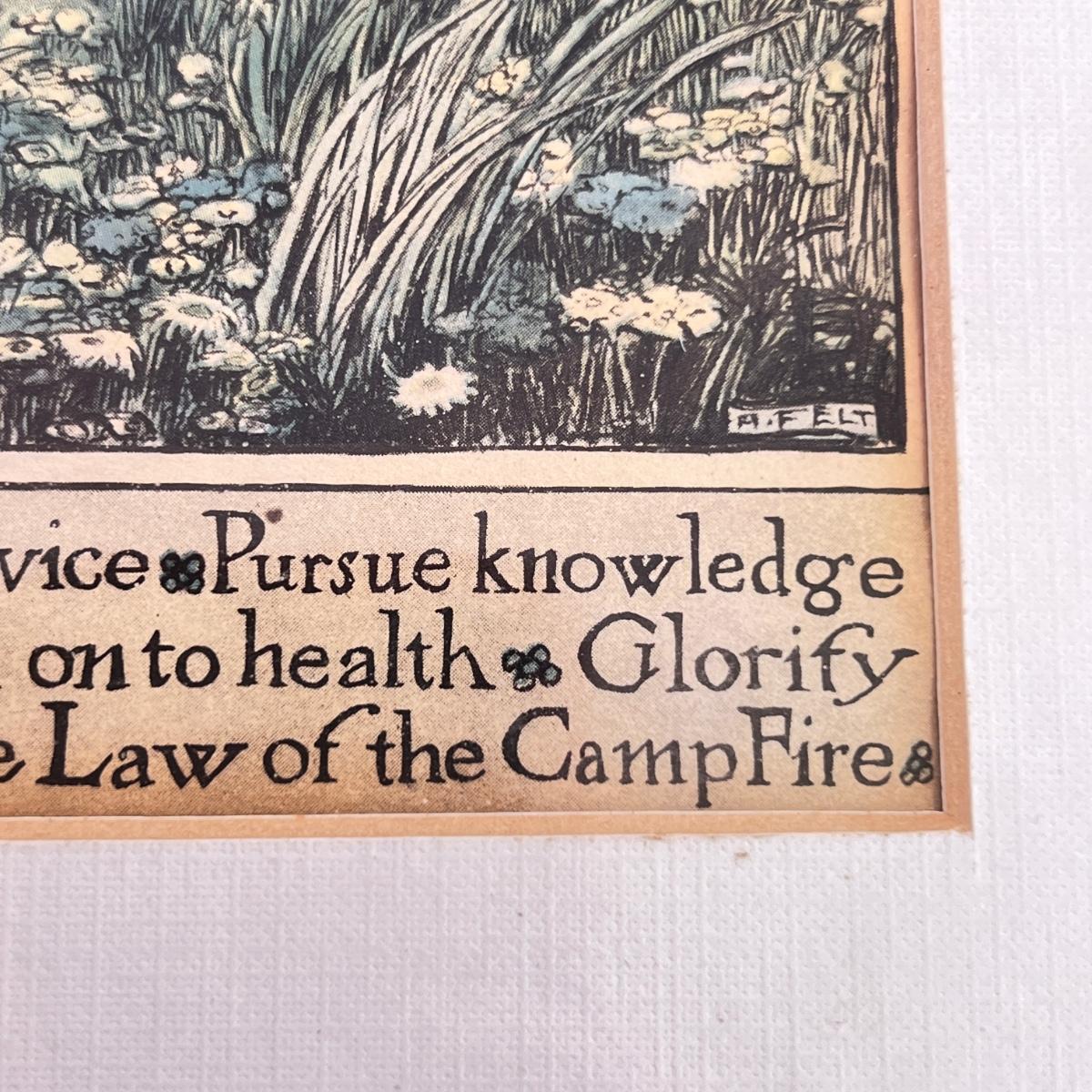 LAKEMONT Brand, New York State, Catawba framed original grape basket label. Framed graphic from 1916 book, "The Camp Fire Girls at School" by Hildegard G. Frey, that reads "Seek beauty, give service, pursue knowledge, be trustworthy, hold on to health, glorify work, and be happy".