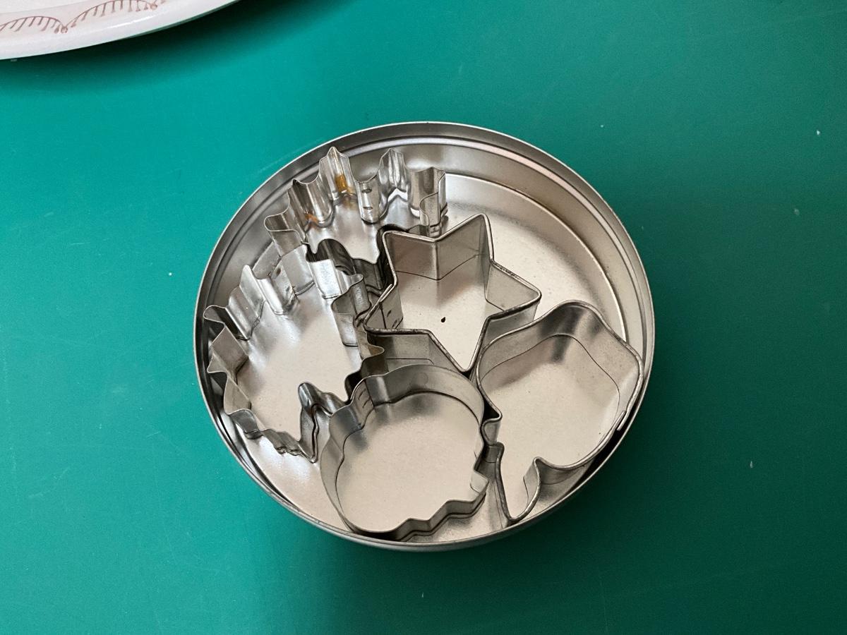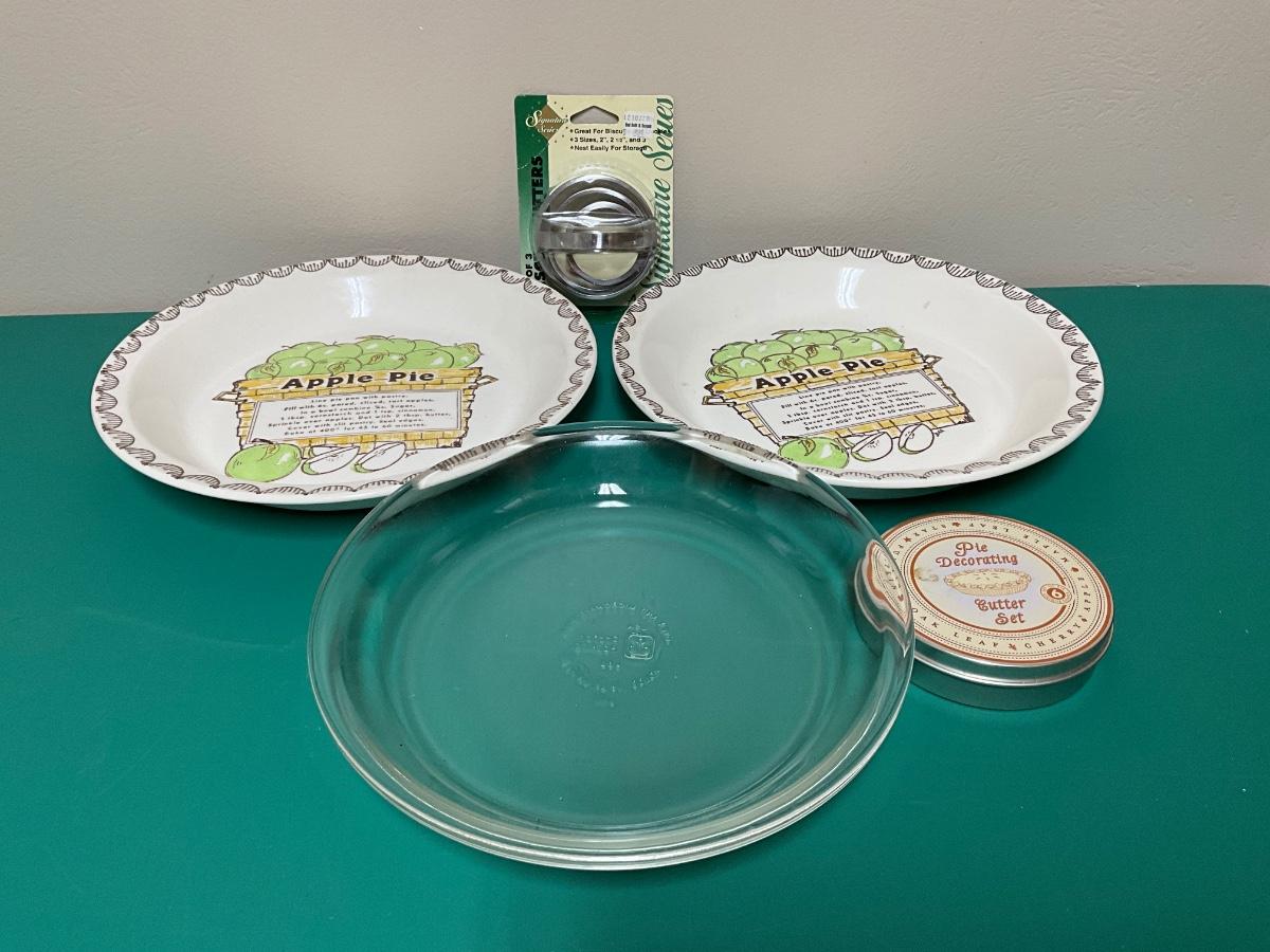 2 apple pie dishes, Anchor Hocking glass pie plate, Pie cutting tools, biscuit cutting tools
