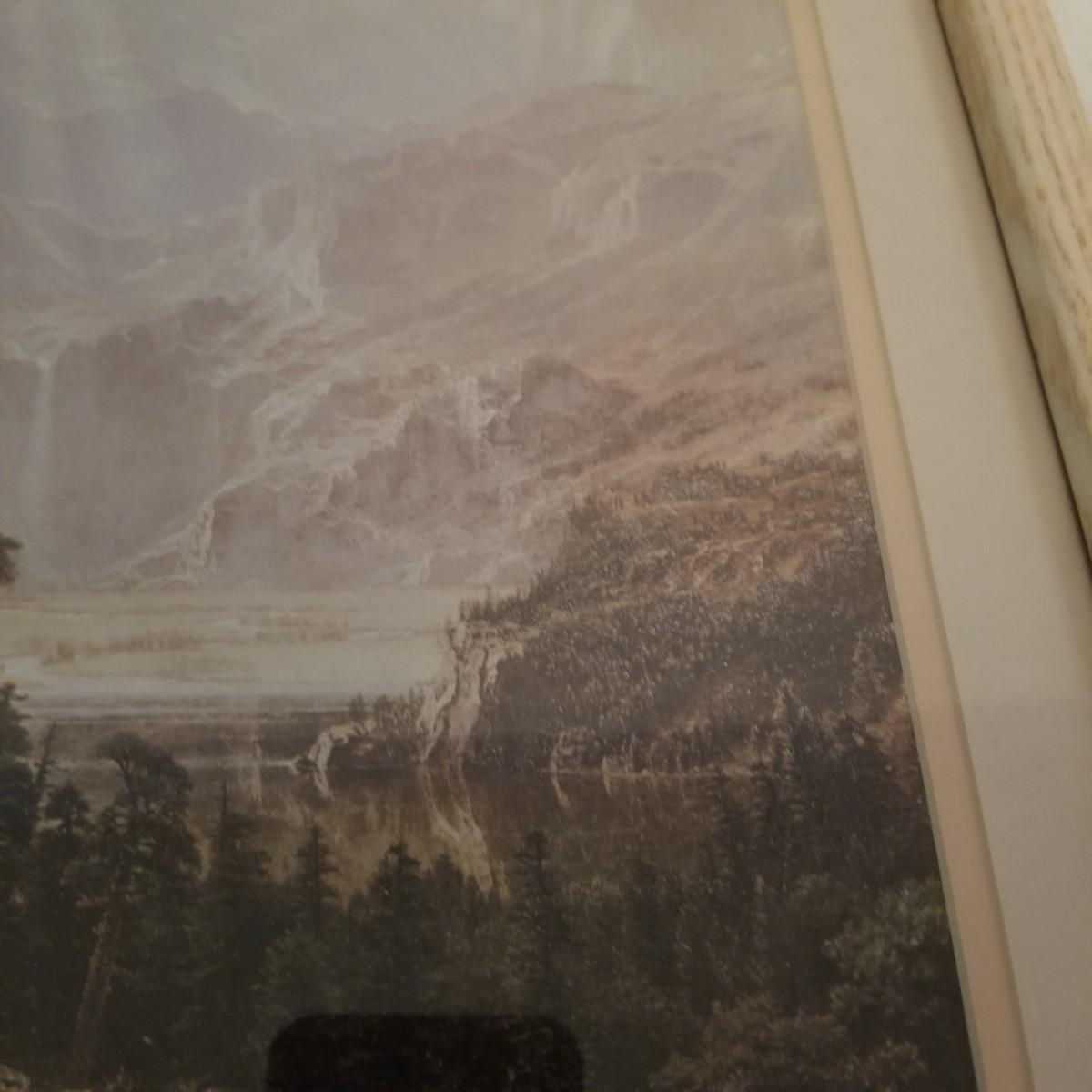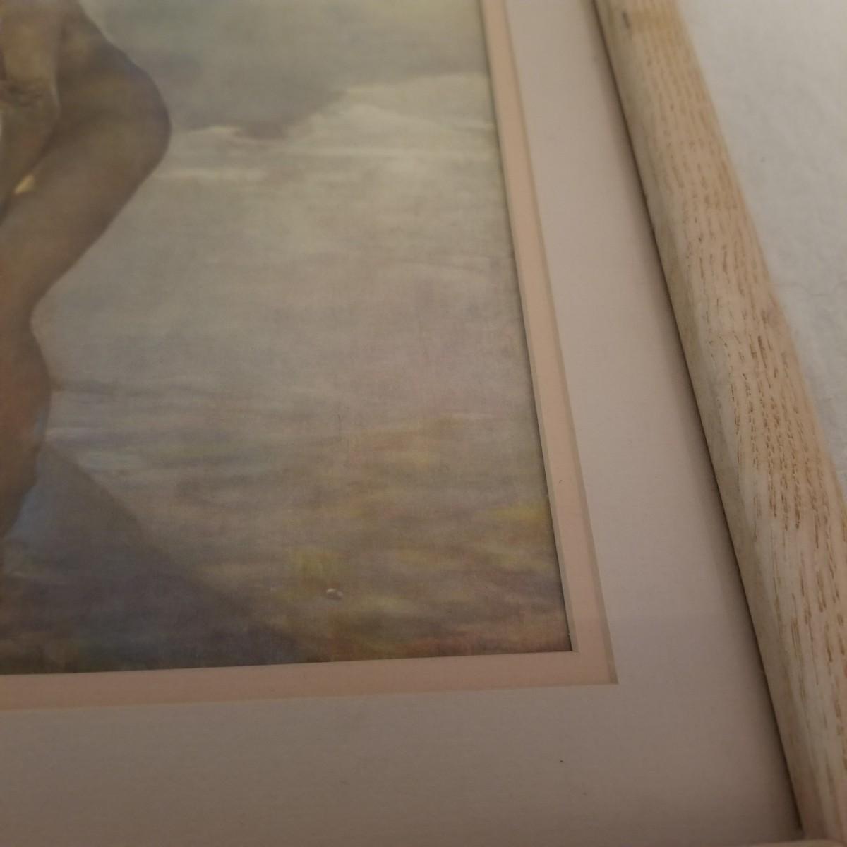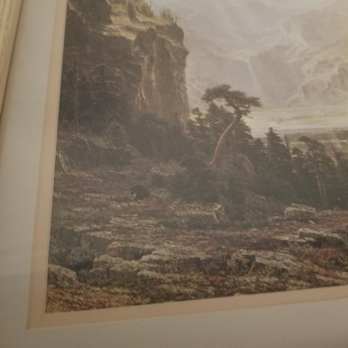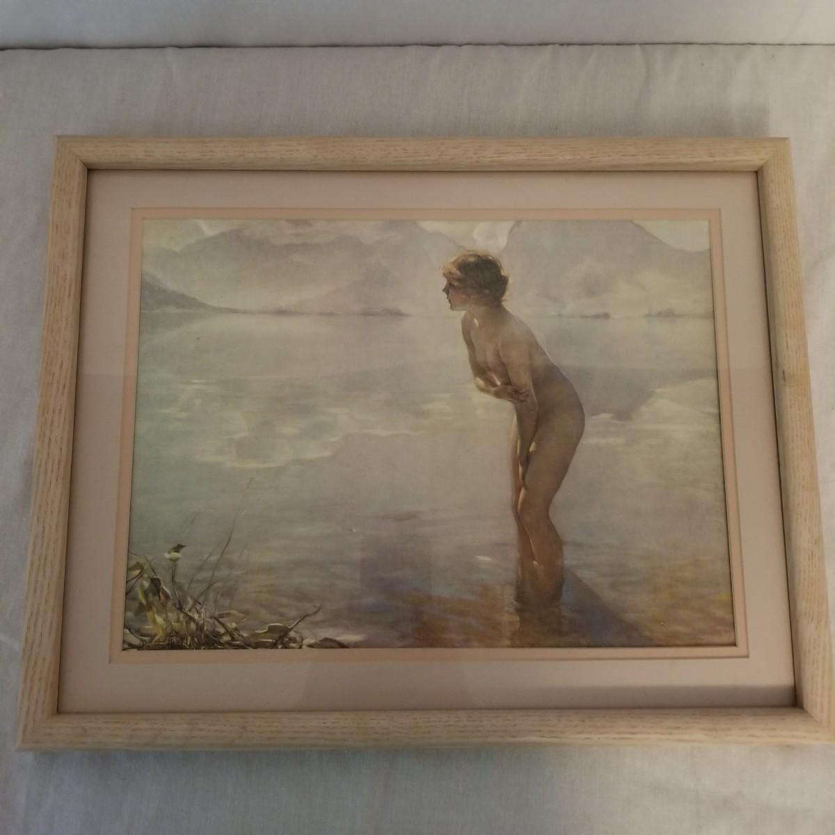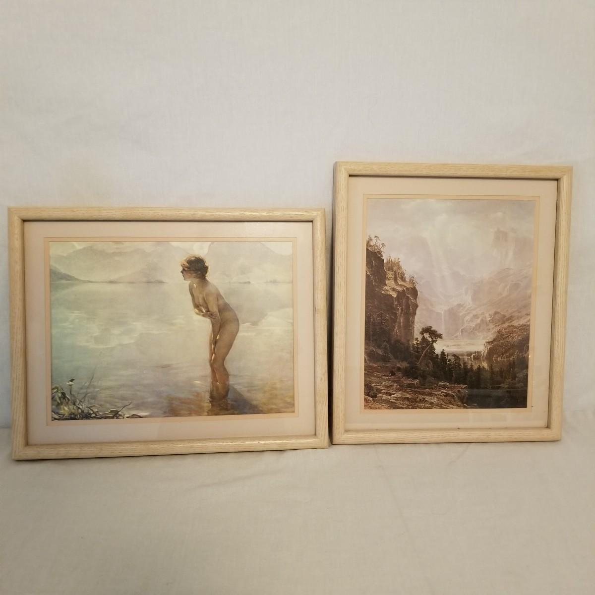 A pair of white framed art prints. One shows a majestic mountain scene and lake, the other a young maiden bathing. Both prints measure 14.5"x17" and are in good condition. See photos for details. Shipping available. Shipping Art can be costly please call UPS store at 828-252-6930 for quote.