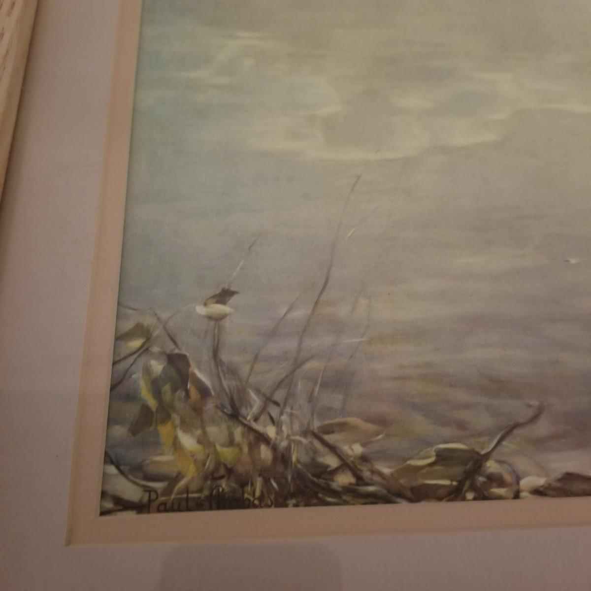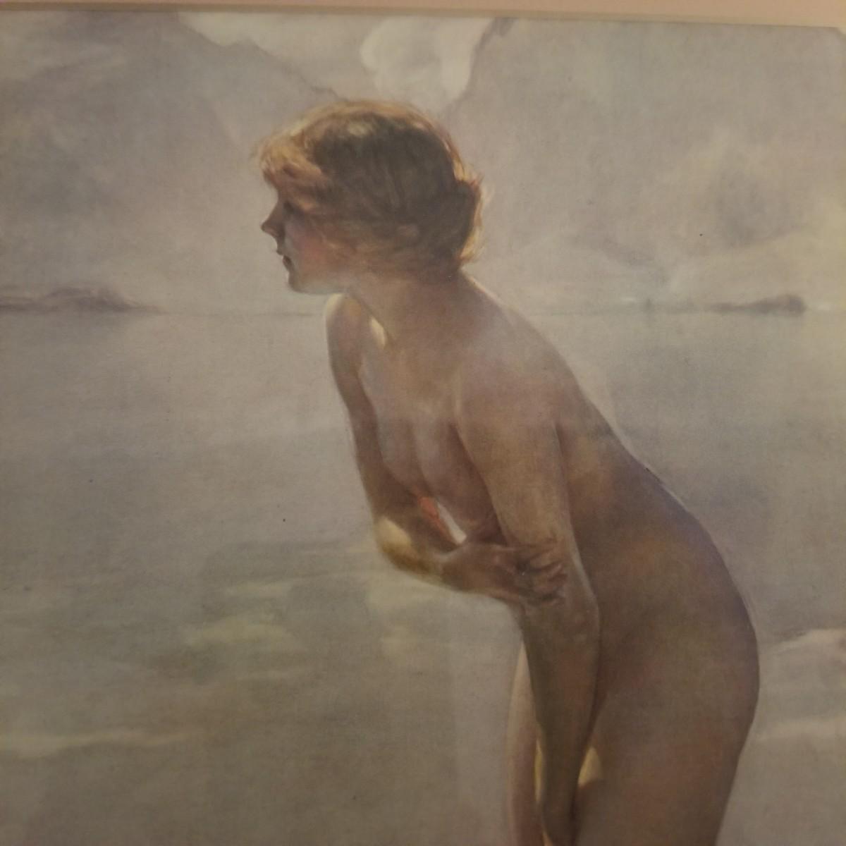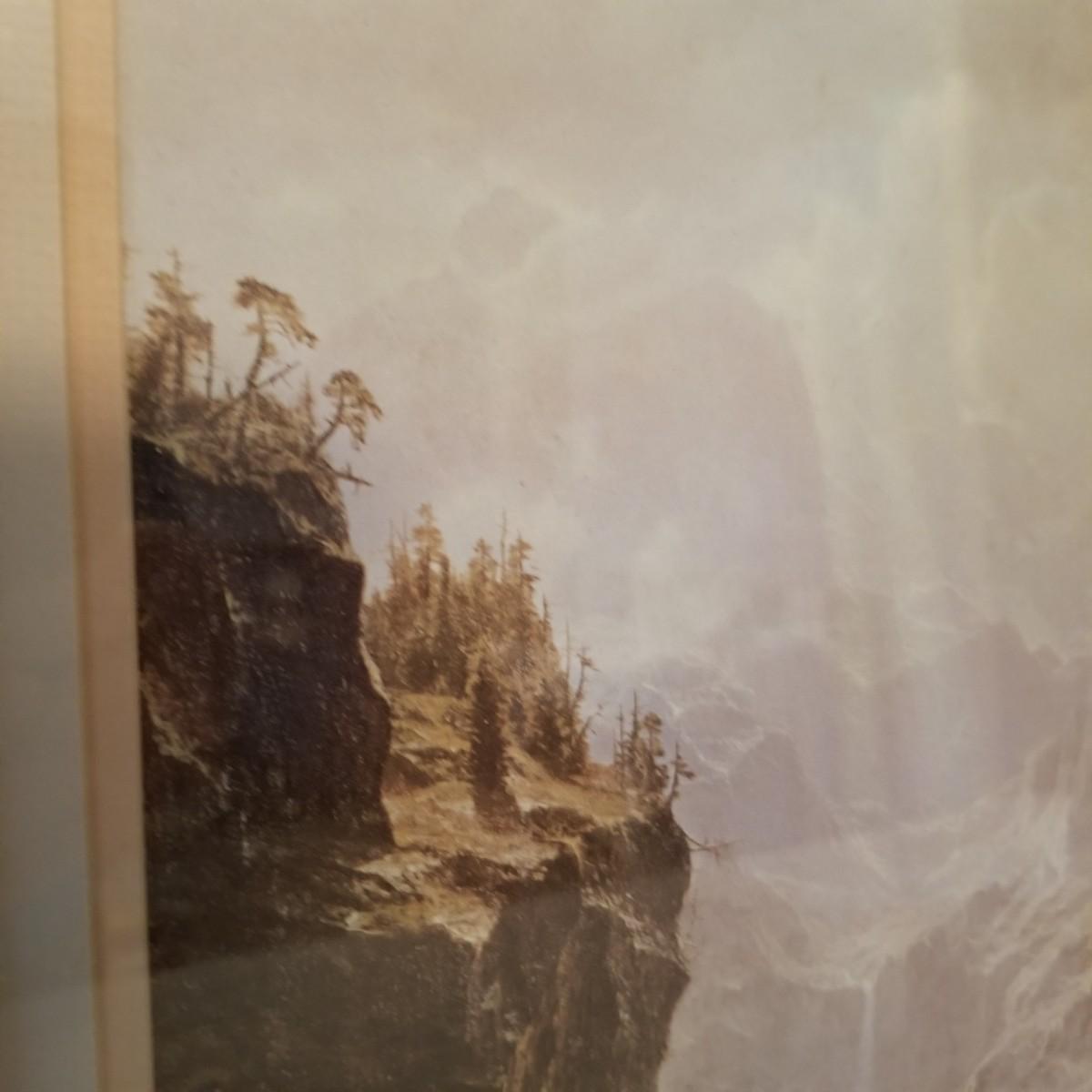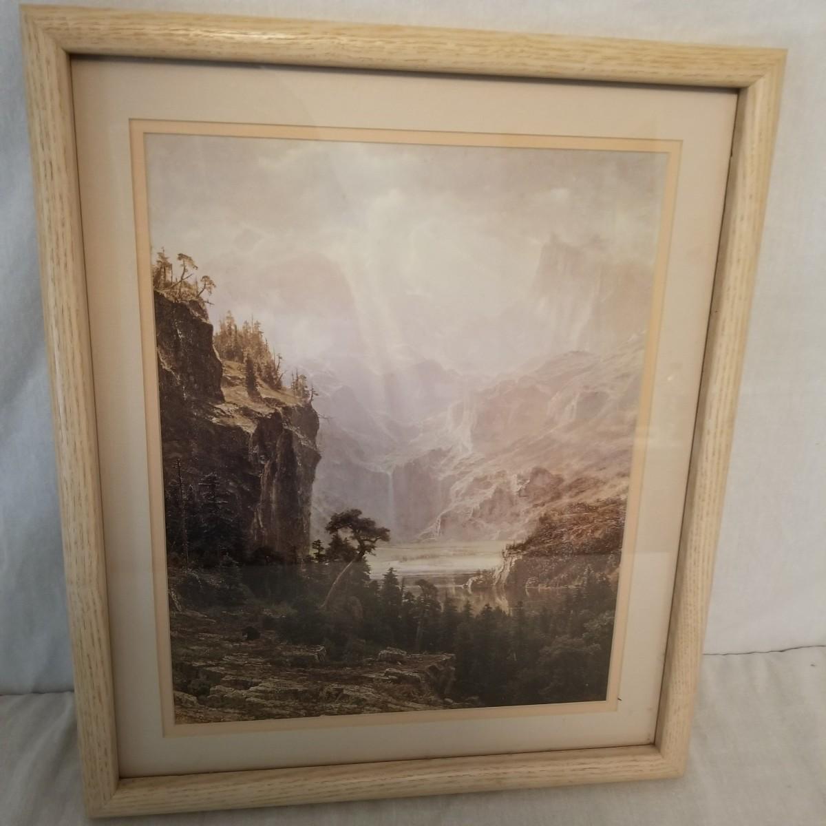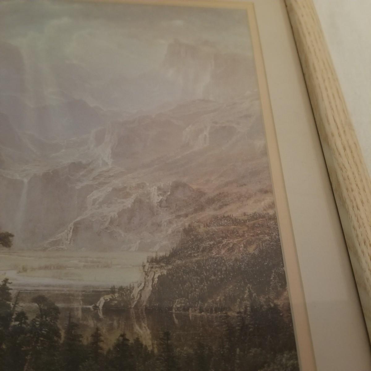 A pair of white framed art prints. One shows a majestic mountain scene and lake, the other a young maiden bathing. Both prints measure 14.5"x17" and are in good condition. See photos for details. Shipping available. Shipping Art can be costly please call UPS store at 828-252-6930 for quote.