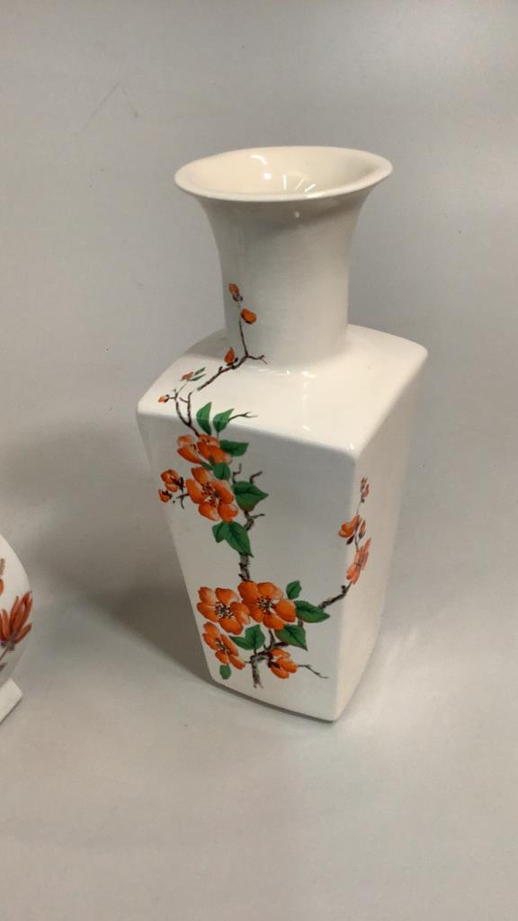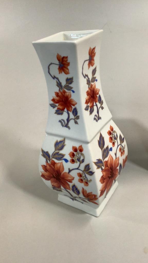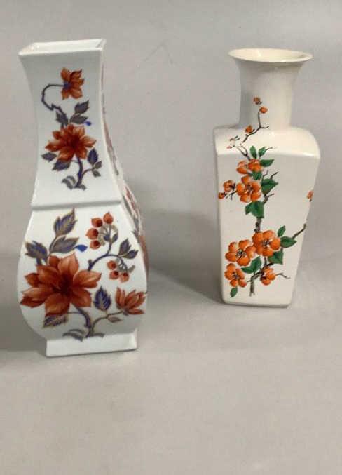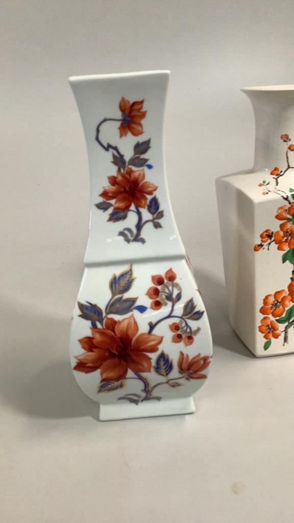 11 inch vase with blue and red floral, marked Schumann, Bavaria, 10.5 inch vase with orange floral buds on tree branch, a unknown mark at base #8
