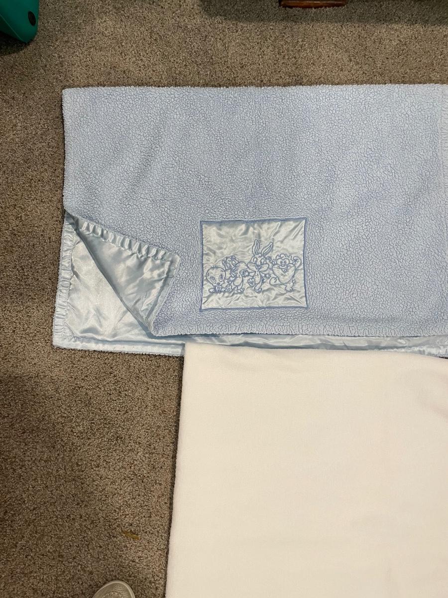 1 blue baby blanket with Tweety Bird, Tasmanian Devil, Bunny and Squirrel stitched on front
