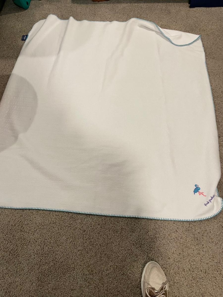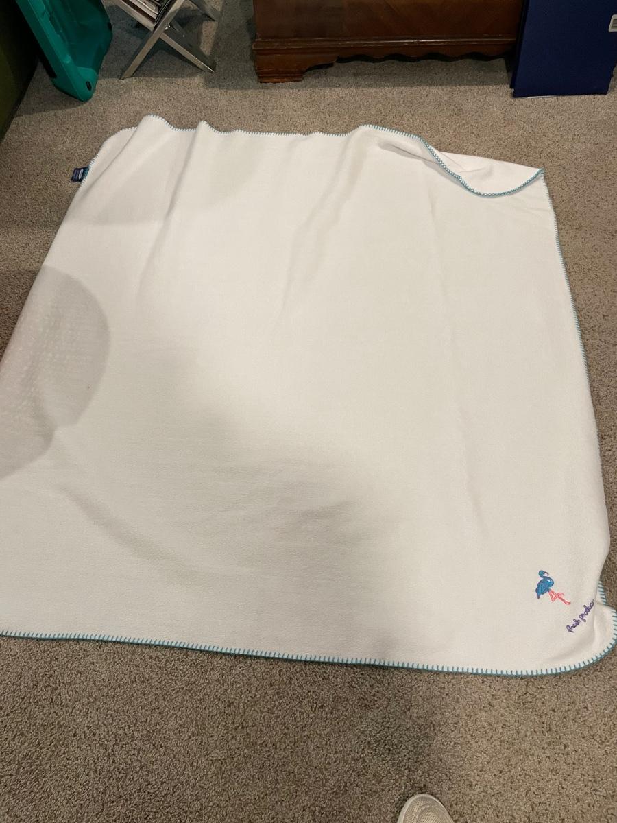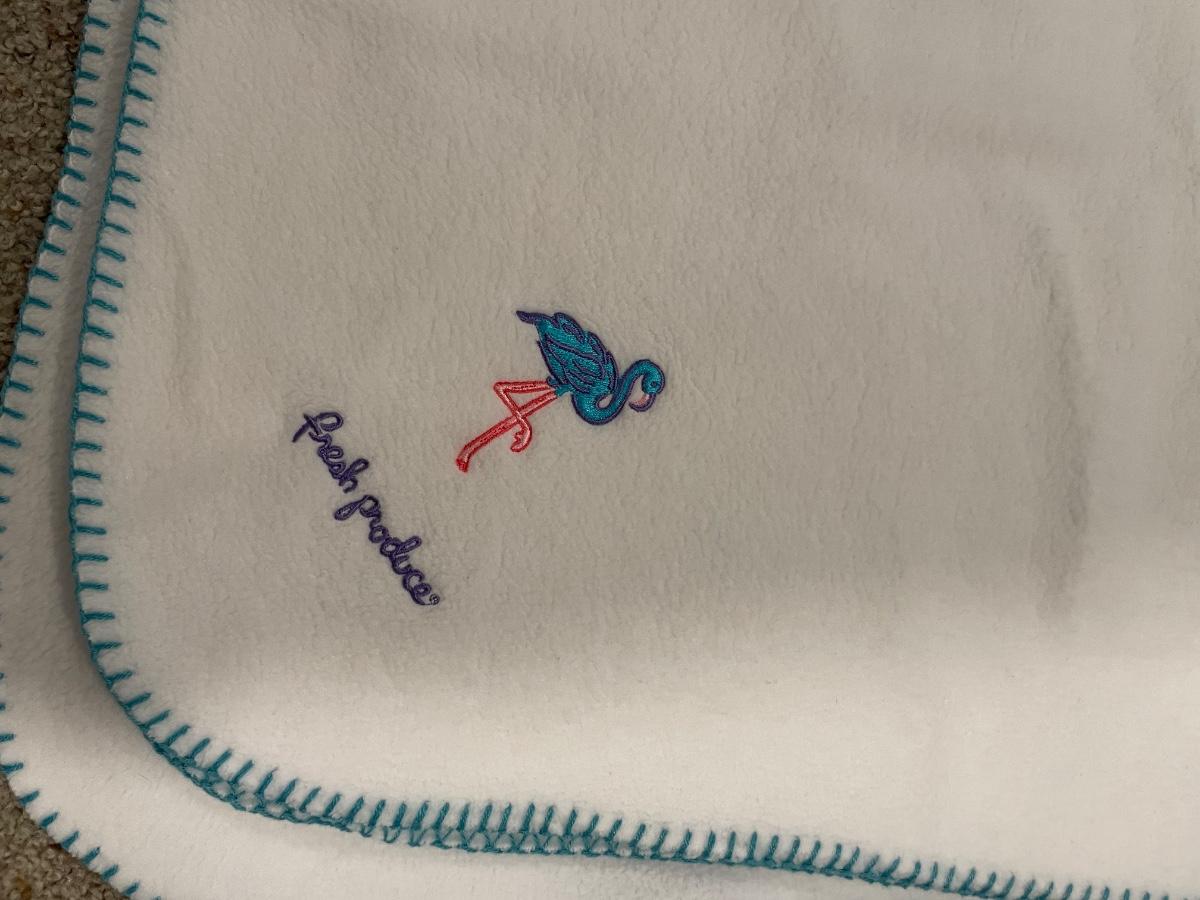 “Fresh Produce” baby blanket white fleece trimmed in teal with stitched stork on 1 corner - too cute