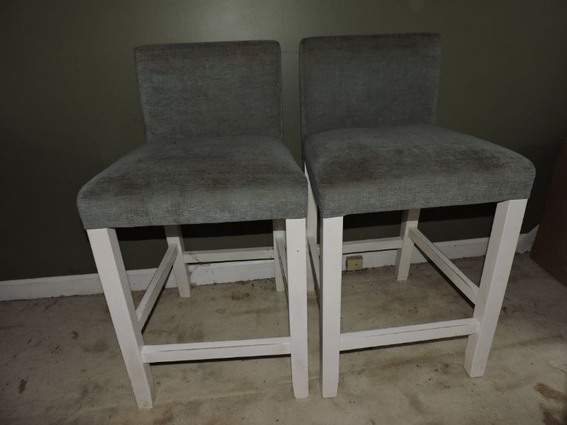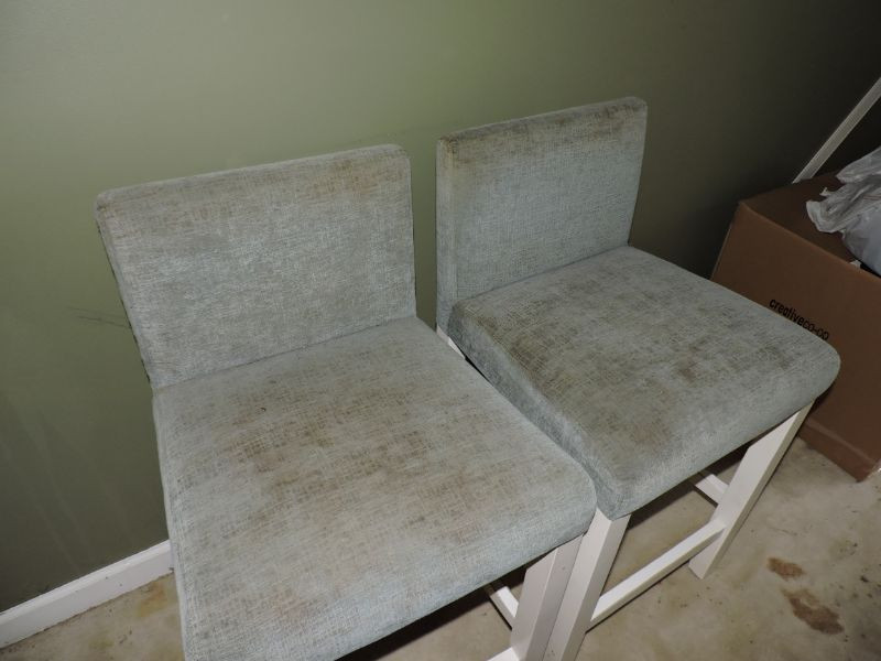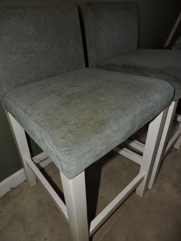 Two bar bluish/grey upholstered bar stools, need good cleaning