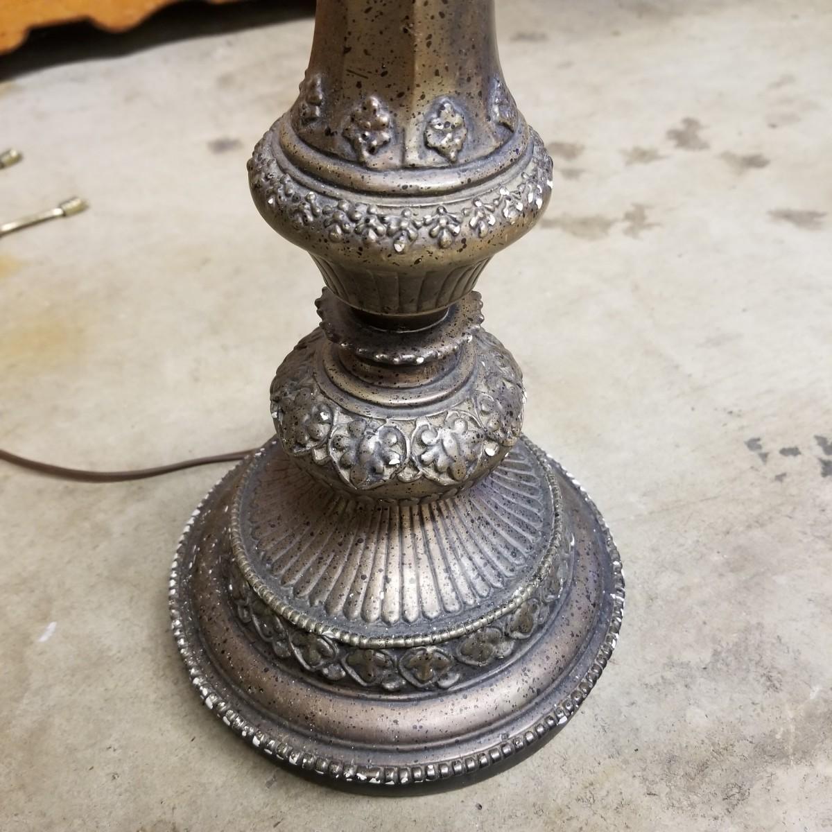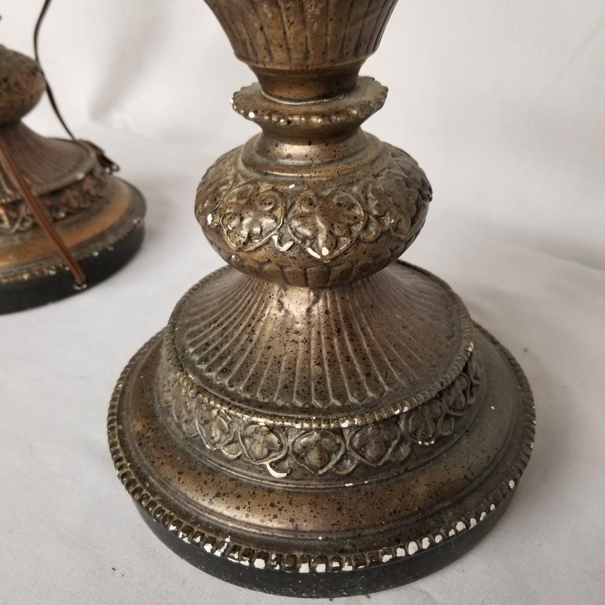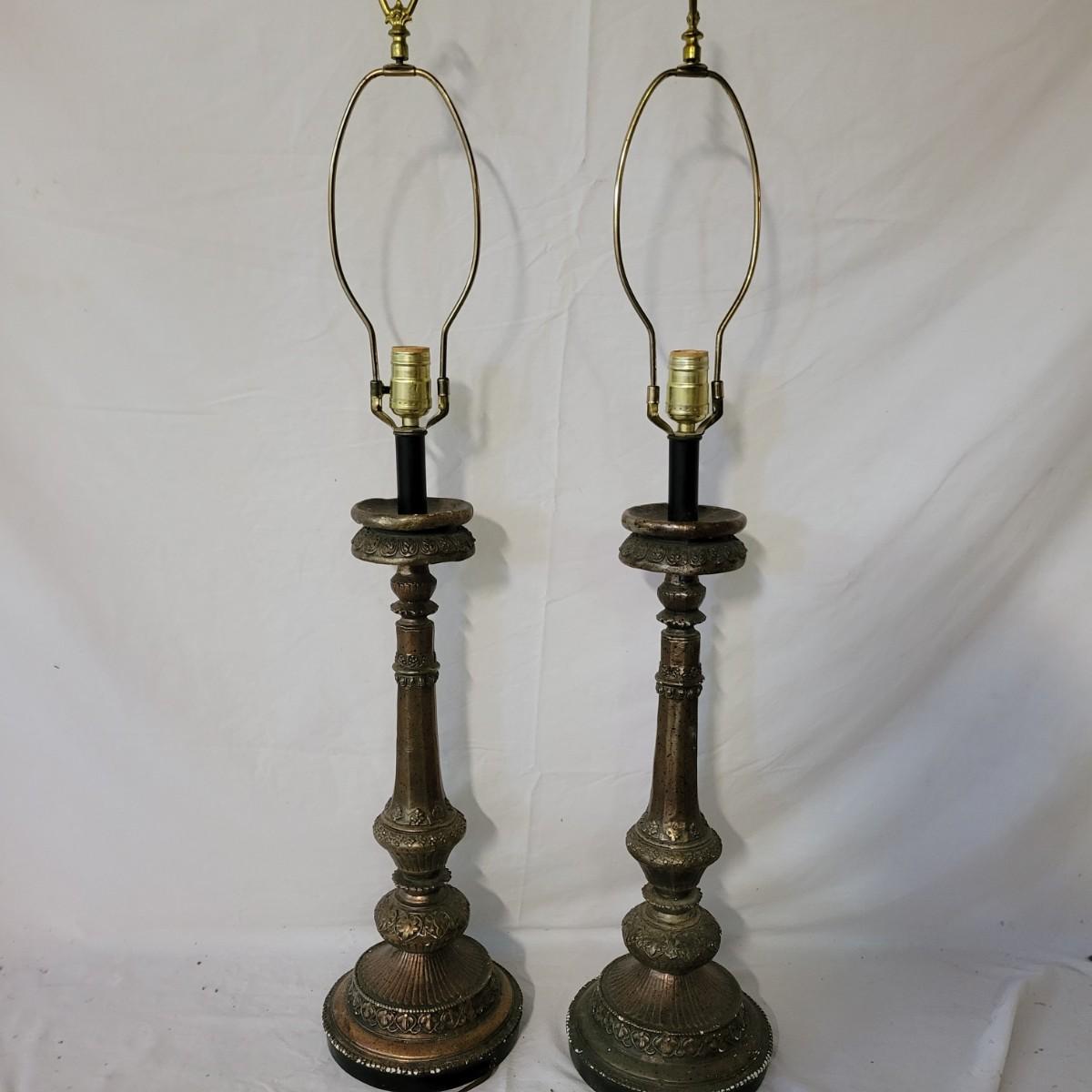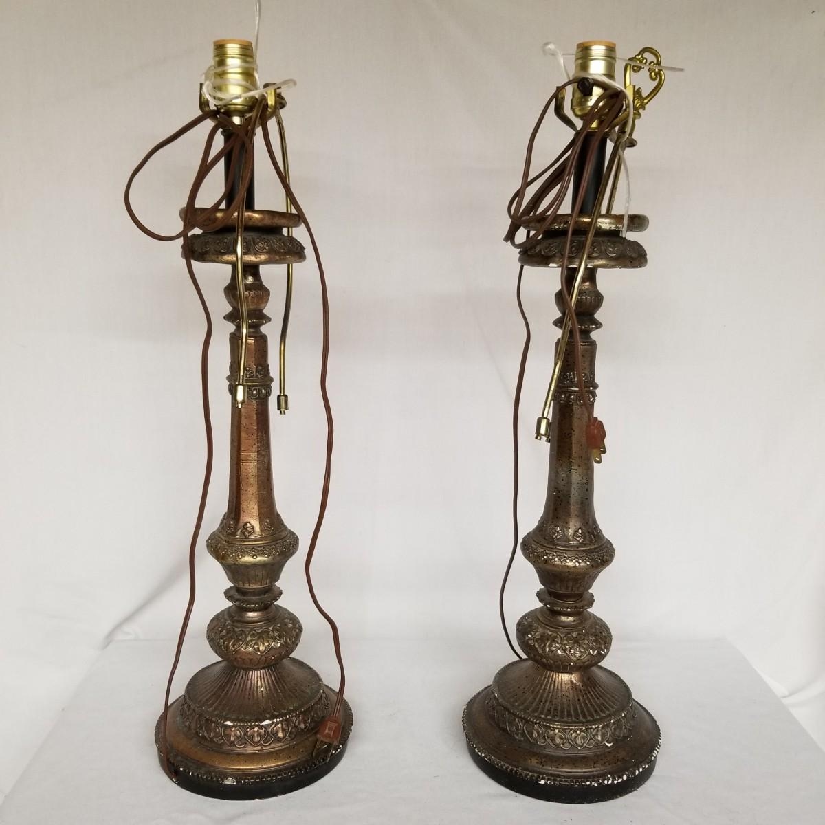 A pair of baroque inspired lamp bases.  Items appear to be plaster, have numerous chips and dents. Tested working. Measures approximately 7" x 36" See photos for detail.  Local pickup only.