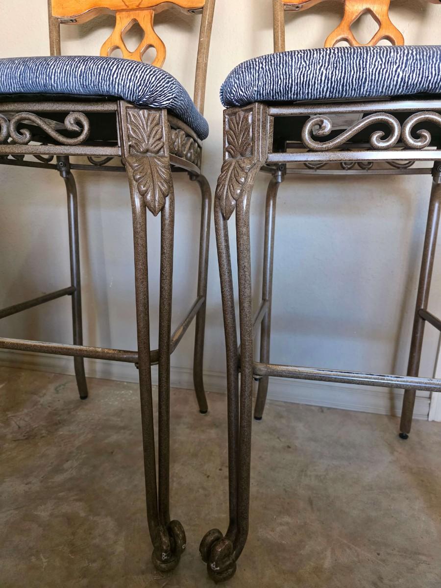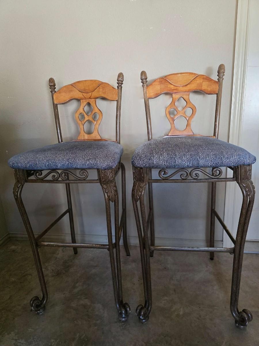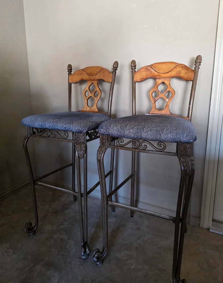 2 Tall Bar Stools, wrought iron and wood with navy upholstered seats. 20"L x 20"W x 46"H.