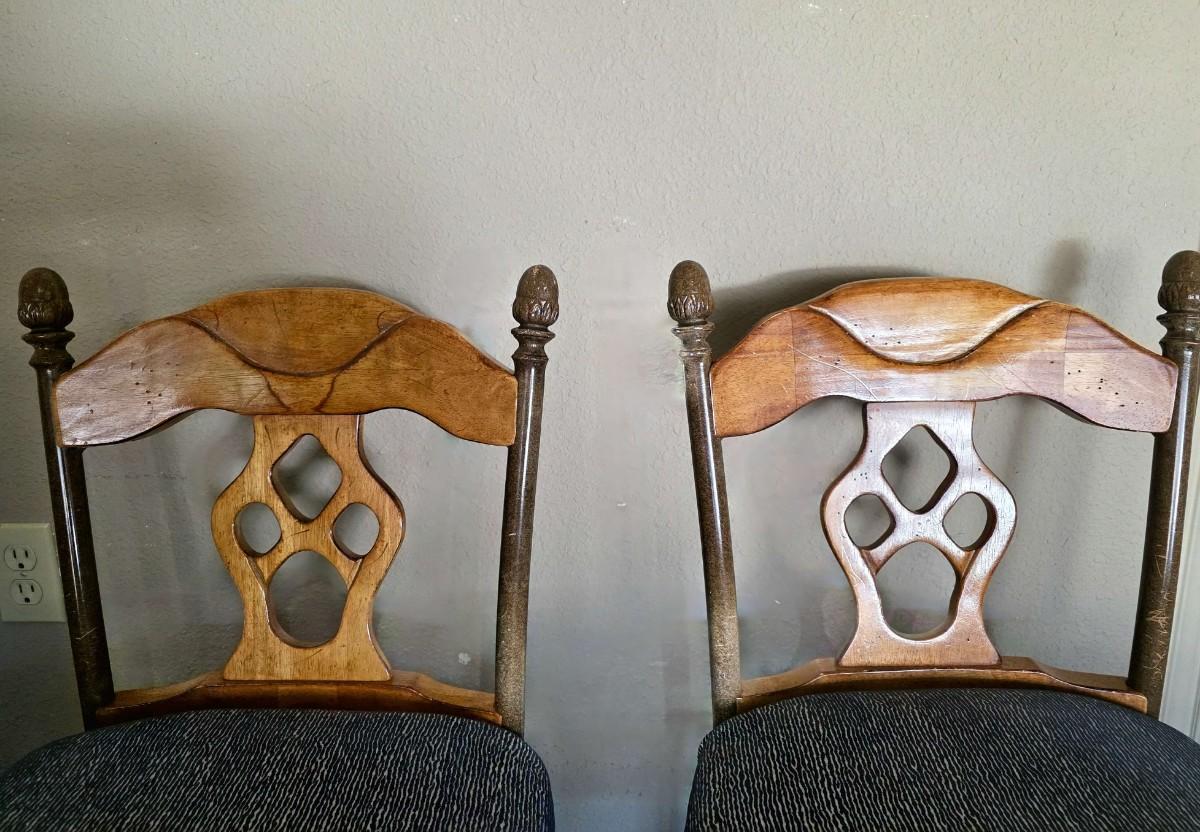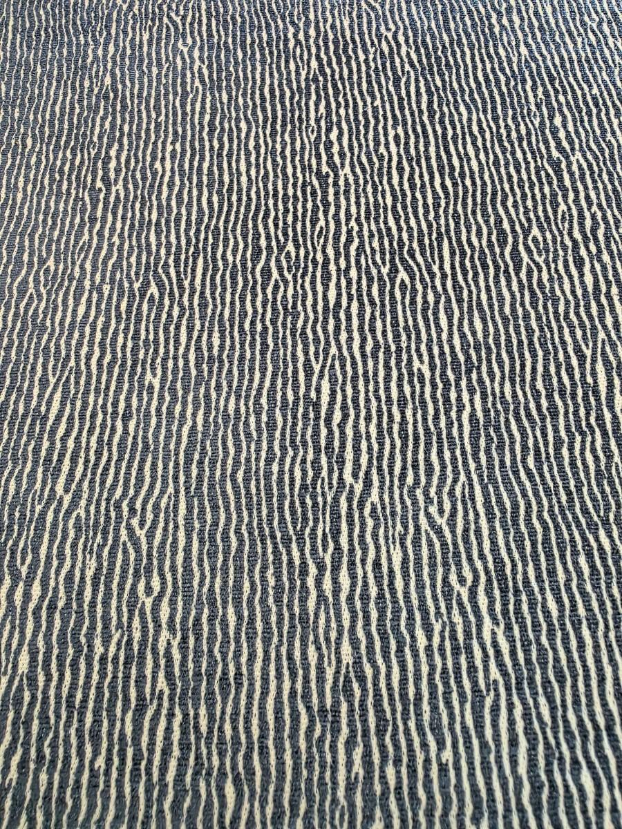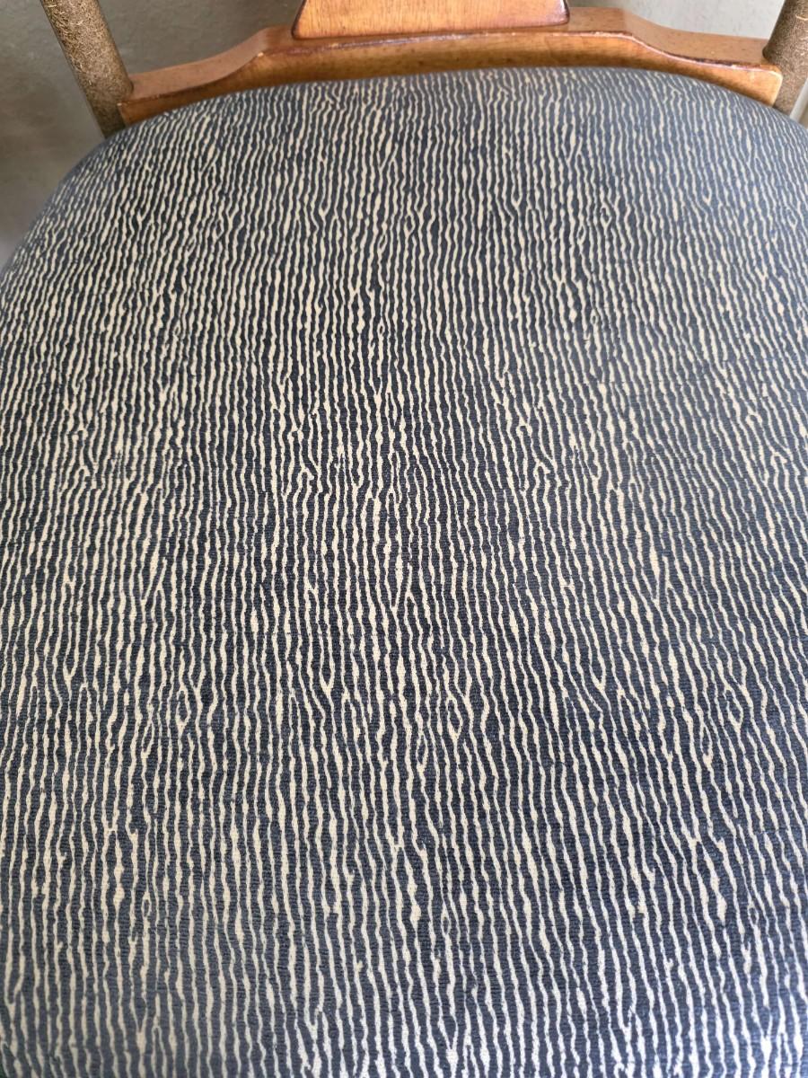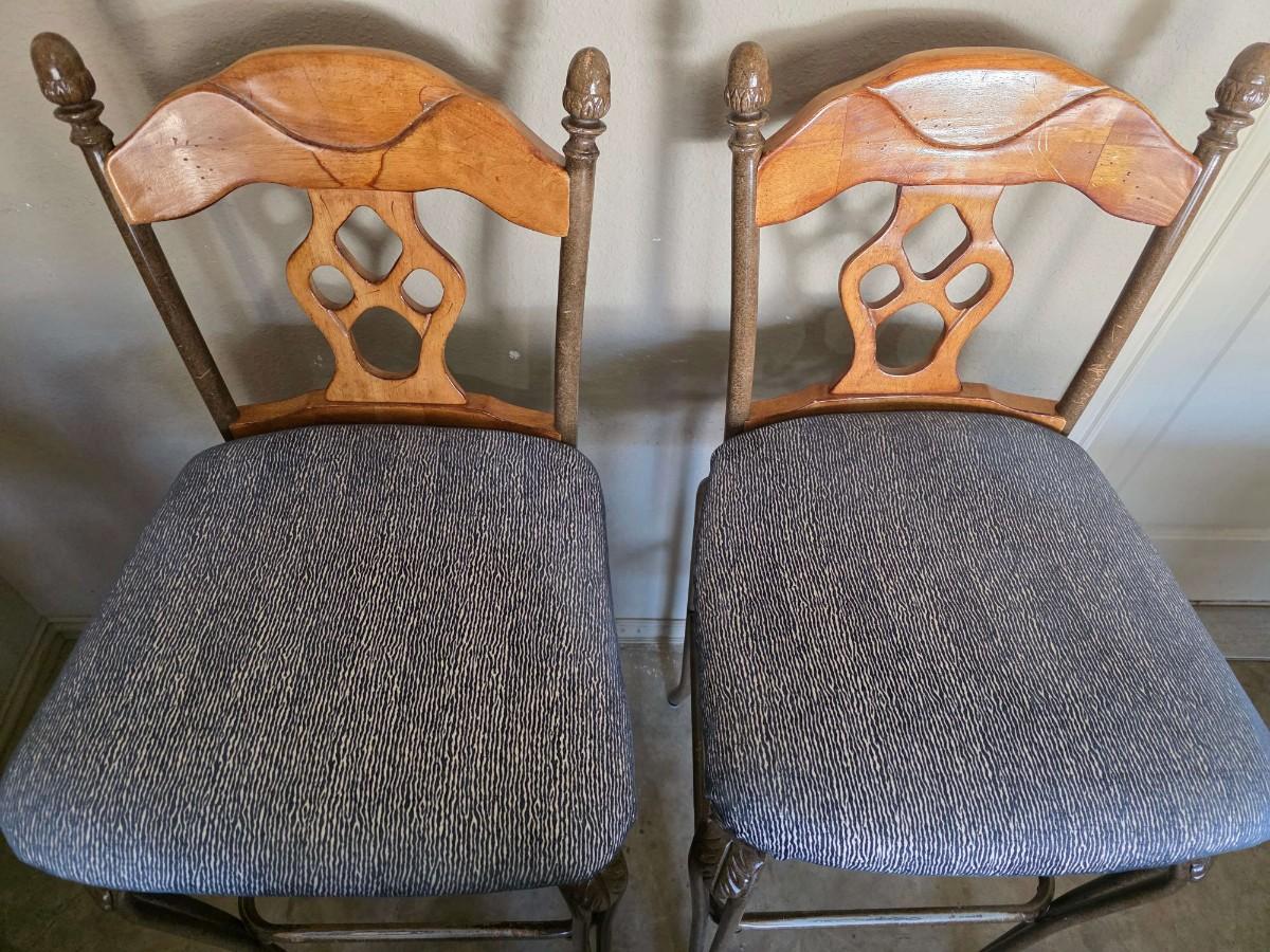 2 Tall Bar Stools, wrought iron and wood with navy upholstered seats. 20"L x 20"W x 46"H.