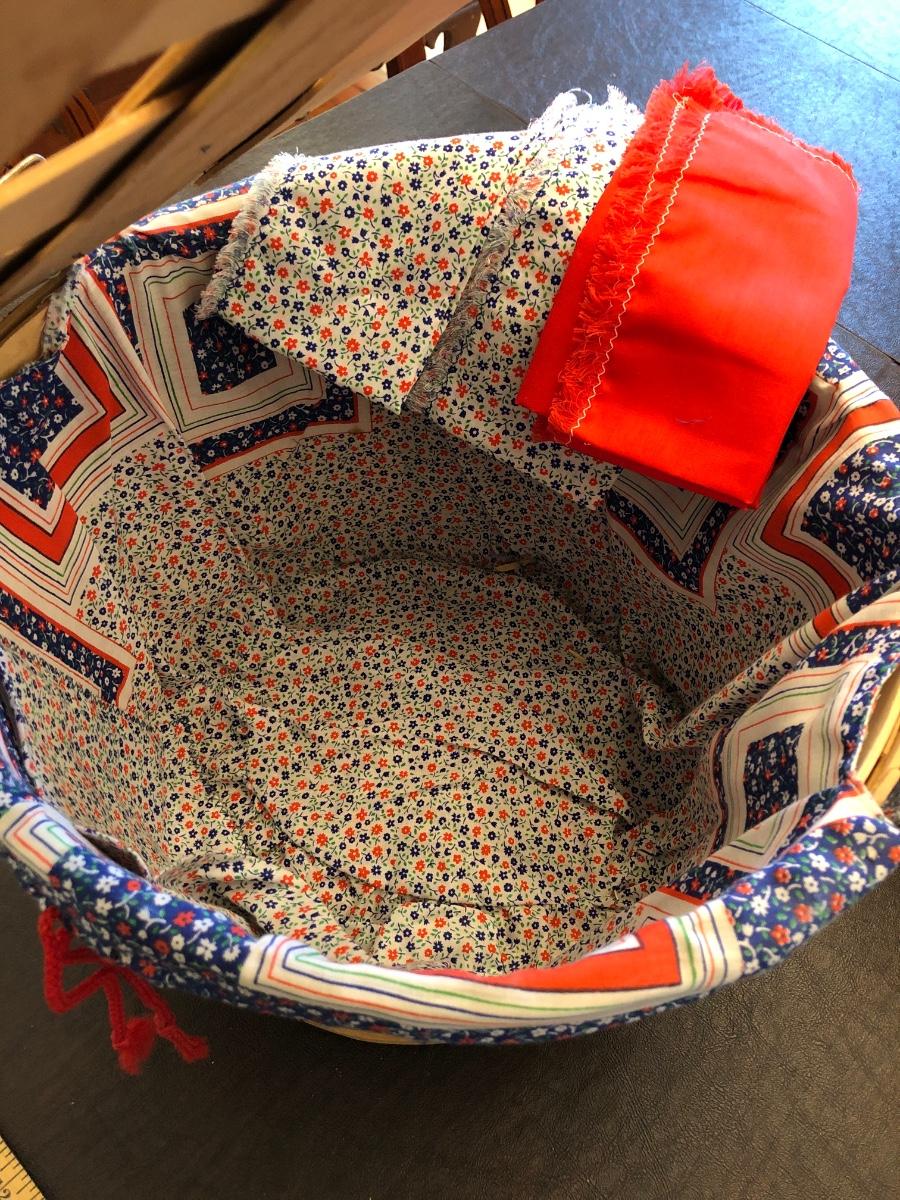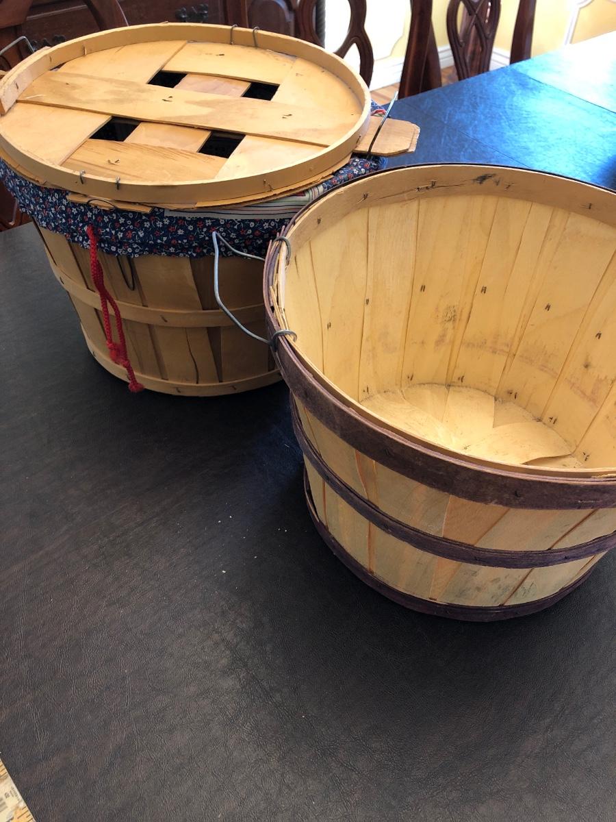 Lot of two apple baskets. One with lid, liner, and linens for picnic.