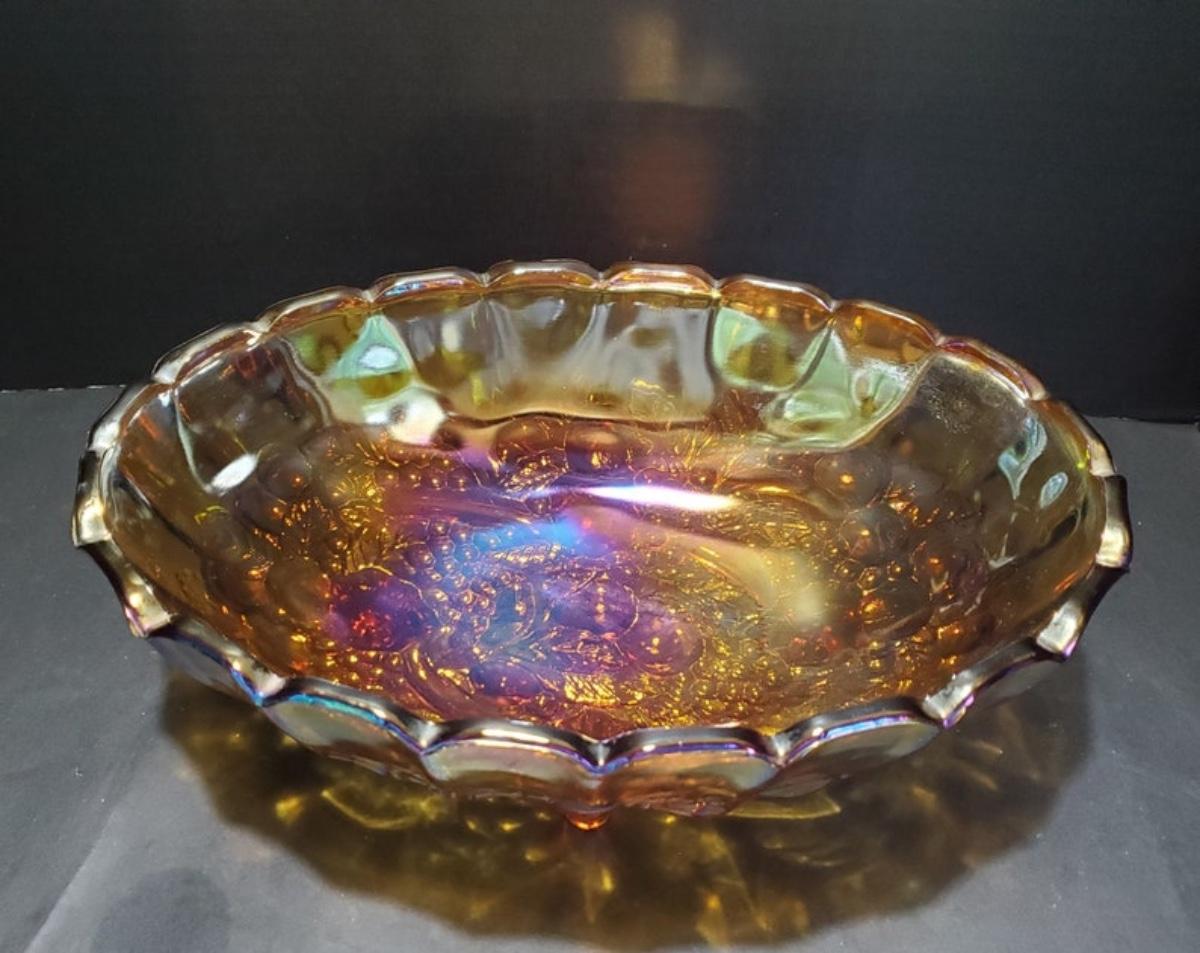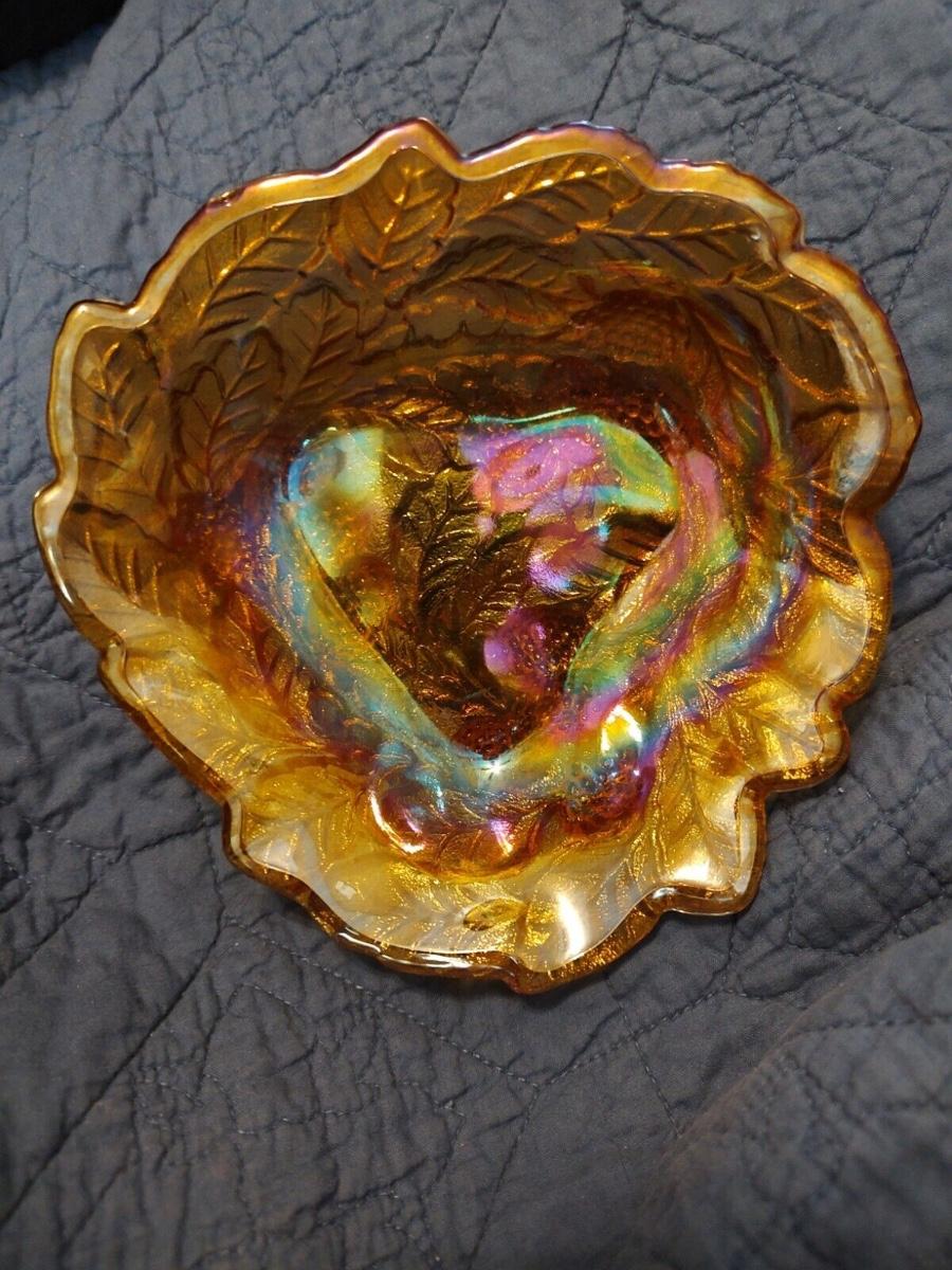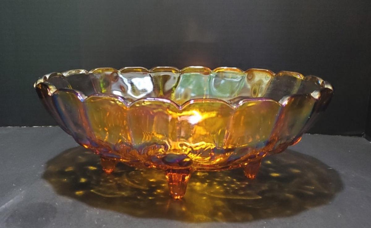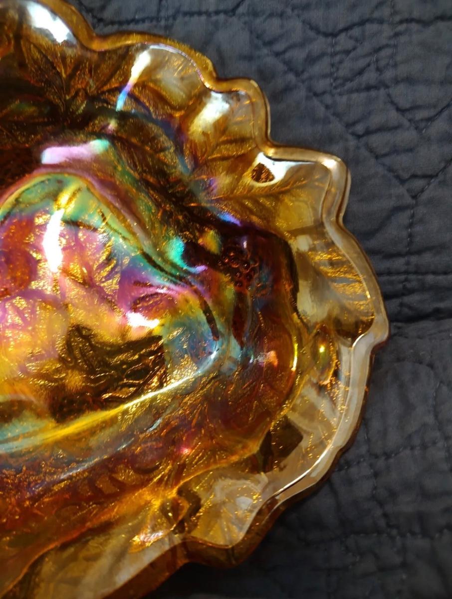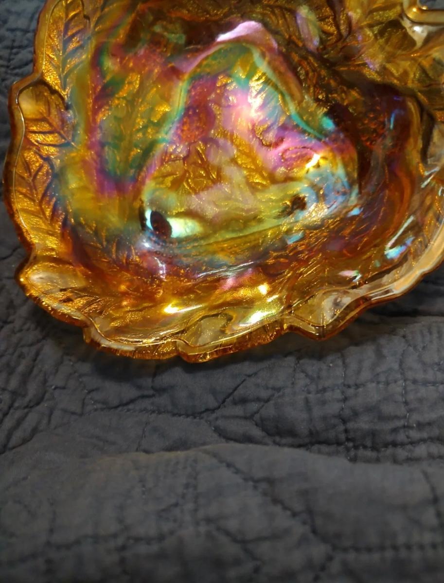 2 pieces of vintage carnival glass. I harvest bowl and a marigold triangular bowl. Very pretty.