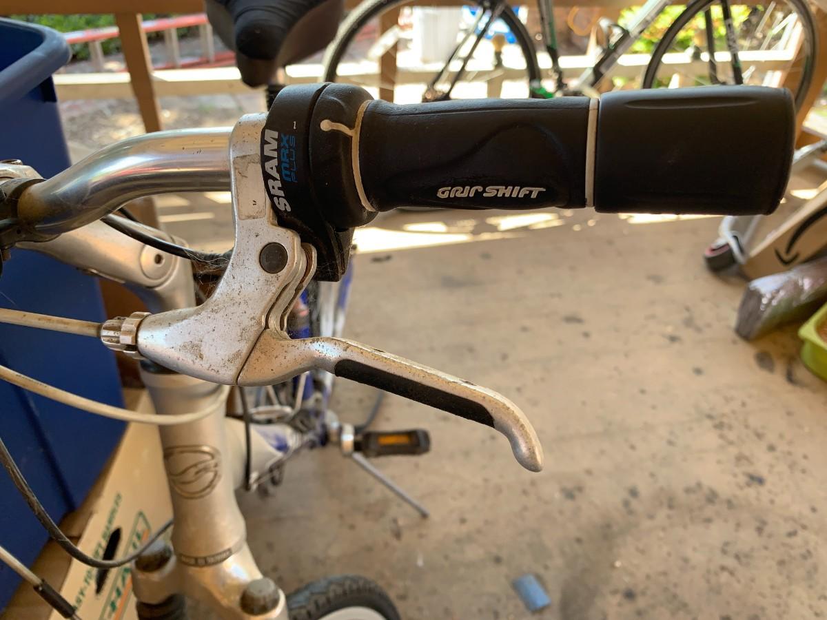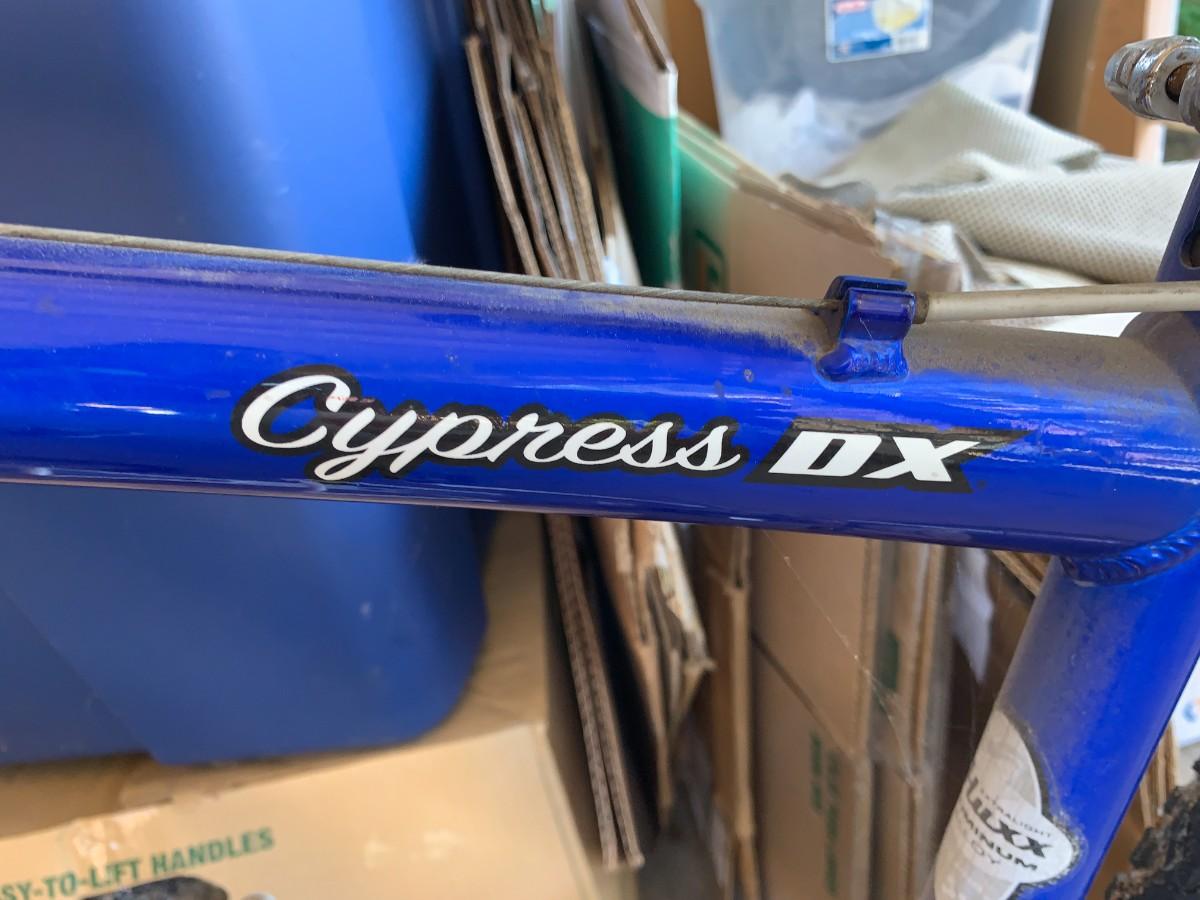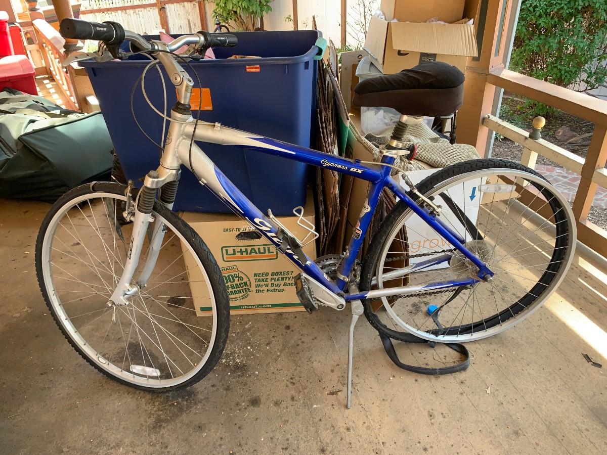 Giant hybrid bike, Cypress DX 19 inch frame. SRAM-MRX+ shifters. CT-COM2 TL7RST shock forks. Shimano Alivio derailleur. Standard pedals. Rusty quick release on both wheels, needs tubes. Shimano FHRM408 wheels. Ridden once.