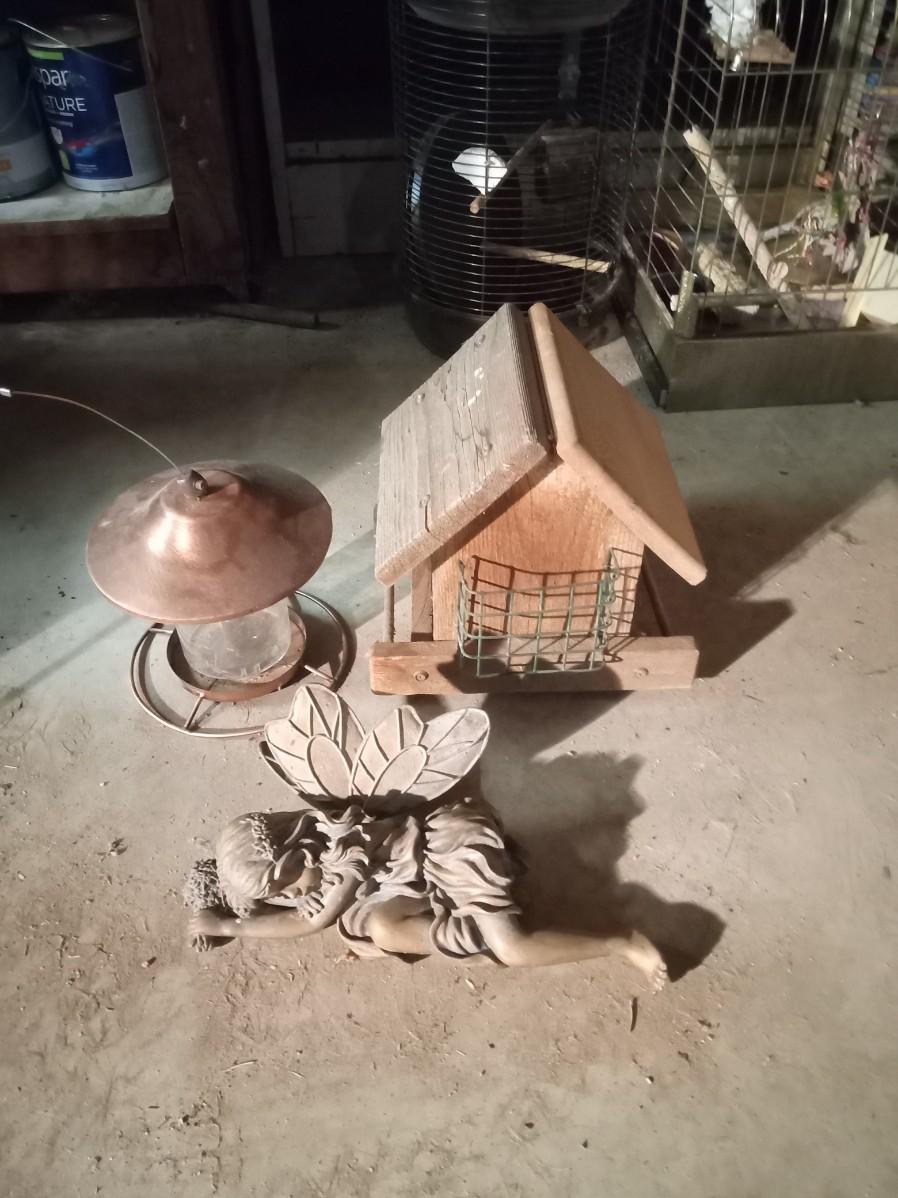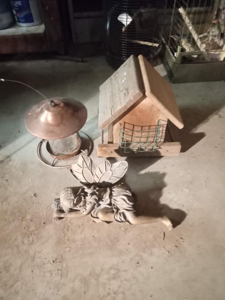 2 BIRD FEEDERS AND A SLEEPING FAIRY GARDEN DECOR