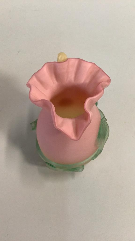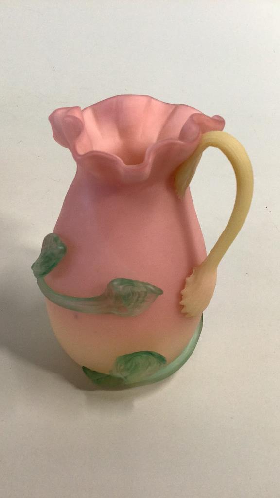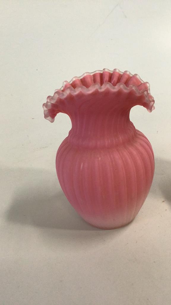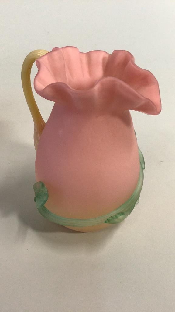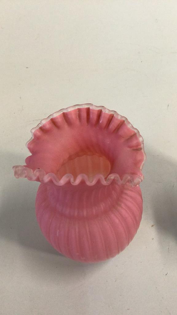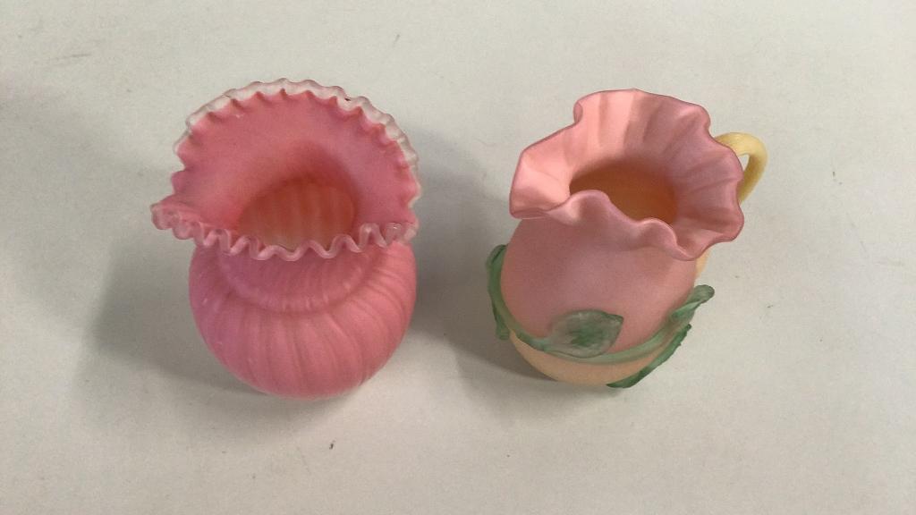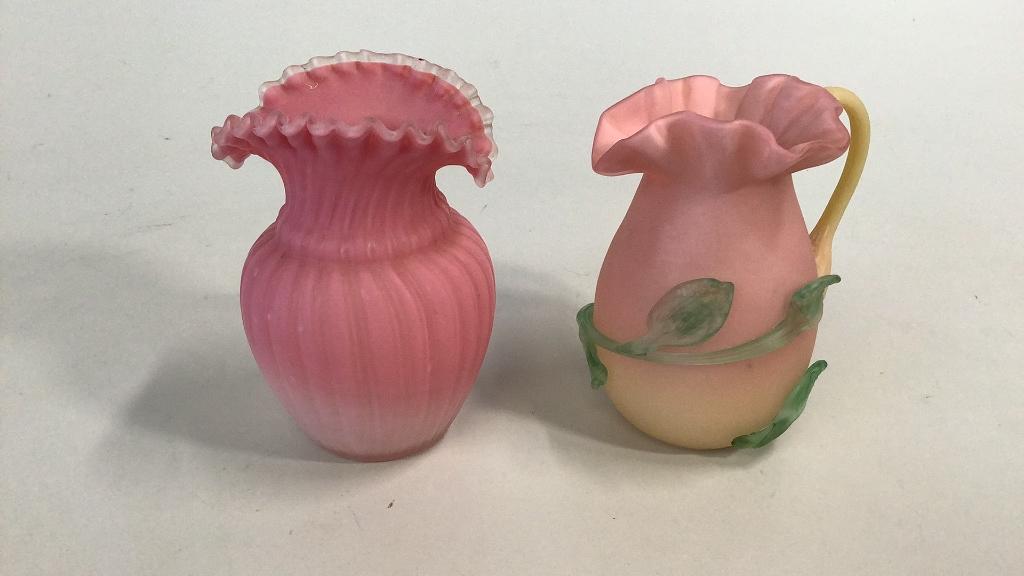 5.5 inch shaded opaque pink vase with ribbed body..crimped rimÂ…5 1/4 inch pitcher vase with Mt. Washington colors..pink to yellow, applied glass work vine to body, ribbed handleÂ…beautiful colorÂ….