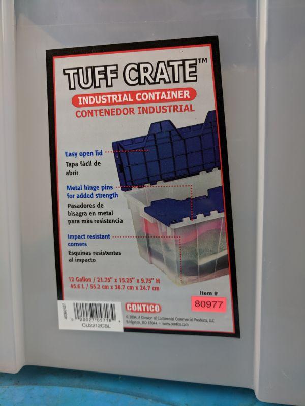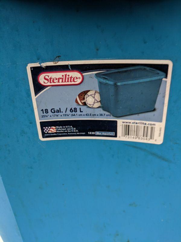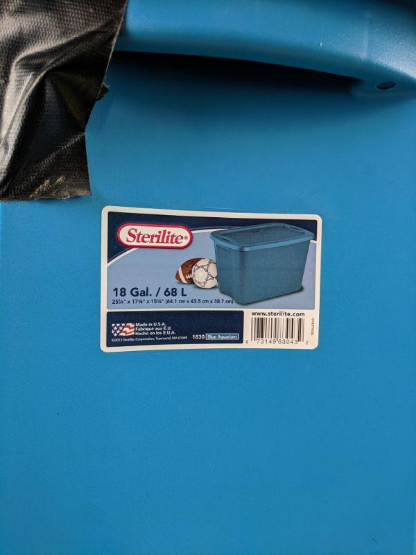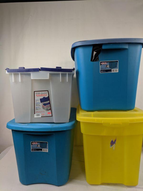 2 Blue 18 Gal Bins With Lids, 1 Yellow Bin WIth Lid, 1 Clear Bin WIth Lid 12 Gal