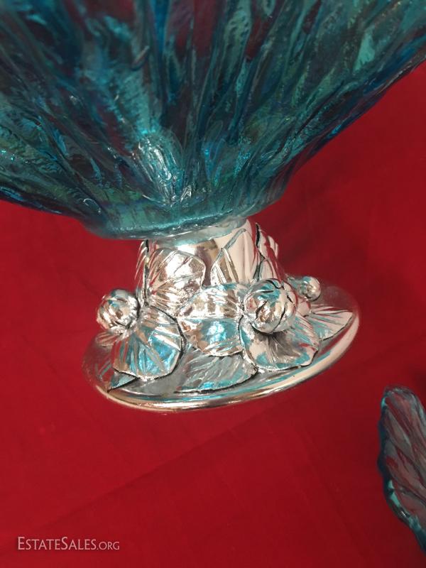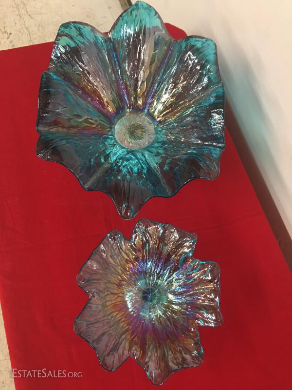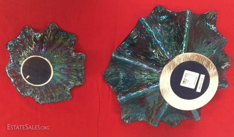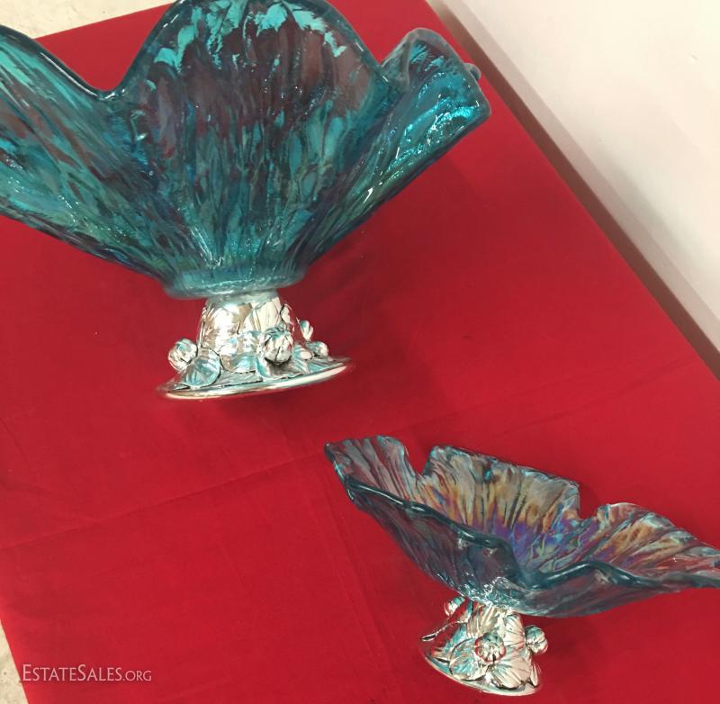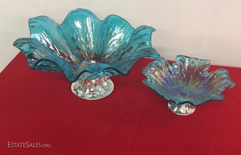 Bowls are in excellent condition no chips or cracks. Cast aluminum base, colored glass. Larger bowl measures 15" across.