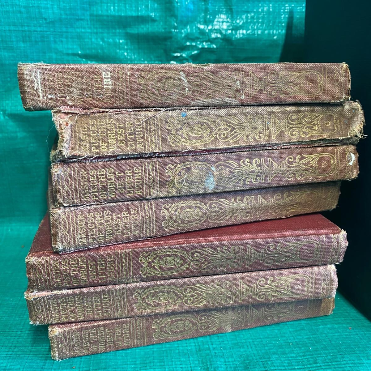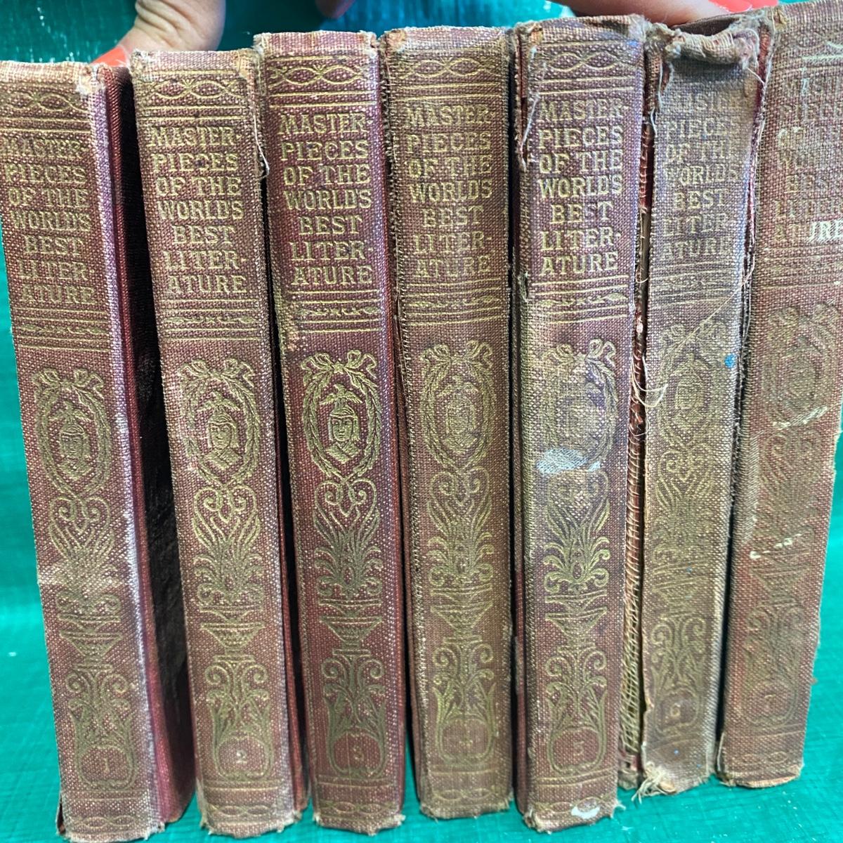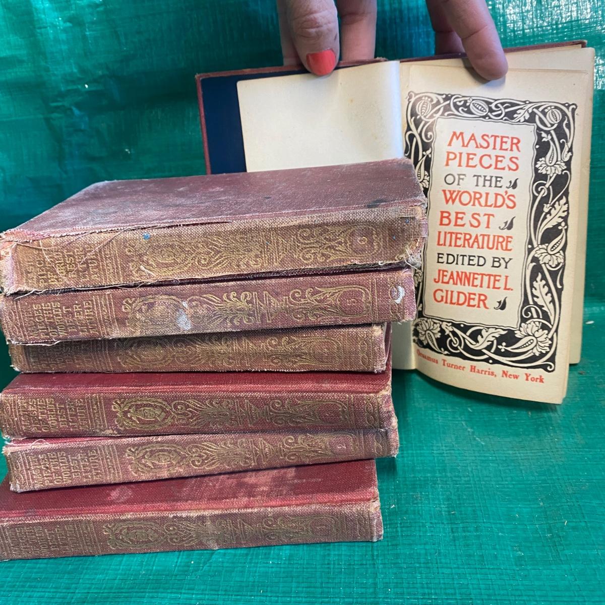 Two antique book sets. Includes A 1919 set of books by Richard Harding Davis. Six total - unsure if this is a complete set. Also includes small red book set of seven Masterpieces of The Worlds Best Literature. 1 thru 7 is included - unsure if it’s a complete set. Shipping available. All have some stains and yellow pages.