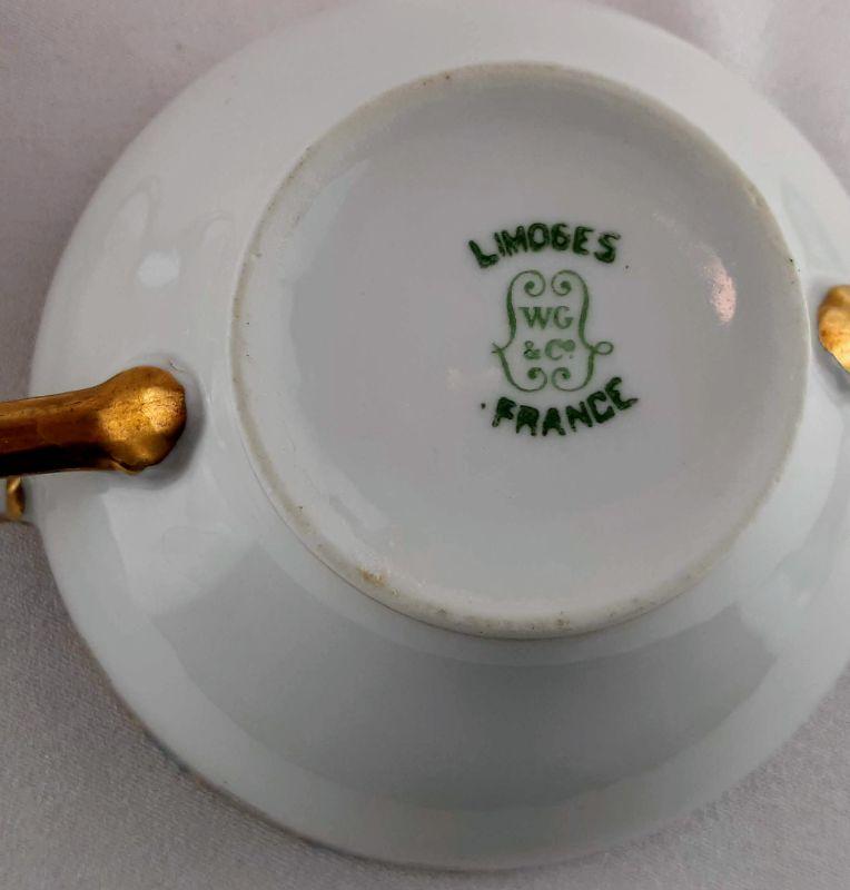 WG & Co. Limoges France. 3.75in. diameter. 2in. tall and 5in. handle to handle. One has a 4 arm spider crack that is surface only.
