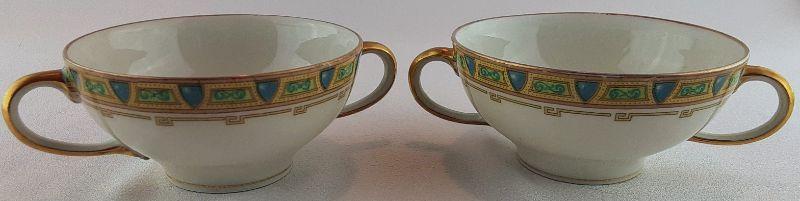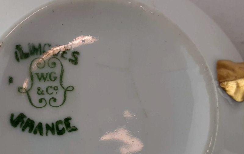 WG & Co. Limoges France. 3.75in. diameter. 2in. tall and 5in. handle to handle. One has a 4 arm spider crack that is surface only.