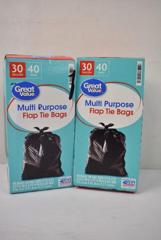 2 Boxes Great Value 30 Gal Multipurpose Large Flap Tie Trash Bag 40 ct Box - New