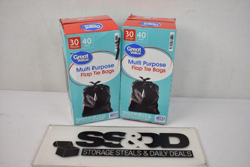 2 Boxes Great Value 30 Gallon Multi Purpose Large Flap Tie Trash Bags 40 ct Box - New