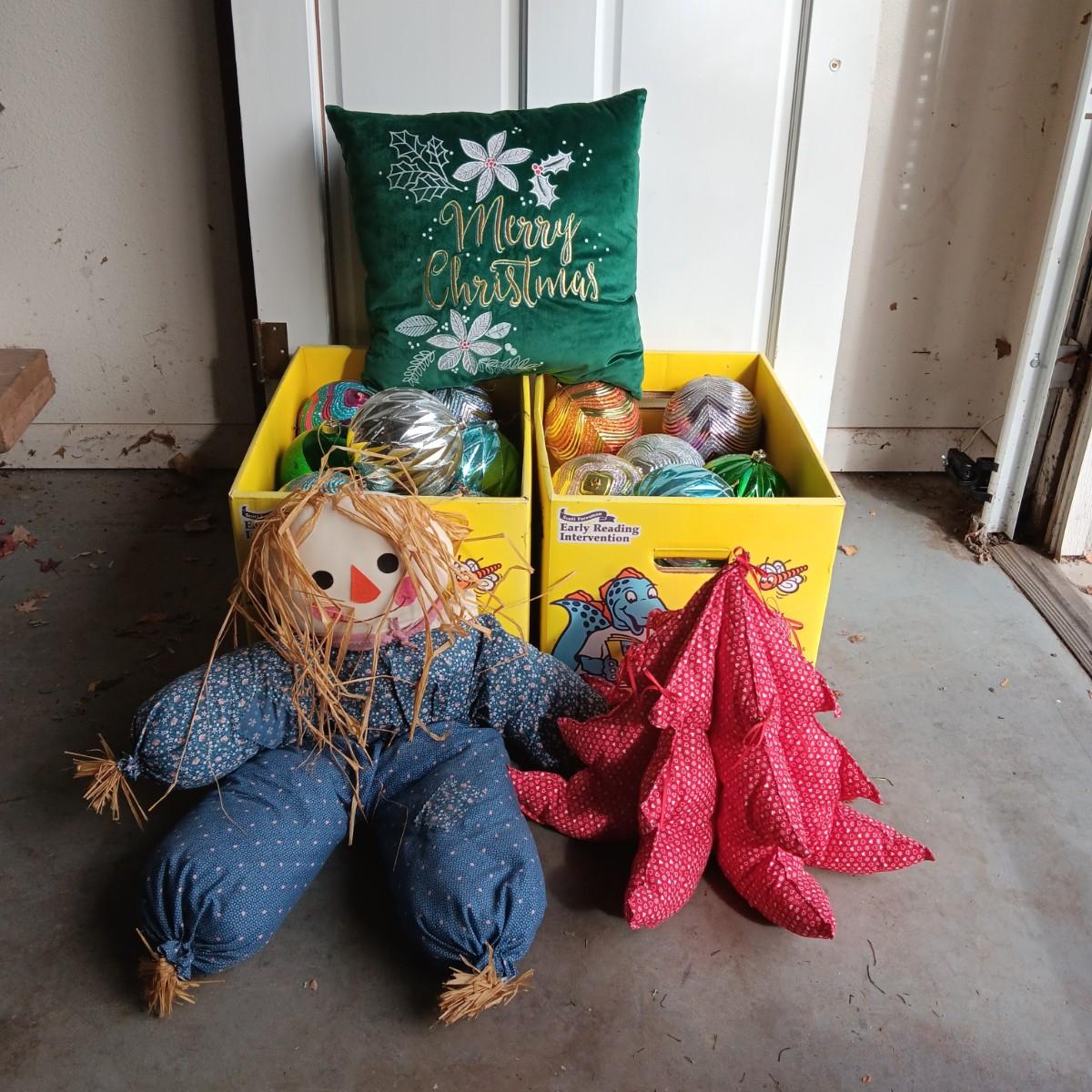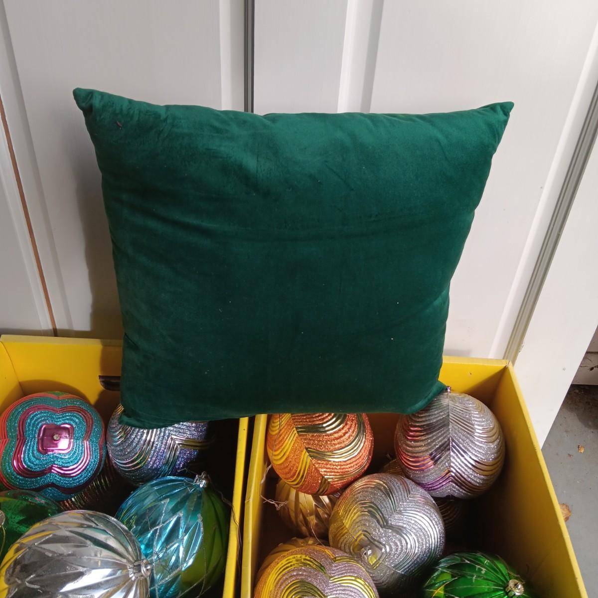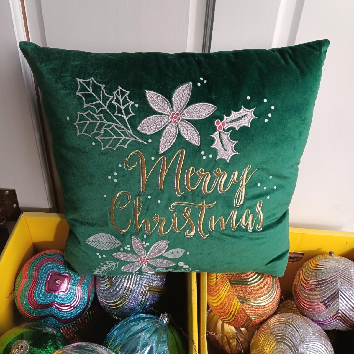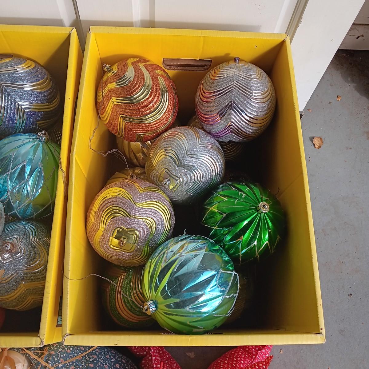2 BOXES OF 6 INCH ROUND ORNAMENTS, PLUSH DOLL AND TREE PLUS A THROW PILLOW