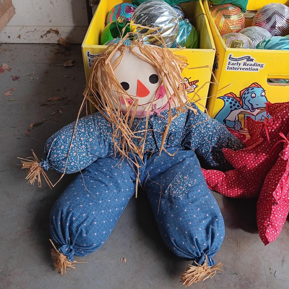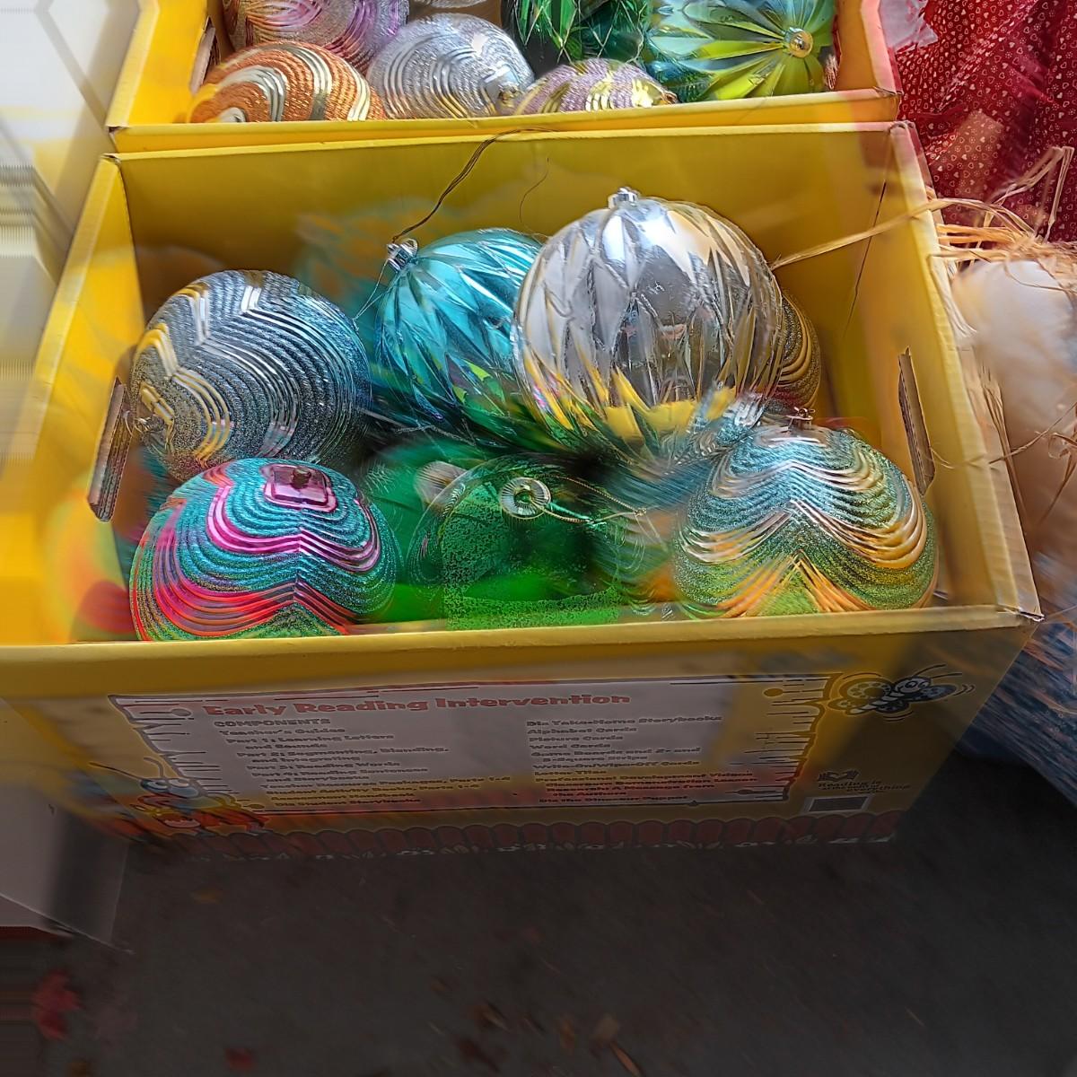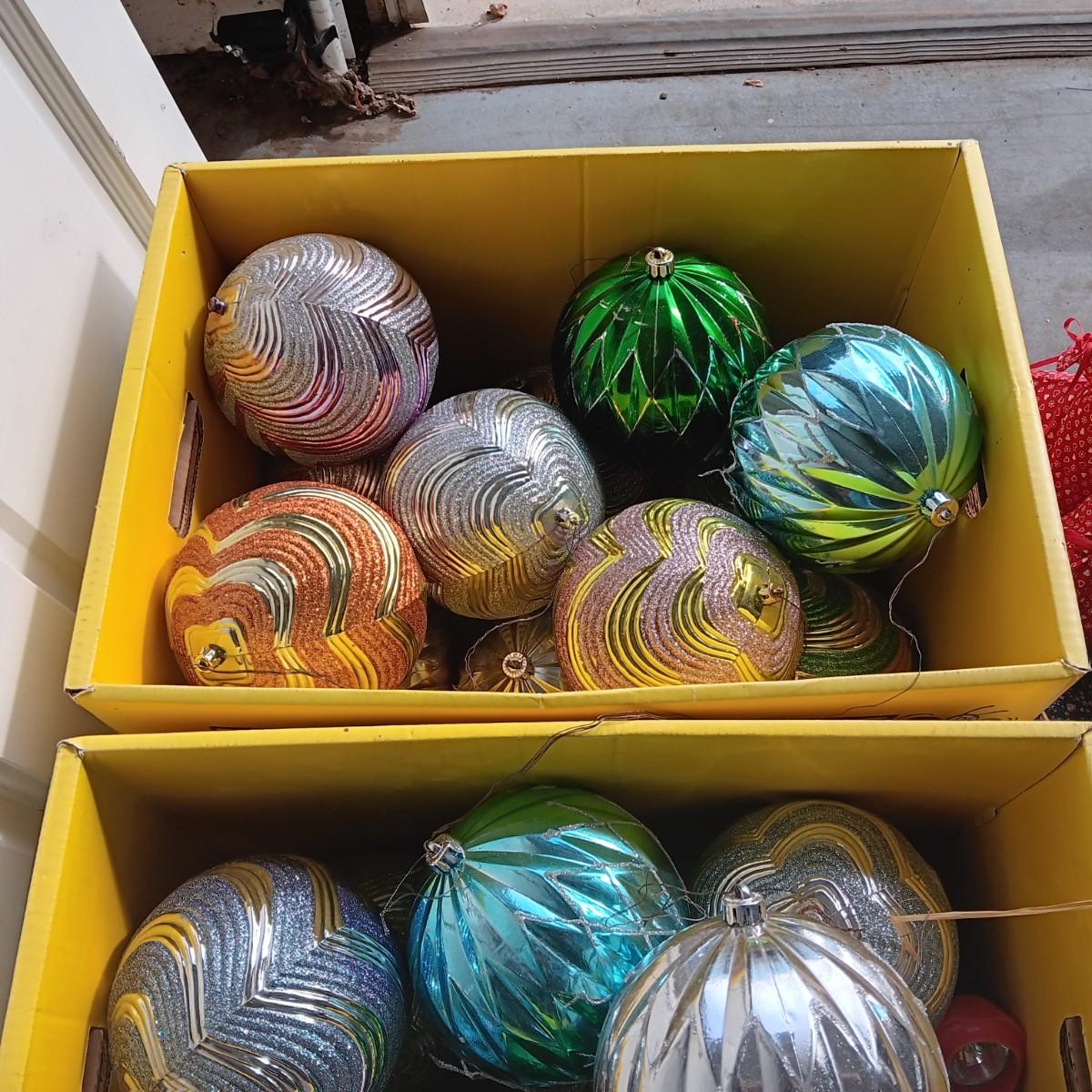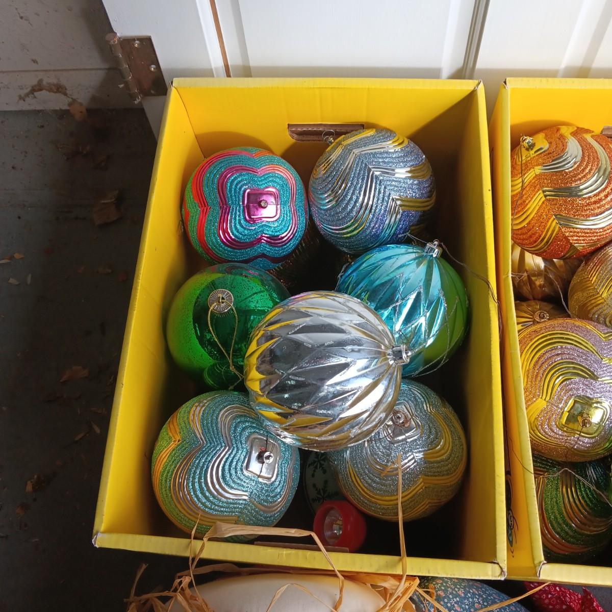 2 BOXES OF 6 INCH ROUND ORNAMENTS, PLUSH DOLL AND TREE PLUS A THROW PILLOW