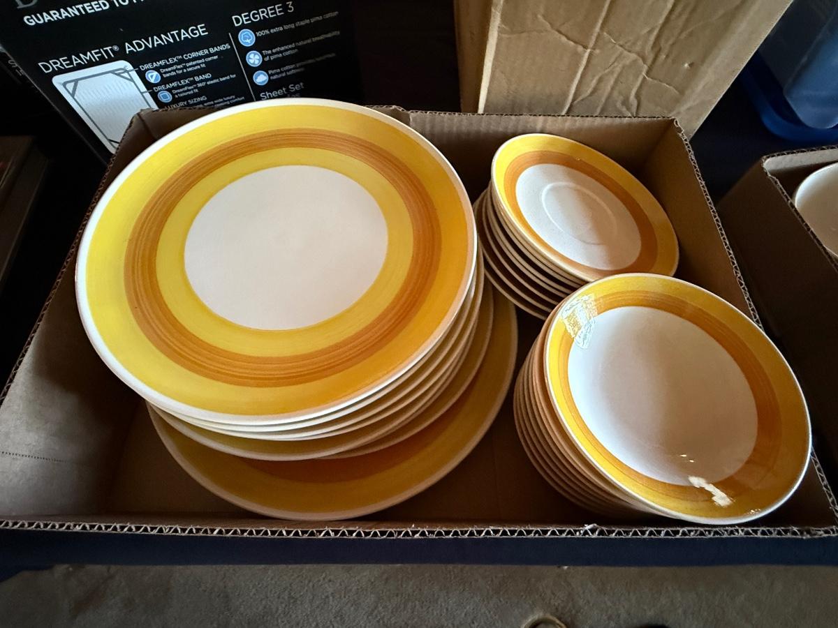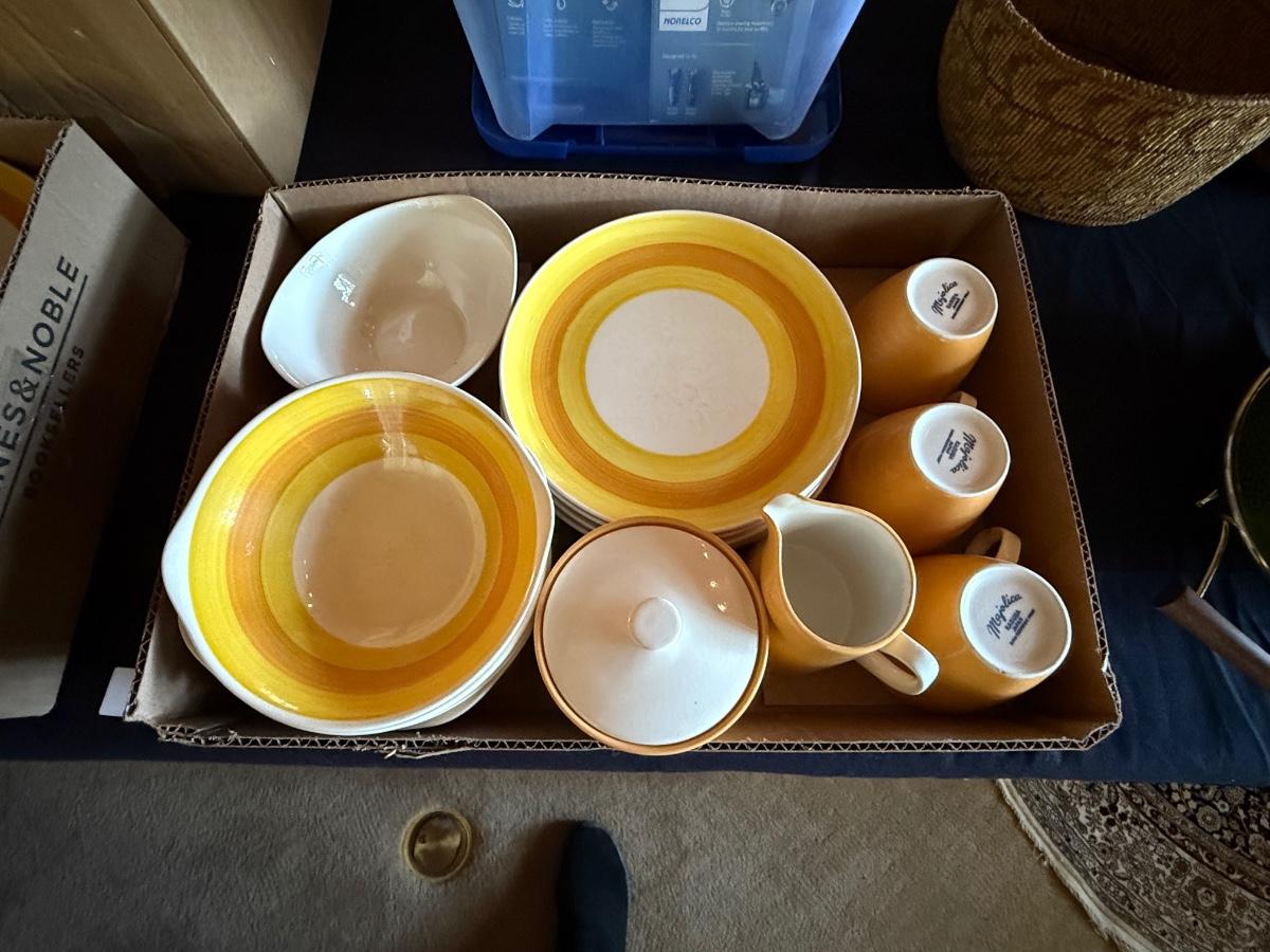 2 Boxes of Majolica Dishes - Plates, bowls, cup & saucers +