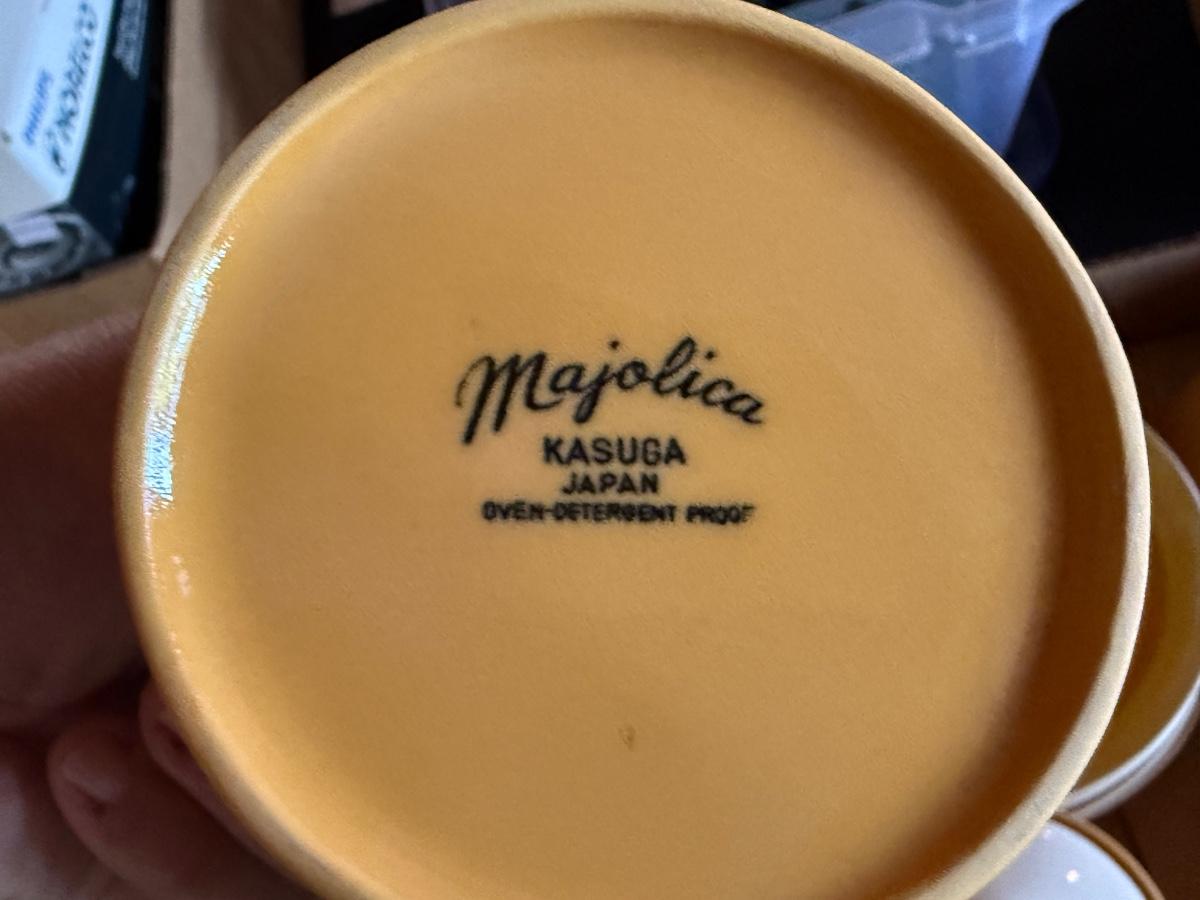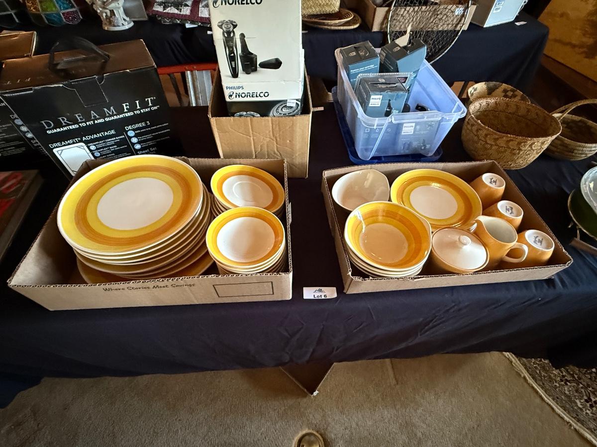 Orange/White/Yellow Kasuga Japan made Majolica ceramic China Set with all shown including various sized plates, bowls, cups & saucers, sugar & creamer +