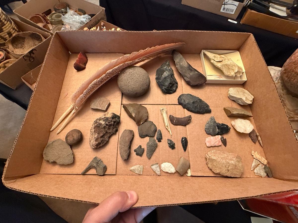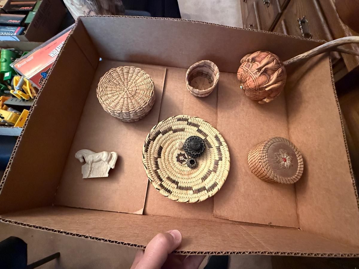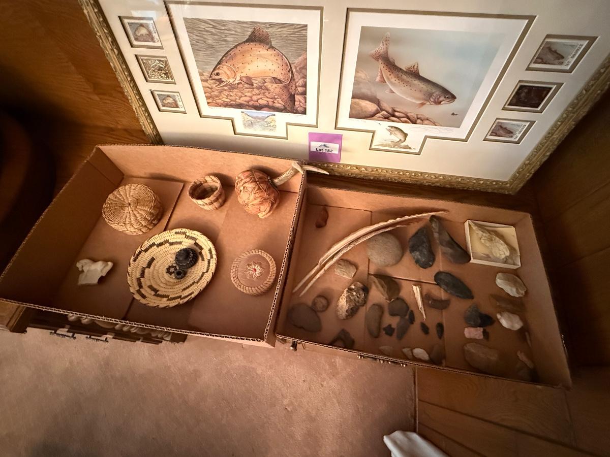 2 boxes of Native tools & small baskets, arrowheads +