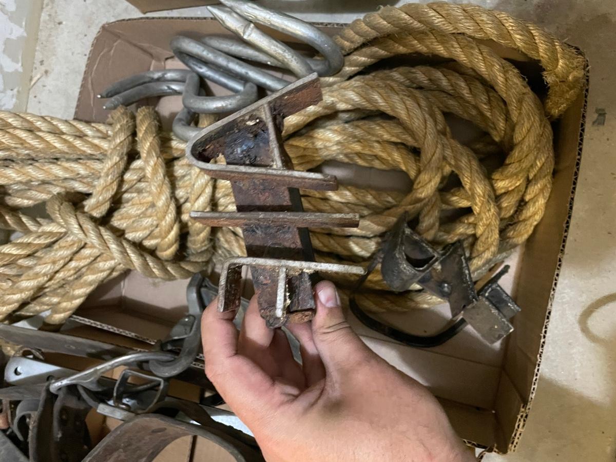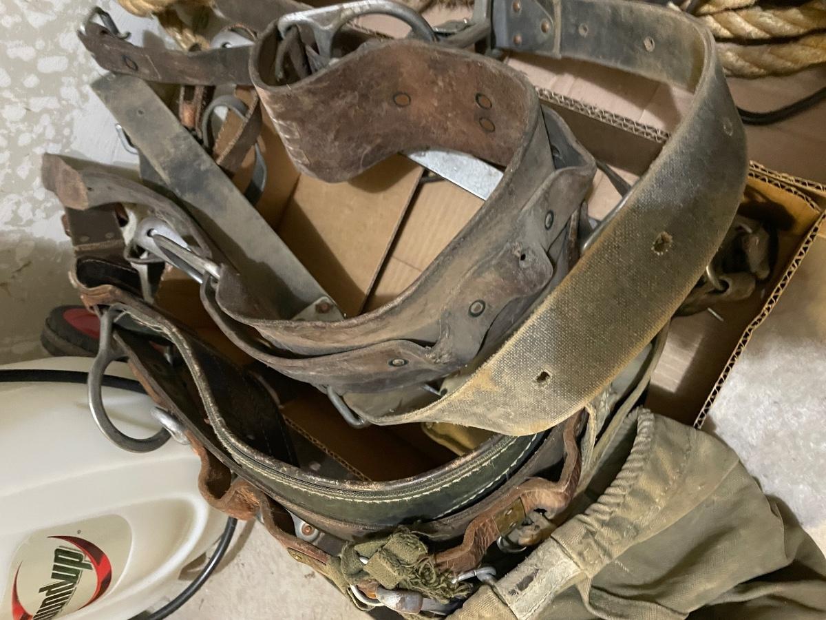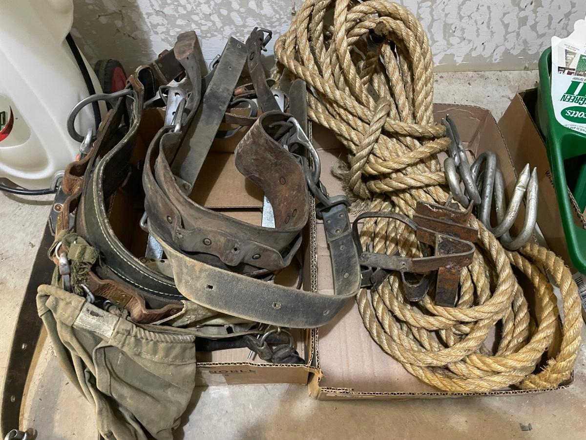2 Steel branding irons & Leather belt/safety harnesses/rope & caribeaners & all climbing tree equipment as shown