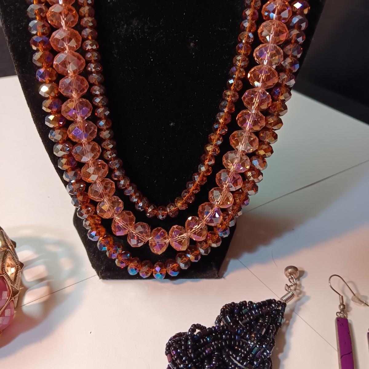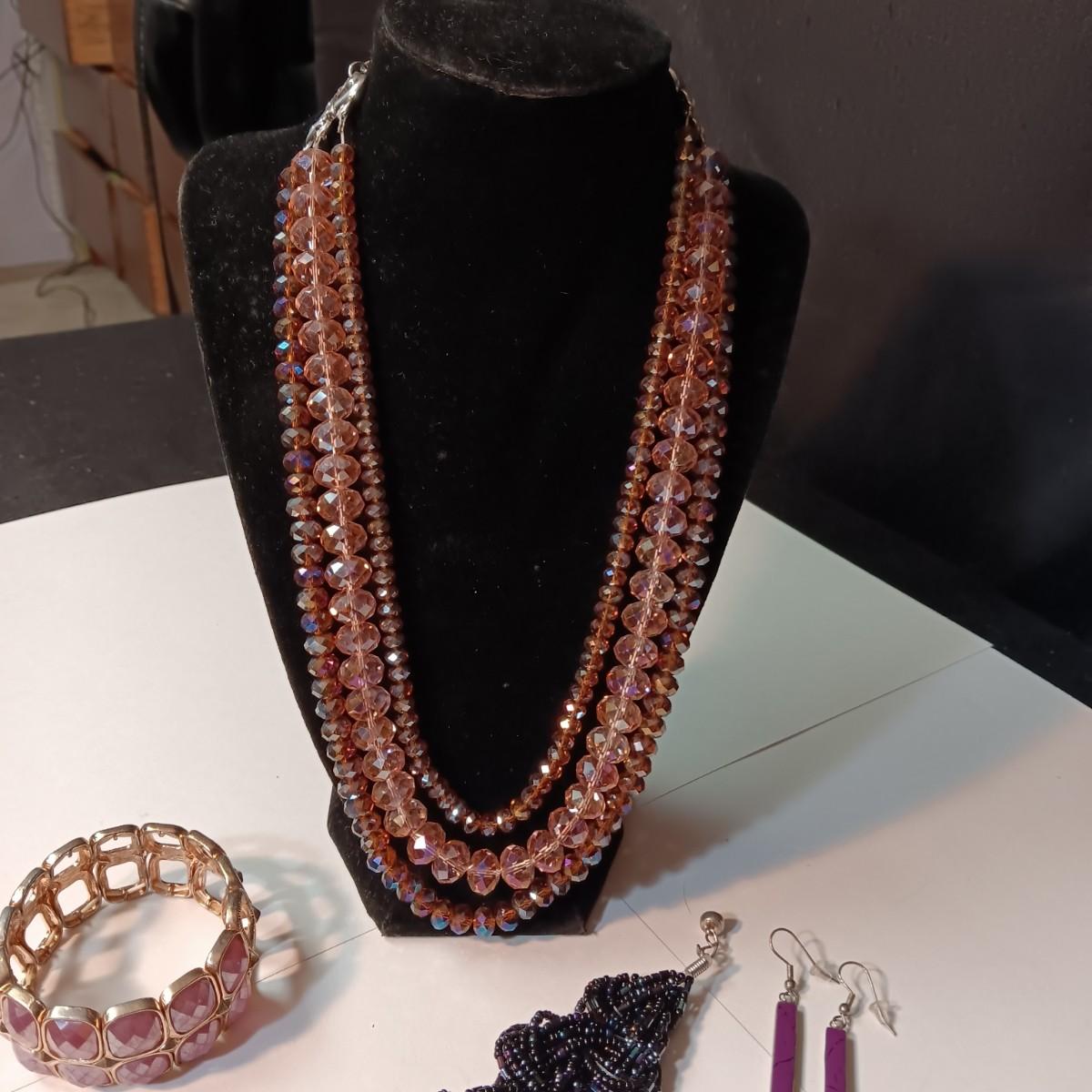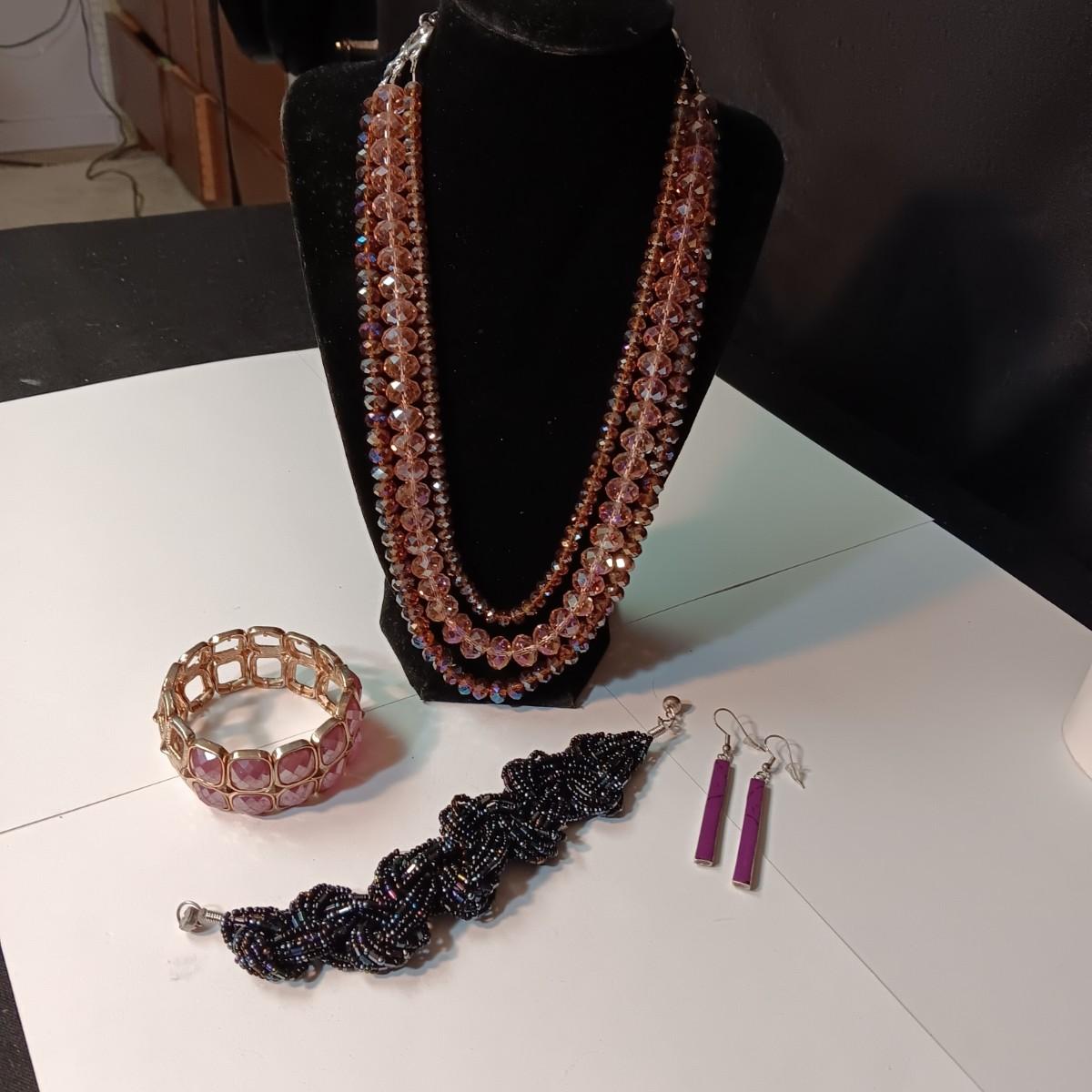 2 BRACELETS, GLASS BEADED NECKLACE AND EARRINGS